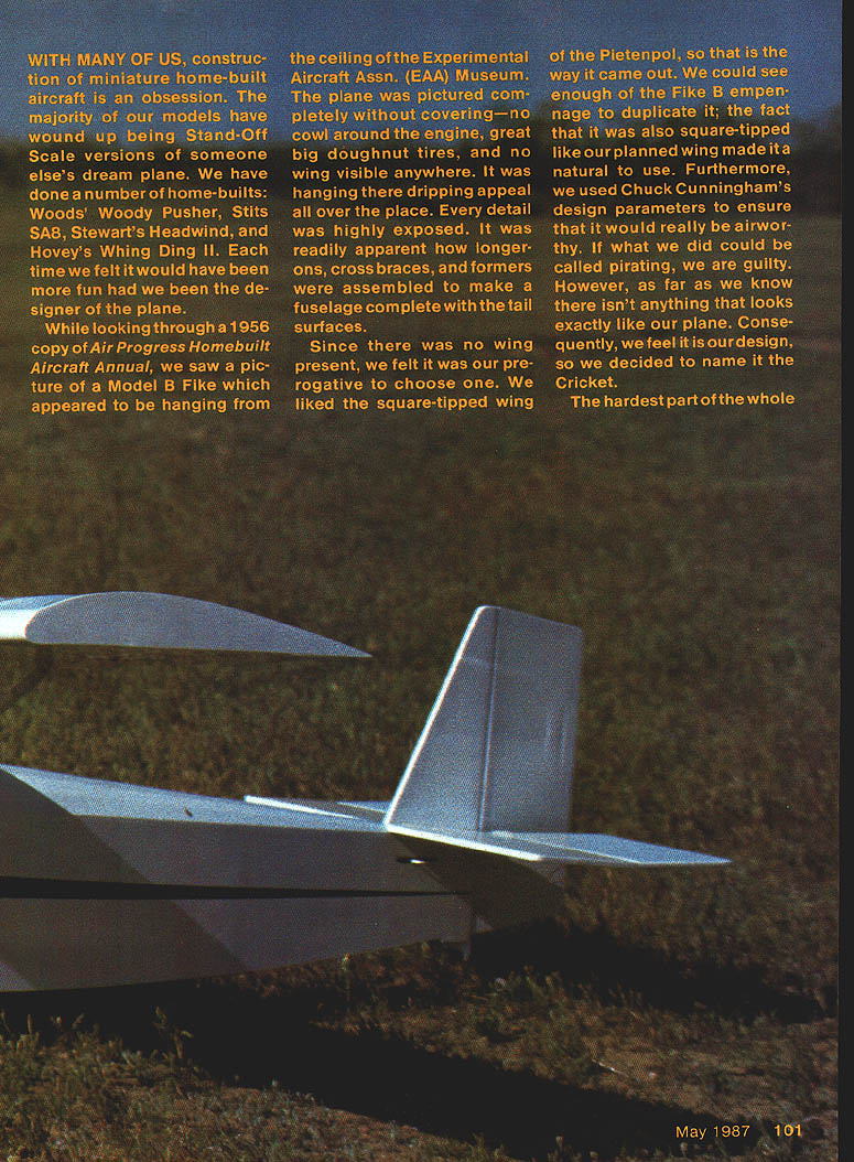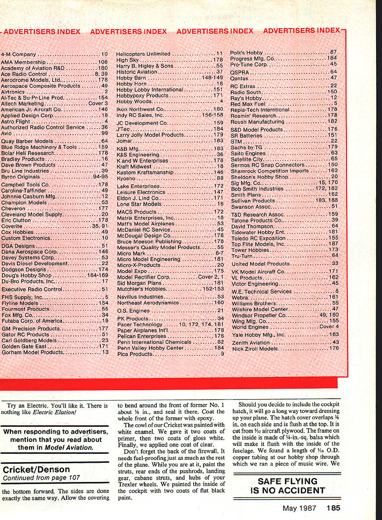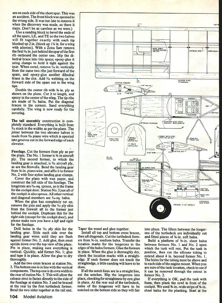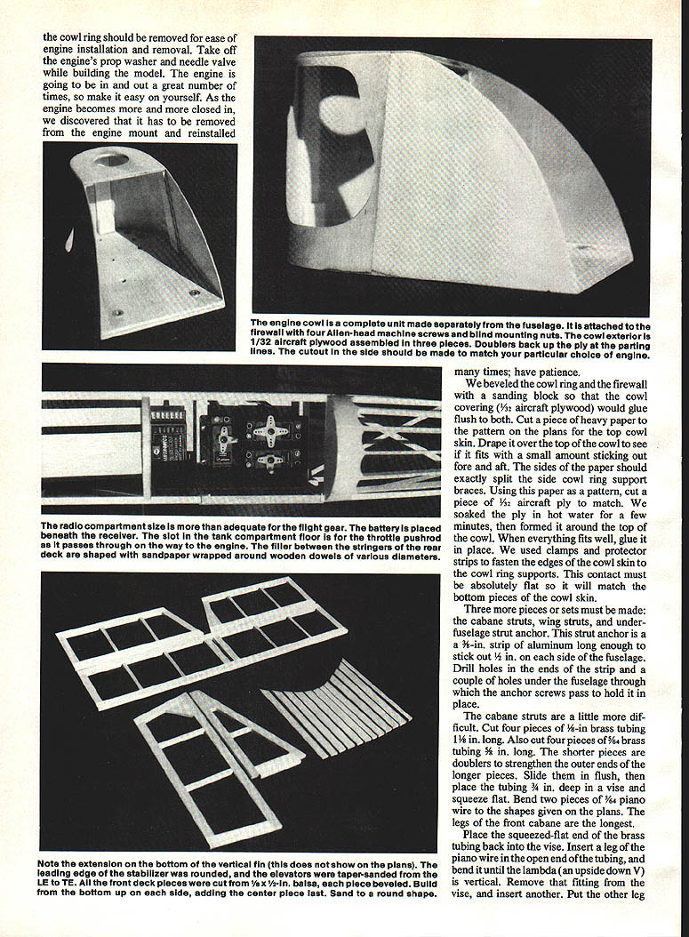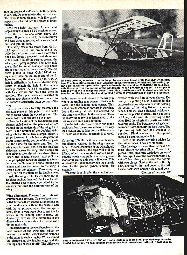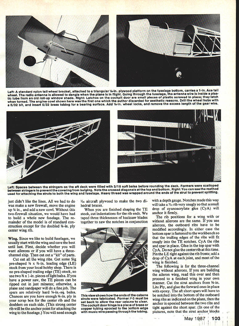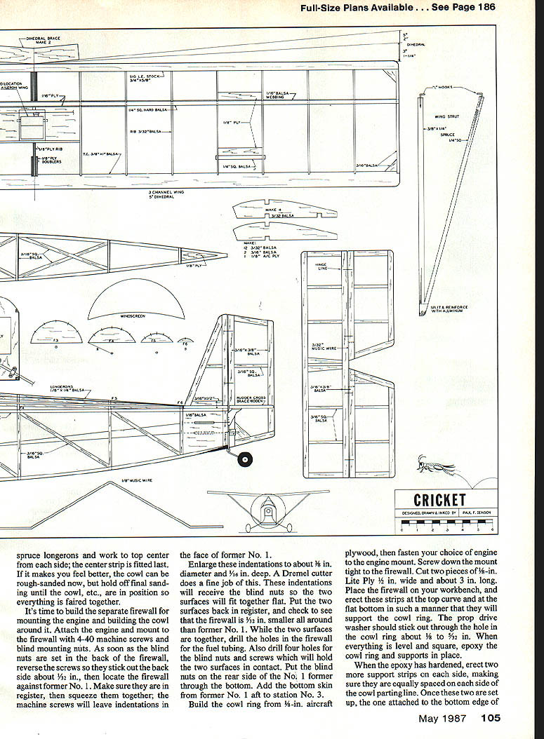 NO OCR TEXT NO OCR TEXT model design cowl old-timers small opposed-cylin der engines mounted high firewall cowling situation fairly easy engine Fike B Harle quin has two Harley Davidson motor cycle cylinders crankcase designed Les Long duplicate high location firewall model engine has mounted upside down 900 upright have seen problems inverted model engines avoid configu ration like plague choice mount engine horizontally standard mufflers will work Du-Bro Slimline similar will learned neat trick working Lou Proctor two firewalls better model built front former acting firewall whole cowl engine muffler ar ranged another firewall attaches first 4-40 machine screws decision blessing disguise first cowl discarded because Len lae Cockpit door allows easy access radio gear rear curve fuel tank exposed allowing observation wnuue Tilling Bezel Instrument panel cross sections cut various sizes brass tubing Right Silmilne muffler fits neatly alongside cowl throttle pushrod convenience passes under fuel tank has large Z-bend connecting throttle arm Left Trexier wneeis resemble wheels used old Model B Pike inspiration Cricket landing gear wire plans will fit both 3-and 31/2in Trexiers hubs different cut landing gearto size needed Right La screwed outer ends wing struts must doubled size small pieces inner pushrod material theywili fit securely under nylon landing gear clamps Before painting ends strut wrapped heavy thread sealed 5-mm epoxy 102 Model Aviation Airfoil old standby 15% Clark Y 8-in chord 48-in span means has aspect ratio 61 Atthe prototypes48-oz weight wing loading 1802/sq ft Engine installed lean 08 2Otwo-stroke Bymovingthe cowl ring forward slightly 2Ofour-stroke engine would excellent choice power plant photographs author Left A standard nylon tall wheel bracket attached triangular 1/a-ln plywood platform fuselage bottom carries 1-in Ace tall wheel radio antenna allowed dangle plane flight Going through fuselage antenna wire Inside plas tic tube old roil-up window shade Right Latches cockpit door smell pieces plastic screwed place latch turned engine cowl shown first author discarded aesthetic reasons Drill wheel hubs 5/32 bit insert 5/32 brass tubing bearing surface Add 1/s-in wheel locks remove excess length gear wire Left Spaces between stringers aft deck filled 3/16 soft balsa beforerounding deck Formers scalloped between stringers prevent covering bulging Note crossed diagonals top bottom Right can see method used attaching struts both wing fuselage Heavy thread wrapped around ends strut prevent splitting just didnt like lines make new firewall move engine up new cowl Without two-firewall situation would have build whole new fuselage re mainder model standard con struction except doubled -in ply center wing rib Wing Since like build fuselages usually start wing save best until last First decide whether will want ailerons will have threechannel ship cut out kit parts Cut out wing ribs Get some Sig pre-shaped 3/4 x %-in leading edge LE stock local hobby shop no pre-shaped tralling edge TE stock use two Ys x 1-in pieces light balsa have power saw TE pieces can ripped out just minutes otherwise plane sandpaper will fine job spars relatively hard -in-sq balsa Chances have enough -in ply scrap box center rib doublers side strong center rib will anchor point attaching wing fuselage will need enough 1/16 aircraft plywood make two di hedral braces finished shaping TE stock cut indentations rib ends taped three thicknesses hacksaw blades together saw notches conjunction depth gauge Notches made way will take 3/ rib very snugly small drop cyanoacrylate glue CyA will anchor firmly rib positions wing ailerons same use ailerons outboard ribs have modified accordingly either case bottom spar fastened workbench trailing edges ribs will fit snugly TE notches CyA ribs spar place Glue top spar CyA glue center rib time Pin LE tight against rib fronts add drop CyA joint wing finished following three-channel wing ailerons building aileron wing read over proceed finished wing own manner Cut strut anchors -in Lite Ply glue forward ones place epoxy aft short spars will have notched bottom outboard wing ribs indicated plans anchor epoxied between two ribs tight against short spar pictures note strut anchor blocks May 1q87 103 view shows ends cabana struts fabricated Former P-3 must set back allow rear cabne clear cockpit door hinge isa piece brass copper tubing epoxied bottom edge music wire passing through tubing side short spar accident front block epoxied wrong side too late remove discovery made stays Dont careless Use sanding block bevel ends spars LE TE two halves will fit together exactly tip blocked up 2 block up 1 wing ailerons Zona Saw remove first /16 injust behind spar first rib outboard center Slip di hedral brace space epoxy-glue using clamps hold tight against spar cured remove 1/16 vertically same two ribs just forward spars epoxy-glue another dihedral brace slot Add V16 webbing forward side spars out wing tips Double center rib -in ply shown plans Cut length epoxy center wing tip ribs made /6 balsa Put diagonal braces corners Sand everything c&efully wing now ready covering tail assembly construction com pletely standard Everything built 46 stock widths per plans joiner between two elevator halves made %4 piano wire epoxied grooves cut forward edge elevator Fuselage Cut formers ply per plans No 1 former -in aircraft ply second former landing gear attached /16 aircraft ply firewalls Bend landing gear -in piano wire affix former No 2 four nylon landing gear clamps Cover plans wax paper construct left side fuselage longerons 6-sq spruce frame cockpit door Station Nol 3just aft cockpit also spruce other vertical diagonal members 3/16-sq balsa glue has completely set up remove pins apply V32 ply skin firewall aft former just behind cockpit Duplicate right side except cockpit door please make sure have left right fuselage Drill holes A2 ply skin landing gear Slide side over landing gear wires