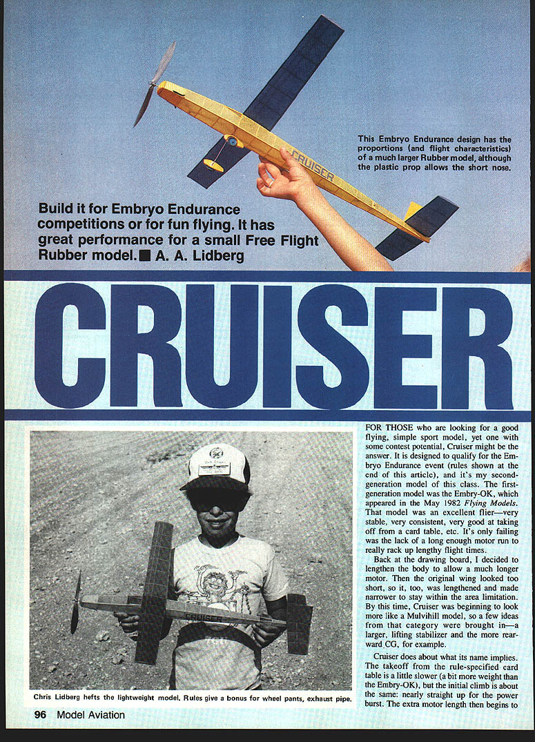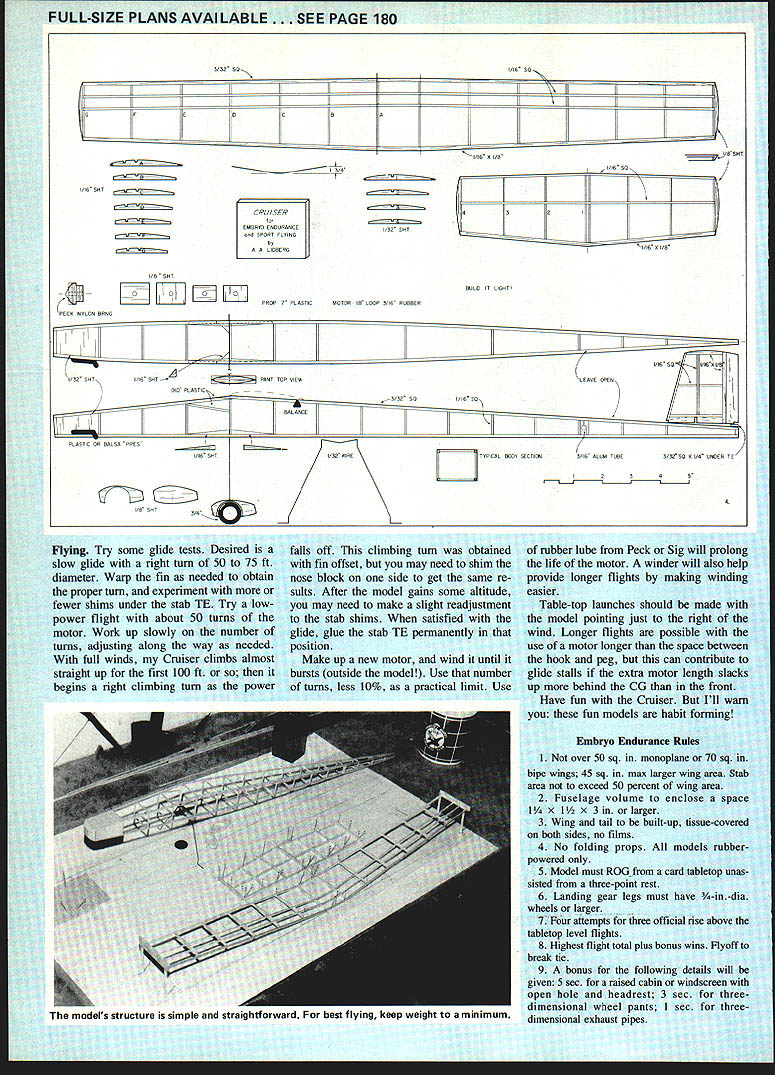 Will &c IUUK1il iur guuu flying simple sport model yet some contest potential Cruiser might answer designed qualify Em bryo Endurance event rules shown end article its secondgeneration model class firstgeneration model Embry-OK appeared May 1982 Flying Models model excellent fliervery stable very consistent very good taking off card table etc Its failing lack long enough motor run really rack up lengthy flight times Back drawing board decided lengthen body allow much longer motor original wing looked too short too lengthened made narrower stay within area limitation time Cruiser beginning look like Mulvihill model few ideas category brought ina larger lifting stabilizer rear ward CG example Cruiser does about what its name implies takeoff rule-specified card table little slower bit weight Embry-OK initial climb about same nearly straight up power burst extra motor length begins 96 Model Aviation Chris Lidberg hefts lightweight model Rules give bonus wheel pants exhaust pipe show its value motor run lasts quite bit longer glide improved aft CG lifting stab allows Cruiser glide slowly longer fairly large model Embryo youll want careful use very lightest wood Pass up hard pieces piece slightly harder heavier wood should 3A2 sq wing leading edge LE piece must take some hard knocks pick accordingly Flying surfaces Begin wing Trace out ribs using favorite method Mine xerox rib drawings use household iron applied back photocopy transfer impression ribs sheet woodinstant printwood Lay out pin down wing LE trailing edge TE Its bit easier preshape TE using sanding block fore its pinned down Fit glue ribs place leaving out spars ribs now Raise tips dihedral shown sand mating edges LE TE tight-fitting glue joint Glue together add ribs spars building stab make sure allow /16-in space center fin fin just simple flat structure square sheet scraps Fuselage Build two identical sides deceptively simple statement has probably written thousands times yet task involved really easy couple methods can help 1 Build second side directly over first method isnt bad because pins havent moved first-side pieces serve good guides placement second-side pieces However two sides will glued other joints thin knife razor blade must used separate after sanding block should used smooth glue joints 2 My favorite method begin carefully placed row closely spaced pins around outer edges fuselage side drawing Pins also placed left side vertical piece pins should pushed board nearly vertical possible longerons long pieces put place clamped against outside pins additional pins verti cal piece put glue dries clamping pins removed side carefully pried board second side built sanding block should used smooth away glue bumps Assemble two sides usual box shape pinning over top view Add crosspieces use drafting triangle carpenters square keep sides vertical Bend landing gear LG glue place Add LG gussets two front two back two bottom Add sheet fill-in nose back rubber peg Laminate nose block making sure its tight fit fuse lage opening Drill Peck-Polymers bearing add prop shaft prop Mark top nose block will always positioned same way Cut out parts wheel pants glue LG after shaping sanding Sand model carefully get rid lumps bumps Cover lightweight brightly colored tissue Lightly water-spray tissue shrink apply two coats very thin dope-either nitrate little castor oil mixed use Sig Litecote Add tissue trim windshield side win dows name address phone number wheel pants nose block can colored highlight marker match tissue Make exhaust pipes balsa plastic tubing Assemble model making sure incidence block about /32 high un der stab TE Tack glue stab body its LE will allow adding subtracting thickness block needed glide adjustment Pin TE down now Check wing stabi lizer warps panel should flat necessary use steam heat electric stove burner removing warps Install rubber motor check bal ance point use small bits lead clay fore aft needed bring balance point correct position April 1984 97 Table Cruiser will take OTT Trom can also support winding stoogeas used author stooge really neat cant find helper hold model Shes off Chris stance wed say didnt push bit model nice size fun flying relatively small field No propcarving bugaboo either uses ready-made plastic FULL-SIZE PLANS AVAILABLE. SEE PAGE 180 Y/32 SO IIII IILI 1516 B OR US SHY 1516 55 IADDoILfIIWI IiIIIIHiiIII 32 SHY K PECK NYLON BRNU 53 SHY K OPIC 18 SRT P7flw7 MOTOR lB COOP 3/ U RUBBER DUNUI IO&SA I/IN OTTPAST TOP DIEWLEBUE OPEN 3500 55151800 RALANCE ____________________________________________________________[v32][b111013015300]]I PBS CORRASA PPES WPCU BOO SEC ON 3/IS AJM TUBE 3/3200 B I/A UNDER HE IU3A B OP Flying Try some glide tests Desired slow glide right turn 50 75 ft diameter Warp fin needed obtain proper turn experiment fewer shims under stab TE Try lowpower flight about 50 turns motor Work up slowly number turns adjusting along way needed full winds Cruiser climbs almost straight up first 100 ft begins right climbing turn power falls off climbing turn obtained fin offset may need shim nose block side get same re sults After model gains some altitude may need make slight readjustment stab shims satisfied glide glue stab TE permanently position Make up new motor wind until bursts outside model Use number turns less 10% practical limit Use models structure simple straighttorward I-Or best flying keep weigflt minimum rubber lube Peck Sig will prolong life motor winder will also help provide longer flights making winding easier Table-top launches should made model pointing just right wind Longer flights possible use motor longer space between hook peg can contribute glide stalls extra motor length slacks up behind CG front Have fun Cruiser Ill warn fun models habit forming Embryo Endurance Rules I Not over 50 sq monoplane 70 sq bipe wings 45 sq max larger wing area Stab area exceed 50 percent wing area 2 Fuselage volume enclose space 1 X 1 x 3 larger 3 Wing tail built-up tissue-covered bo