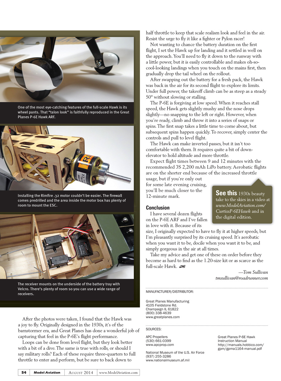 After the photos were taken, I found that the Hawk was an absolute joy to fly. Originally designed in the 1930s, it’s of the barnstormer era, and Great Planes has done a wonderful job of capturing that feel in the P-6E’s flight performance.