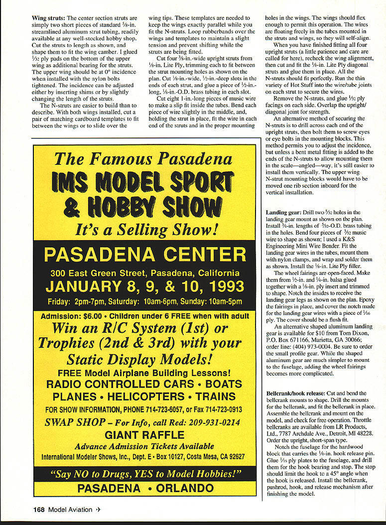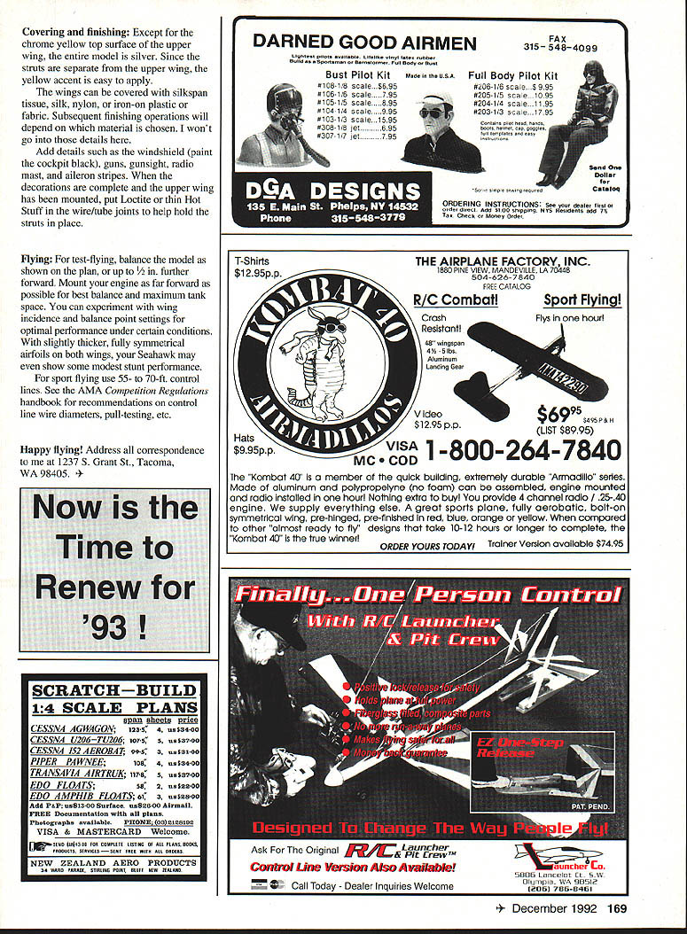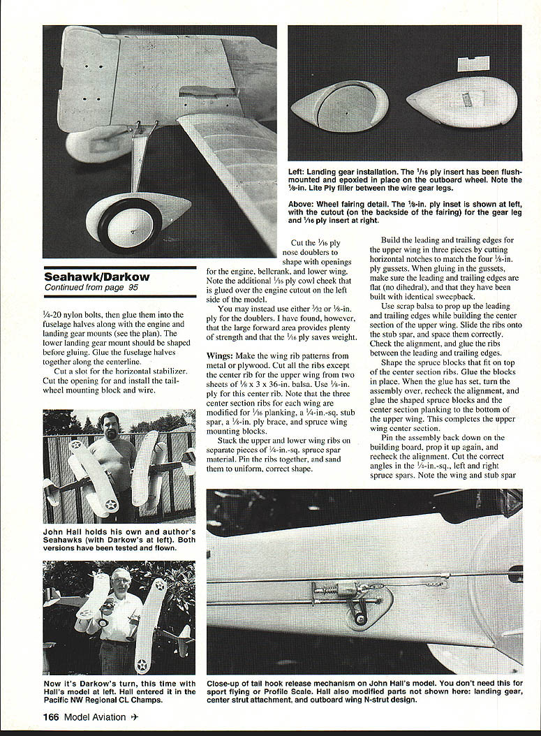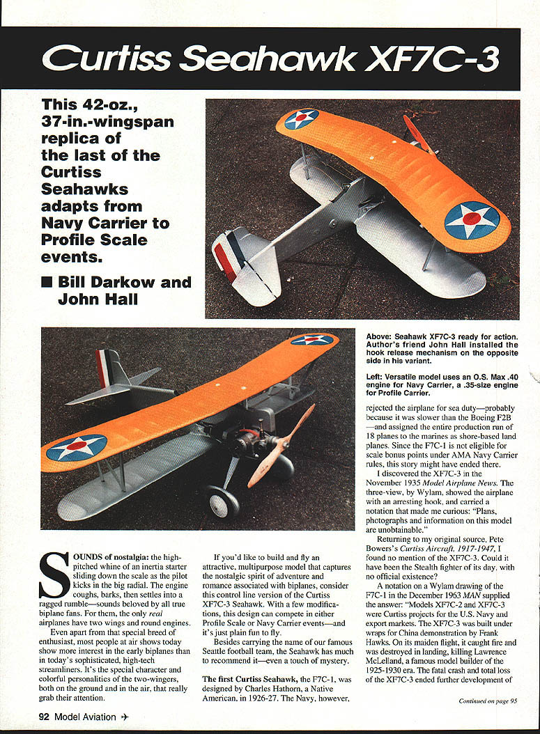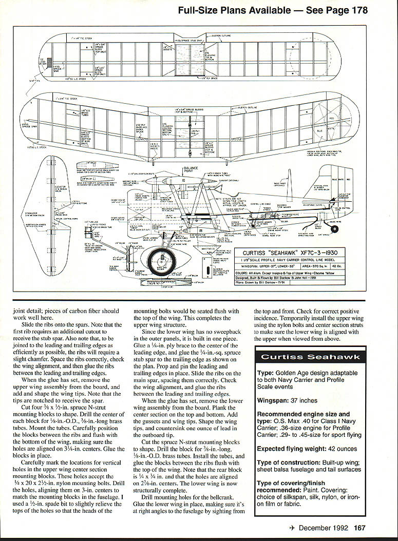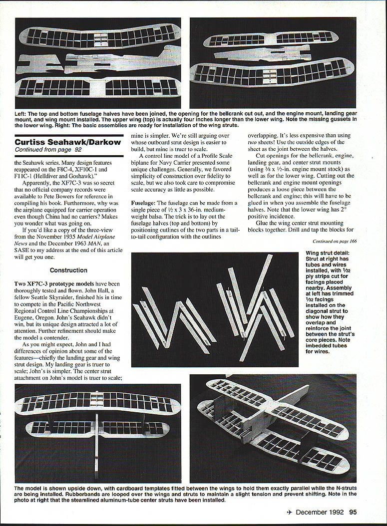 This 42-oz 37in-wingspan replica last Curtiss Seahawks adapts Navy Carrier Profile Scale events U Bill Darkow John Hall SOUNDS nostalgia highpitched whine inertia starter sliding down scale pilot kicks big radial engine coughs barks settles ragged rumblesounds beloved true biplane fans real airplanes have two wings round engines apart special breed enthusiast people air shows today show interest early biplanes todays sophisticated high-tech streamliners Its special character colorful personalities two-wingers both ground air really grab attention youd like build fly attractive multipurpose model captures nostalgic spirit adventure romance associated biplanes consider control line version Curtiss XF7C-3 Seahawk few modifica tions design can compete either Profile Scale Navy Carrier eventsand its just plain fun fly Besides carrying name famous Seattle football team Seahawk has much recommend iteven touch mystery first Curtiss Seahawk F7C- 1 designed Charles Hathom Native American 1926-27 Navy however Left Versatile model uses OS Max 40 engine Navy Carrier 35-size engine Profile Carrier rejected airplane sea dutyprobably because slower Boeing F2B assigned entire production run 18 planes marines shore-based land planes Since F7C- 1 eligible scale bonus points under AMA Navy Carrier rules story might have ended discovered XF7C-3 November 1935 Model Airplane News three-view Wylam showed airplane arresting hook carried notation made curious Plans photographs information model unobtainable Returning original source Pete Bowerss Curtiss Aircraft 1917-1 947 found no mention XF7C-3 Could have Stealth fighter its day no official existence notation Wylam drawing F7C-1 December 1963 MAN supplied answer Models XF7C-2 XF7C-3 Curtiss projects US Navy export markets XF7C-3 built under wraps China demonstration Frank Hawks its maiden flight caught fire destroyed landing killing Lawrence McLelland famous model builder 1925-1930 era fatal crash total loss XF7C-3 ended further development Continued page 95 92 Model Aviation e Seahawk XF7C-3 ready action Authors friend John Hall installed hook release mechanism opposite side variant Curtiss SeahawklDarkow Continued page 92 Seahawk series design features reappeared F8C-4 XFlOC-l Fl ic-i Heildiver Goshawk Apparently XF7C-3 secret no official company records available Pete Bowers reference compiling book Furthermore airplane equipped carrier operation though China no carriers Makes wonder what going youd like copy three-view November 1935 Model Airplane News December 1963 MAN SASE address end article will get Construction Two XF7C-3 prototype models have thoroughly tested flown John Hall fellow Seattle Skyraider finished time compete Pacific Northwest Regional Control Line Championships Eugene Oregon Johns Seahawk didnt win its unique design attracted lot attention Further refinement should make model contender As might expect John differences opinion about some featureschiefly landing gear wing strut design landing gear truer scale Johns simpler center strut attachment Johns model truer scale simpler still arguing over outboard strut design easier build truer scale control line model Profile Scale biplane Navy Carrier presented some unique challenges Generally favored simplicity construction over fidelity scale also took care compromise scale accuracy little possible Fuselage fuselage can made single piece x 36-in mediumweight balsa trick lay out fuselage halves top bottom positioning outlines two parts tailto-tail configuration outlines overlapping Its less expensive using two sheets Use outside edges sheet joint between halves Cut openings hellcrank engine landing gear center strut mounts using 3/g x -in engine mount stock well lower wing Cutting out bellcrank engine mount openings produces loose piece between bellcrank engine will have glued assemble fuselage halves Note lower wing has 2 positive incidence Glue wing center strut mounting blocks together Drill tap blocks Continued page 166 Wing strut detail Strut right has tubes wires installed 12 ply strips cut facings placed nearby Assembly left has trimmed 12 facings installed diagonal strut show overlap reinforce joint between struts core pieces Note imbedded tubes wires mber 1992 95 Left top bottom fuselage halves have joined opening bellcrank cut out engine mount landing gear mount wing mount installed upper wing top actually four inches longer lower wing Note missing gussets lower wing Right basic assemblies ready installation wing struts model shown upside down cardboard templates fitted between wings hold exactly parallel N-struts being installed Rubberbands looped over wings struts maintain slight tension prevent shifting Note photo right steamlined aluminum-tube center struts have installed -20 nylon bolts glue fuselage halves along engine landing gear mounts see plan lower landing gear mount should shaped before gluing Glue fuselage halves together along centerline Cut slot horizontal stabilizer Cut opening install tailwheel mounting block wire Above Wheel fairing detail -in ply inset shown left cutout backside fairing gear leg 1/16 ply insert right Cut /16 ply nose doublers shape openings engine belicrank lower wing Note additional /16 ply cowl cheek glued over engine cutout left side model may instead use either 3A2 /8-in ply doublers have found however large forward area provides plenty strength A6 ply saves weight Wings Make wing rib patterns metal plywood Cut ribs except center rib upper wing two sheets /s x 3 x 36-in balsa Use /8-in ply center rib Note three center section ribs wing modified /16 planking -in-sq stub spar /s-in ply brace spruce wing mounting blocks Stack upper lower wing ribs separate pieces -in-sq spruce spar material Pin ribs together sand uniform correct shape Build leading trailing edges upper wing three pieces cutting horizontal notches match four A-in ply gussets gluing gussets make sure leading trailing edges flat no dihedral have built identical sweepback Use scrap bal