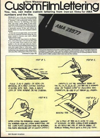Vein Weaver Custom Film Lettering too can make custom lettering iron-on films AMA numbers like PROBABLY head-scratching steps process finishing model aircraft adorning professional looking AMA numbers However following few basic steps using good sharp X-Acto knife successful results possible Almost style color size lettering can manufactured reasonable amount time artistic talents may have assumed would needed can cut out paper dolls youre luck may surprised thats about talent needed become clubs official AMA-number-maker Before going steps shown illustra tions some preliminary work must done must make Xerox copies AMA number size type style require can done purchasing what known artist supply shops press type plastic sheets several letters numbers placed dry clean surface will come off rubbing stylus Press Continued page 106 W 1 FW4 364 LAWb OF INON AA1eiIAL ctJ MAp at-iNb 9JFACe WflH t XRc 6QIY6F YVLR NUMI e2J 11* 6OvtN& AP1J VrIiN& III M6JJ4II4& 6AVU14A 6Uf 11 IMNg~ PgtA OF 11* cy YOU v ue rAJctT F2fJaI ai -ro vau 11T - O-~Th5IJ fWot$ ALL LAYg~ W Y60 tWt-t iV t Iot4-cN jpic iF 24 Model Aviation Therearetwo beautlesto authors lettering system isthatyou can use anystyle oftypethat available press type formand number styles almost limitless other can obtain perfect colorcoordination since lettering cut iron-on covering material Picture shows authors AMA numbers done method 1YEAR WARRANTY WARRANTY OR SERVICE-K WORK CAR RE DONE UT RUQOR Hf 0 OR RY YOUR** REAREST ECIIO-KIORITZ PRODUCTS DEALERK** K** Exhaust Manifold Velocity Stack Kits Available * being drawn find out much voltage lost inside battery Volts x Ohms eq 4 Lets say during flight enough servos move against enough load draw 1 amp Lets also say battery partially discharged showing us 50 volts internal resis tance lost voltage will volt drops terminal voltage 4875 VDC No problem Now move over other end curve battery showing 47 VDC resistance has risen Ys ohm Lost voltage now 375 VDC terminal voltage drops 43 25 VDC consider 44 VDC end useful charge analysis tells us battery done day Suppose test ESY draws nominal 250ma voltage lost 047 VDC improper test shows 465 VDC ESV figure fine shape another flight think get point want compare Apples Apples instead Apples Oranges need shunt ESV enough external resistance make measure situation face flying larger servos Id permanently mount 10 ohm 10 watt resistor across plug THE RISING STAR IN GIANT SCALE ENGINES 24 CU inch 32 HP 8000 RPM 6/s lbs 03 Ring Piston Ball Bearings Crank Sealed Points VAYSHPPNG ON PRE-PAID ORDER * * Dealer Inquiries * * Welcome KK ROUSH MFG P0 Box 251 Sandyville OH 44671 Ph 216/866-9462 216/484-4374 see sketch ESV used test system powers three World Engines S-16 servos youre using something else now know figure similar shunt needs Lest ye think Im picking World Engines let point out real message column follows time decide something out ordinary consider consequences Some pretty subtle ESV have learned love trust designed around different situation face fly anything four ordinary servos number larger-than-ordinary ser vos Ive shown estimate average working current compensate ESV Ive also shown larger servos need larger batteries figure what need ratings came returned Christmas vacation 10 letters waiting responded request rating previous columns took rankings provided put point scores columns reverse order preference respondent listed five columns assigned five points most-liked column point least 10 columns mentioned top column got 10 points etc Based limited sampling top column 1980 September 80 column MEN C50/4 charger barely nosed out three columns Ace Silver Seven transmitter Third place went WRAMS show coverage didnt expect Five letters asked information Dual Mixer 10 letters expressed preference technical content scoring system biased favor people rated large number columns Doing statistics differently tried assigning scores order preference summing scores dividing number entries against item Using method lowest score greater zero best Dual Mixer column October 80 walked away rest MEN column came second Any way look respondents liked scientific articles show interest something unusual Most seemed want details Whats preference dont vote no will know Keep letters flowing George M Myers 70 Froehlich Farm Rd Hicksville NY 11801 Letteri ng/Woaver Continued page 24 type used commercial art trade setting headlines available hundreds styles sizes Directions using press type explained catalogs put out various manufacturers Zip-A-Tone Formatt Letraset short simply draw straight line sheet paper position appropriate letters numbers line rub area stylus such pencil ball-point pen etc Remove plastic sheet Presto. beautiful master Use master make Xerox copies youre ready proceed illustrated steps way press type can used directly model Some care must exercised rub too hard ruin surface model After application number press type must fuel-proofed Light coats sprayed-on clear dope new fuel-proofing clear finishes will work long lightly apply first few coats SAFE FLYING IS NO ACCIDENT Features r Specifications s=-r ftfl~Span 86 II 1P111k i1I ITI'1 11111k IIgArea 1245sq-. IIIWeight 12 Engine 91 Cline drive unit elevators vertical fin rudder 1 Seperate detachable presheeted wing panels 2 Preassembiled fuselage frame 3 Preassembiled stabilizer IOC L 4 Epoxy Glass cowl wheelpants 5 Formed hatch clear canopy 6 Aluminum landing gear DEALER & 015 AWL OA INQUIRIES E Fronton St Brownsv lie TX 7852015121 5413867J Wayne Ulerys outstanding design Leo Loudenslagers Laser 200 geared 90 offered Model Merchant nearly constructed model critical fuselage & control surfaces framing wing sheeting has done Just some finish up ready fly best available 106 Model Aviation
