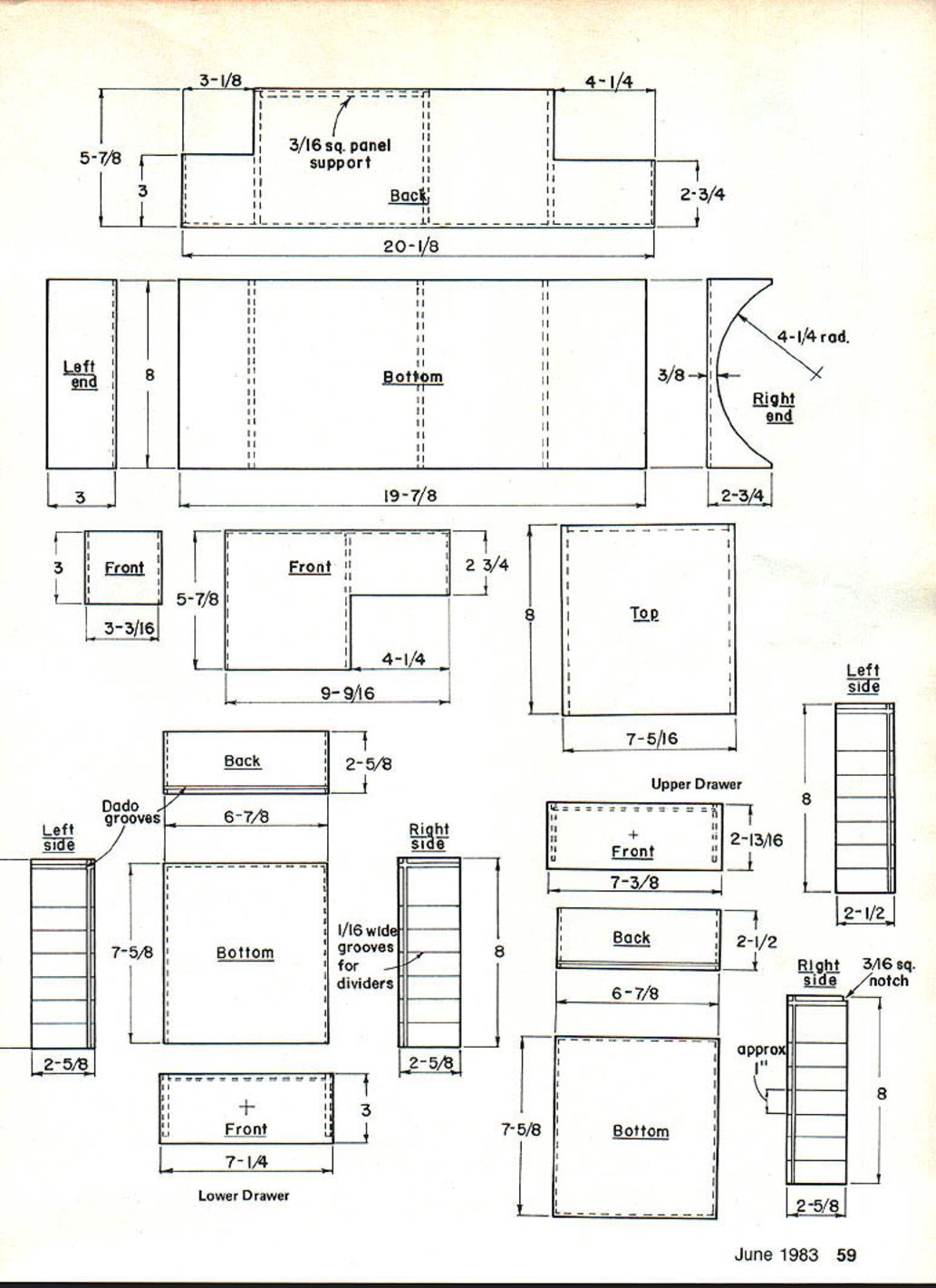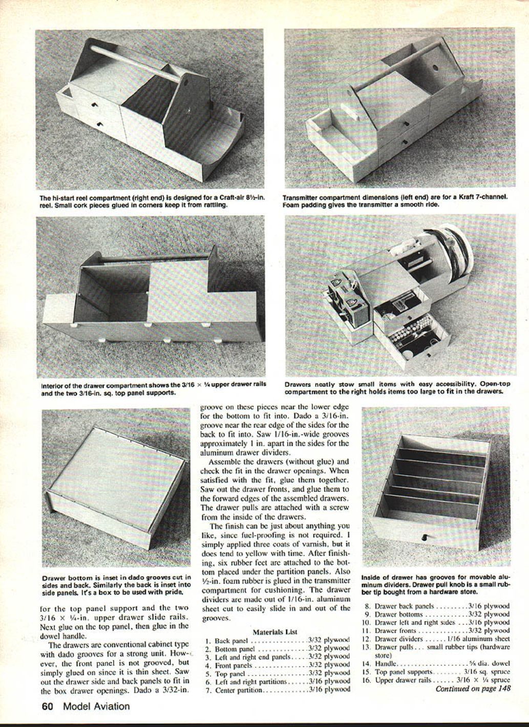 I UmilpImum lieu RC Sailplane flier have woodworking skills field box may just ticket well thought out carry everything thats needed except Sailplane compact lightweight package U Terry D Edmonds MOST commercially-available field boxes designed primarily RC power plane flying provisions engine starting equipment compartments boxes usually right size con figuration Sailplane paraphernalia field box presented designed specifically carry necessary items Sailplane hi-start flying being overly large heavy transmitter housed end hi-start other drawers compartment between drawers have movable di viders hold small itemslike ballast moving around single trip car flying area can made carrying Sailplane hand field box other dimensions given drawings accommodate Kraft seven-channel transmitter Craft-air heavy duty hi-start 8-in reel dimensions can varied easily other equipment Drawer sizes can also changed fit particular tools ballast etc Construction box made primarily out aircraft grade plywood expensive lumberyard materials makes final product lighter smal ler Five-mm 15-mm epoxy used gluing panels together used Dremel table saw sawing out parts cutting dado grooves drawer pieces o 316 sq top panel support - 5-3/4 3A6xi/4 2-29/32drawer il_____ 2-29/2 I 8 Center partition 3/i6xl/4 Start sawing out parts except drawer pieces Note parts have 8-in width parts cut 9 4-1/4 0 7/ dla t partition 8 saw fence setting accuracy can im f proved Glue left right partitions bottom using A-in dowel handle square align Glue center partition bottom also using square 5-5/8 Glue front back panels Note two front panel pieces overlap half left center partition edges drawer opening Next glue end ____ panels Glue two 3/16-in sq sticks 58 Model Aviation completed custom field box has packed things necessary hi-start flying Grab box hand Sail plane otherhead flying field 5-7/8 3-I/B4-1/4 III ______3/16 sq panel supportI IIII IIII II ______________ ____________ 1II II ________jIII--____ 20-1/8 3 2-3/4 3/8 II II I II I II II II II i II I II I BottomII II IIIiii IIIIII IIIIII IIII IIIIii IIIIII ___________________IIII________________ 19-7/8 3 Fi 3Front III LJ 5-7/8 3-3/16 II Front II II 4-1/4 9- 9A 6 2 3/4 tF4 B I4-l/4rad Igti end 2-34 Left side 7-5/16 Upper Drawer 1116 wide grooves f dividers -4 II III -I-3 II Fro nt 7 K sij IYI 1I ILffintu 7-3/8 8 7-5/8 Lower Drawer Back 6-7/8 Bottom J L 8 2-I3A6 2-1/2 2-I/2 appro 3A6 sq side notch 8 June 1983 59 k eft 8 r Dado grooves 7- 5S Back 6-7/8 Bottom Left side 2-SiB I7-IA top panel support two 3/16 x /4-in upper drawer slide rails Next glue top panel glue dowel handle drawers conventional cabinet type dado grooves strong unit ever front panel grooved simply glued since thin sheet Saw out drawer side back panels fit box drawer openings Dado 3/32-in groove pieces near lower edge bottom fit Dado 3/16-in groove near rear edge sides back fit Saw 1/16-in-wide grooves approximately apart sides aluminum drawer dividers Assemble drawers glue check fit drawer openings satisfied fit glue together Saw out drawer fronts glue forward edges assembled drawers drawer pulls attached screw inside drawers finish can just about anything like since fuel-proofing required simply applied three coats varnish does tend yellow time After finish ing six rubber feet attached bot tom placed under partition panels Also -in foam rubber glued transmitter compartment cushioning drawer dividers made out 1/16-in aluminum sheet cut easily slide out grooves Materials List IBack panel3/32 plywood 2Bottom panel3/32 plywood 3Left right end panels3/32 plywood 4Front panels3/32 plywood 5Top panel3/32 plywood 6Left right partitions3/16 plywood 7Center partition3/16 plywood 8Drawer back panels3/16 plywood 9Drawer bottoms3/32 plywood 10Drawer left andright sides . 3/16 plywood 11Drawer fronts3/32 plywood 12Drawer dividers1/16 aluminum sheet 13Drawer pulls l rubber tips hardware store 14Handle5/, dia dowel 15Top panel supports3/16 sq spruce 16Upper drawer rails3/16 x ce Continued page 148 60 Model Aviation hi-start reel compartment right end designed Craft-air 8-in reel Small cork pieces glued corners keep rattling Transmitter compartment dimensions left end Kratt 7-channel Foam padding gives transmitter smooth ride Interior drawer compartment shows 3/16 x r drawer rails two 3/1 6-in sq top panel supports Drawers neatly stow small items easy accessibility Open-top compartment right holds items too large fit drawers Drawer bottom inset dado grooves cut sides back Similarly back inset side panels Its box used pride Inside drawer has grooves movable alu minum dividers Drawer pull knob small rub ber tip bought hardware store HEAVY DUTY 4-IN SANDER Adjustable table Miter guide $100 10 Sand discs $300 CASH $2795 Ship $ 350 q minm 764-1490 [CakQic / GOODIESI 13400-26 Saticoy Street3 North Hollywood Calif 91605 cQay_ SPECIAL 825I DELUXE SYSTEMI Flite wt 101 oz 4Ch lete metal Tx 4 Servos NicadsChgr Reg$27495 CASH $15995 Ship$ 650 U I 40-61 Engine Reg $17995 CASH $13995 ___________ U U I I I Pm4kh Lifetime Sanding Taols Grit brazed steel type 11/2 x 9 1g radius type 1 x 9 1g 3/4 radius Bath have coarse & fine grits SpecifyJ $2500 Reg $695 Reg $3995 CASH $495 $2597 MORE U $200 Foreign Add Calif Sales Tax CASH price shown Cards 5% higher sianr cnooiyara ivsoaei Span 46 049 061 engine 350 sqinches 2-3CH Radio Ship $400 have equipment needs help Helicopters Contact George mail 700 Fossil Drive gleside IL 60041 set up schedule Danny Floyd Ill see others Toledo See next month Dose Chesnev PO Box 16612 Greensboro NC 27406 Field Box/Edmonds Continued page 60 17Feetruhher feet hardware store 18 Transmitter padding. -in foam rubber Editors Note build Cus tom RC Sailplane Field Box recom mended follow good cabinet making practice custom Build drawers fit case cut parts fit holes Radio Technique/Myers Continued page 68 officers agents will guarantee fol lowing instructions given article will protect RC operator interference nor will accept responsib