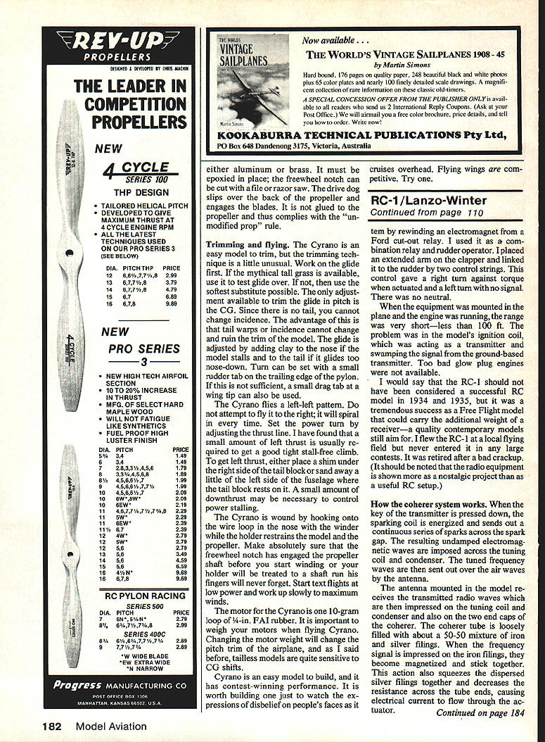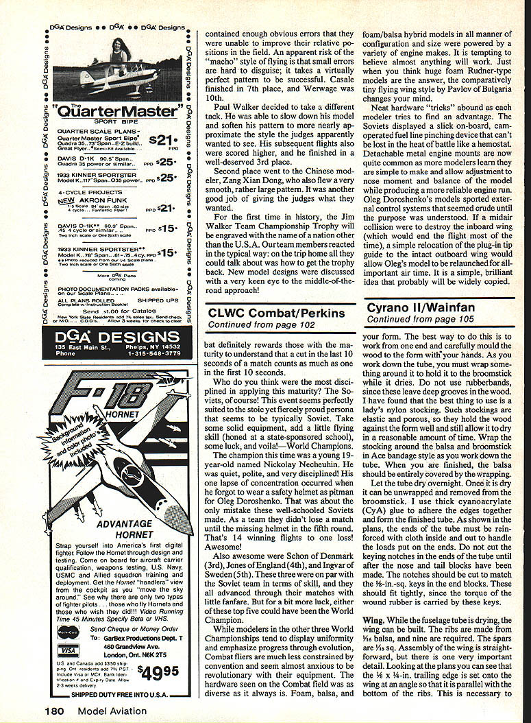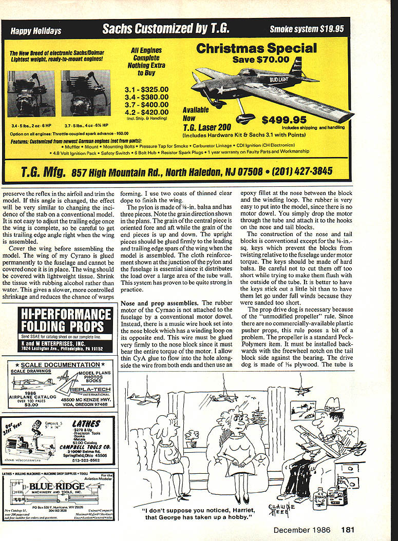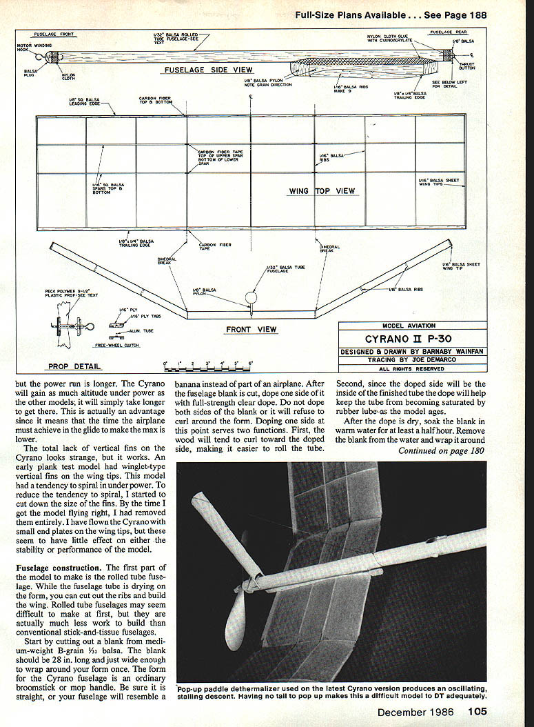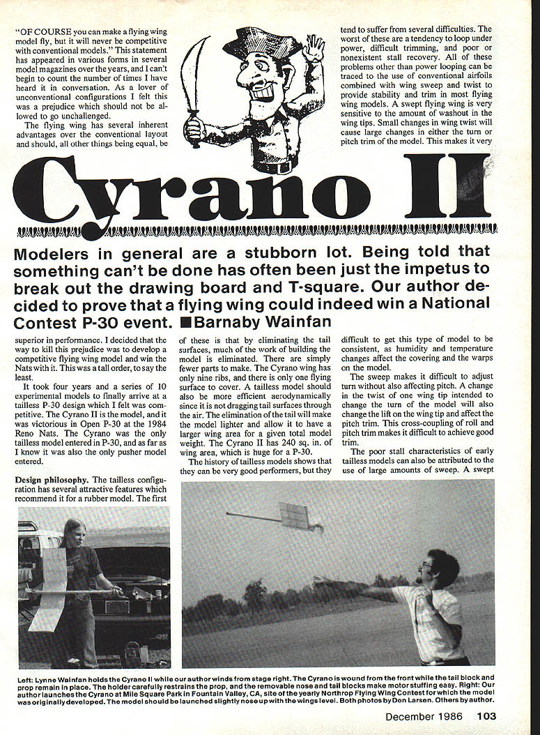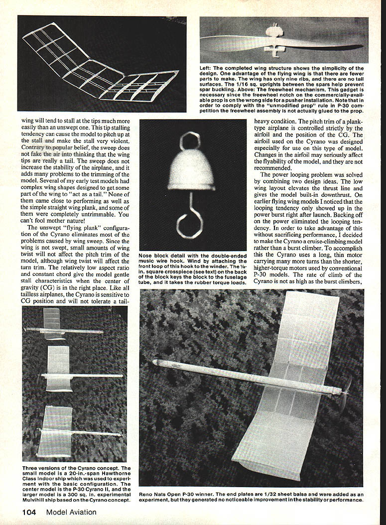 OF COURSE can make flying wing model fly will never competitive conventional models statement has appeared various forms several model magazines over years cant begin count number times have heard conversation As lover unconventional configurations felt prejudice should al lowed go unchallenged flying wing has several inherent advantages over conventional layout should other things being equal N aI--tend suffer several difficulties worst tendency toloop under power difficult trimming poor nonexistent stall recovery problems other power looping can traced use conventional airfoils combined wing sweep twist provide stability trim flying wing models swept flying wing very sensitive amount washout wing tips Small changes wing twist will cause large changes either turn pitch trim model makes very Modelers general stubborn lot Being told something cant done has often just impetus break out drawing board T-square author de cided prove flying wing could indeed win National Contest P-30 event EBarnaby Wainfan superior performance decided way kill prejudice develop competitive flying wing model win Nats tall order say least took four years series 10 experimental models finally arrive tailless P-30 design felt com petitive Cyrano II model victorious Open P-30 1984 Reno Nats Cyrano tailless model entered P-30 far know also pusher model entered Design philosophy tailless configu ration has several attractive features recommend rubber model first eliminating tail surfaces much work building model eliminated simply fewer parts make Cyrano wing has nine ribs flying surface cover tailless model should also efficient aerodynamically since dragging tail surfaces through air elimination tail will make model lighter allow have larger wing area given total model weight Cyrano II has 240 sq wing area huge P-30 history tailless models shows can very good performers difficult get type model consistent humidity temperature changes affect covering warps model sweep makes difficult adjust turn also affecting pitch change twist wing tip intended change turn model will also change lift wing tip affect pitch trim cross-coupling roll pitch trim makes difficult achieve good trim poor stall characteristics early tailless models can also attributed use large amounts sweep swept December1986 103 Left Lynne Wainfan holdsthe Cyrano II ourauthorwinds stage right Cyrano lawound front thetail biock prop remain place holder carefully restrains prop removable nose tail blocks make motor stuffing easy Right author launchesthe Cyrano Mile Square Park Fountain Valley CA site yearly Northrop Flying Wing Contestforwhich model originallydeveloped model should launched slightly nose upwith thewings level Both photos byDon Larsen Others byauthor wing will tend stall tips much easily unswept tip stalling tendency can cause model pitch up stall make stall very violent Contrary popular belief sweep does fake air thinking wing tips really tail sweep does increase stability airplane adds problems trimming model Several early test models complex wing shapes designed get some part wing act tail None came close performing well simple straight wing plank some completely untrimmable cant fool mother nature unswept flying plank configura tion Cyrano eliminates problems caused wing sweep Since wing swept small amounts wing twist will affect pitch trim model although wing twist will affect turn trim relatively low aspect ratio constant chord give model gentle stall characteristics center gravity CG right place Like tailless airplanes Cyrano sensitive CG nosition will to1rat tailheavy condition pitch trim planktype airplane controlled strictly airfoil position CG airfoil used Cyrano designed especially use type model Changes airfoil may seriously affect flyability model recommended power looping problem solved combining two design ideas low wing layout elevates thrust line gives model built-in downthrust earlier flying wing models noticed looping tendency showed up power burst right after launch Backing off power eliminated looping ten dency order take advantage sacrificing performance decided make Cyrano cruise-climbing model rather burst climber accomplish Cyrano uses long thin motor carrying turns shorter higher-torque motors used conventional P-30 models rate climb Cyrano high burst climbers 104 Model Aviation Left The completed wing structure shows simplicity design advantage flying wing fewer parts make wing has nine ribs no tail surfaces 1/16 sq uprights between spars help prevent spar buckling Above freewheel mechanism gadget necessary since freewheel notch commercially-avail able prop wrong side pusher Installation Note order comply unmodified prop rule P-30 com petition freewheel assembly actually glued prop Nose block detail double-ended music wire hook Wind attaching front ioop hook winder square crosspiece see text back block keys block fuselage tube takes rubber torque loads Three versions Cyrano concept small model 20-in-span Hawthorne Class Indoor ship used experi ment basic configuration center model P-30 Cyrano II larger model 300 sq experimental Mulvihill shipbasedontheCyranoconcept Reno Nats Open P-30 winner end plates 1/32 sheet balsa added experiment generated no noticeable improvement stabilityor performance Full-Size Plans Available. See Page 188 FUSELAGE FRONTV32 BALSA ROLLED TUBE FUSELAGE-SEE MOTOR WINDINGTESI HOOK FUSELAGE SIDE VIEW PLUGNYLON CLOTH I/B SO BALSACARBON FIBER LEADING EDGETOP BOTTO FUSELAGE REAR NYLON CLOTH GLUE WITH CYANOACRYLATEVR BALSA iiV - - I/B BALSA PYLON GEE BELOW LEFT NOTE GRAIN DIRECTIONI/IA BALSA RIBSFOR DETAIL MAKE SVR 1/4 BALSA TRAIUNG EDGE K CARBON FIBER TAPE TOP OF UPPER SPARI/IN BALSA BOTTOM OP LOWERRIBS SPAR V16 BALSA SHEET I/IS NO BALSAWING TIPS SPARS TOP WING ro VIEW j BOTTOM / I/BI/4 BALSA TBAILING EDGE CARBON FIBER TAPE vIA BALSA SHEET PLASTIC PROP GEE TEST ~AWM TUBE FBEE-WNEEL clUTCH PROP DETAIL power run longer Cyrano will gain much altitude under power other models will simpiy take longer