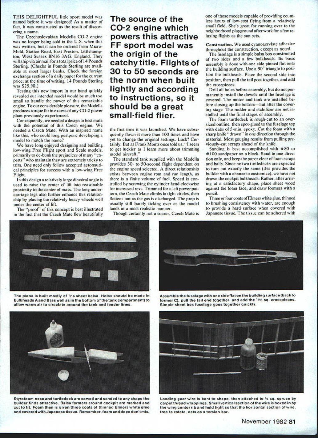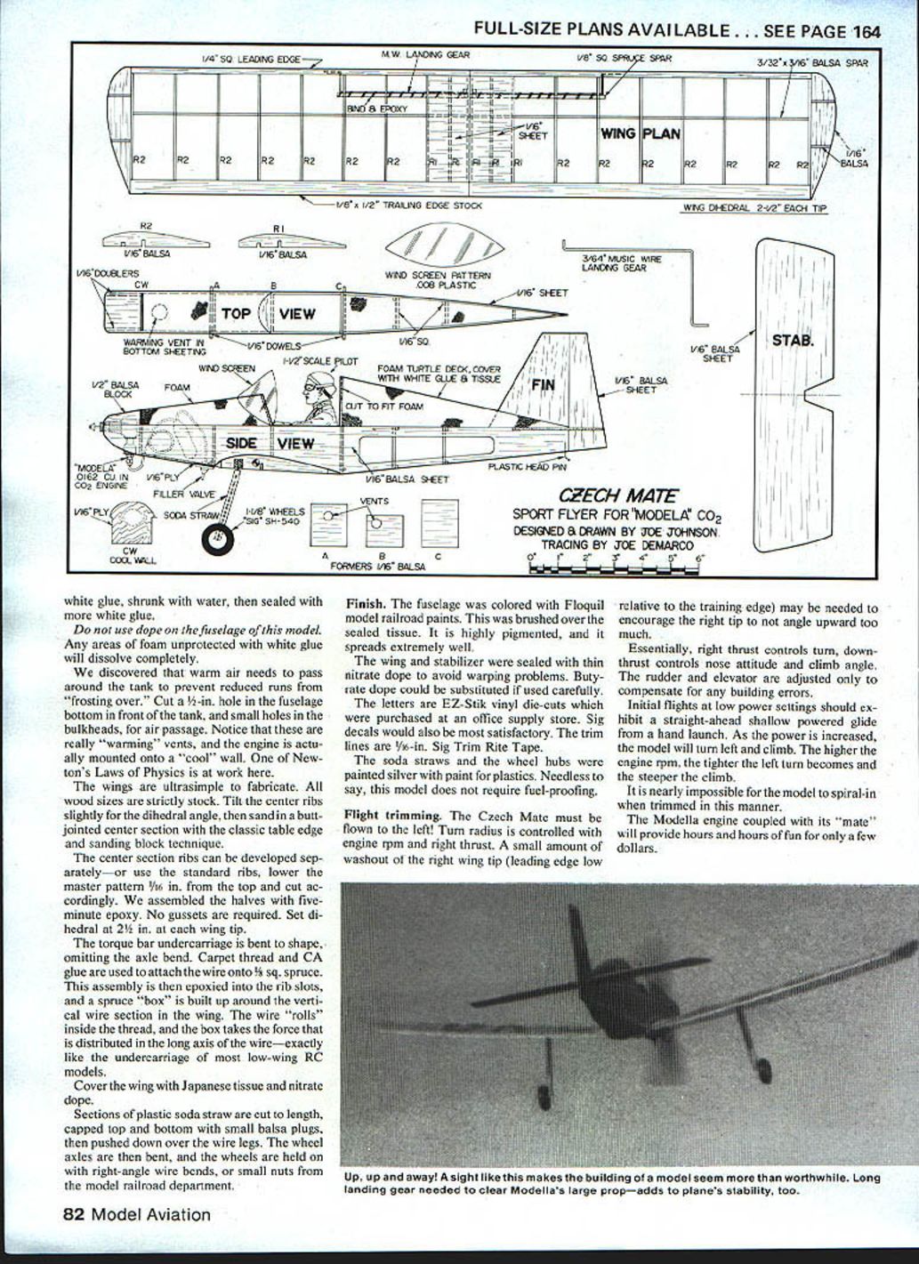 NO OCR TEXT THIS DELIGHTFUL little sport model named before designed As matter fact constructed result discov ering name Czechoslovakian Modella CO-2 engine no longer being sold US written can ordered MicroMold Station Road East Preston Littlehamp ton West Sussex BNl6 3AG England will ship via air mail total price 14 Pounds Sterling Checks Pounds Sterling avail able larger banks Check foreign exchange section daily paper current price time writing 14 Pounds Sterling $2590 Testing new import hand quickly revealed intended model would much too small handle power remarkable engine considerable pleasure Modella produces torque far excess CO-2 power plant previously experienced Consequently needed design best mate potential Czech engine needed Czech Mate inspired name like could long postpone developing model match name have long enjoyed designing building low-wing Free Flight sport Scale models primarily de-bunk prejudices ex perts maintain extremely tricky trim need follow accepted aeronauti cal principles success low-wing Free Flight design relatively large dihedral angle used raise center lift reasonable proximity center mass long under carriage legs also further enhance relation ship placing relatively heavy wheels well under center lift proof concept best illustrated fact Czech Mate flew beautifully source CO-2 engine powers attractive FF sport model origin catchy title Flights 30 50 seconds norm built lightly according instructions should great small-field flier first time launched have subse quently flown 100 times have yet change original settings Luck Cer tainly Frank Monts once told us seem get luckier learn about trimming model aircraft standard tank supplied Modella provides 30- 50-second flight dependent engine speed selected direct relationship exists between engine rpm run length finite volume fuel Speed con trolled screwing cylinder head clockwise increased revs Trimmed left power pat tern Czech Mate climbs tight circles flattens out gas discharged prop usually still barely ticking over model lands realistic manner Though certainly soarer Czech Mate models capable providing count less hours low-cost flying relatively small field Shes great running over neighborhood playground after work few re laxing flights sun sets Construction used cyanoacrylate adhesive throughout construction except noted fuselage simple balsa box constructed two sides few bulkheads Its basic assembly done side pinned flat onto building surface Use 900 triangle posi tion bulkheads Place second side position pull tail post together add crosspieces Drill holes before assembly per manently install dowels until fuselage covered motor tank installed fore closing up bottombut after cover ing stage rudder stabilizer stalled until final stages assembly foam turtledeck rough-cut over sized outline spot-glued fuselage top dabs 5-mm epoxy Cut foam Sharp knife drawn direction through material Most gouging results pulling pre viously-cut scraps ahead knife Sanding best accomplished #80 #100 sandpaper block Sand direc tion keep paper clear foam scraps balls Since no two turtledecks expected turn out exactly same provides builder chance customize have drawn cockpit bulkheads Rather after arriv ing satisfactory shape place sheet wood against foam face draw formers pencil Three four coats ofElmers white glue thinned brushing consistency water enough provide bard surface covered Japanese tissue tissue can adhered Styrofoam nose turtledeck carved sanded shape builder finds attractive Balsa formers around cockpit marked cut fit Foam given three coats thinned Elmers white glue covered Japanese tissue Remember foam dopedont mix Landing gear wire bent shape attached sq spruce carpetthread wrappings Small vertical section wire boxed wing center rib held tight horizontal section wire free rotate acts torsion bar November 198281 plane built mostly l/ie sheet balsa Holes should made bulkheads B well bottom tank compartmentto allow warm air circulate around tank feeder lines Assemblethe fuselage side flat building surface backto former C pull tail end together add 1/le sq crosapieces Simple sheet box fuselage goes together quickly FULL-SIZE PLANS AVAILABLE. SEE PAGE 164 /4 SO LEADING EOGF, MW LANDtIG IAR III / II BND 8 EPOXY 1/8 SO SPRE SRSR -E 2L II II-ft 1/ Ij '1/16 757i 1 SHEETWING PLAN II 22R2R21t2R2RIjRtRIjfftI212 12R222 R2 II 3 32 43/16 BALSA SR5R / BA SA 1/8 x 1/2 TRAILING EDGE STOCK WJG I3HEDRAL 2-1/2 FAO-4 TIP R2 1/16 BALSA RI 1/16 BALSA I/16DGUWERS \CW TOP VIEW WIND SCREEN FTTERN DEW PLASTIC 2 1/16 SHEET WARMING VENT IN -I/I6DOWELS-~ 1/16 SO BOTTCN SHEETING I-V2 SCALE PILOT WN SCREEN/FOAM TURTLE DECK COVER WITH WHITE GLLE 8 TIS9JE V2 BALSAFOAMZ/~ilFN BLOCK CUT TO FIT FOAM 3/64 MUSIC WIRE LANIYNG GEAR 1/16 BALSA SHEET 0162 CU IN1/16 PLY Lii FORMERS 1/16 BALSA SPORT FLYER FOR IODELA CO2 DESIED & DRAWN BY JOE JOHNSON TRACING BY JOE DEMARCO white glue shrunk water sealed white glue use dope fuselage ofthis model Any areas foam unprotected white glue will dissolve completely discovered warm air needs pass around tank prevent reduced runs frosting over Cut -in hole fuselage bottom front tank small holes bulkheads air passage Notice really warming vents engine actu ally mounted onto cool wall New tons Laws Physics work wings ultrasimple fabricate wood sizes strictly stock Tilt center ribs slightly dihedral angle sand buttjointed center section classic table edge sanding block tecnnique center section ribs can developed sep aratelyor use standard ribs lower master pattern /I6 top cut ac cordingly assembled halves fiveminute epoxy No gussets required Set di hedral 2 wing tip torque bar undercarriage bent shape omitting axle bend Carpet thread CA glue used attach wire onto Vs sq spruce assembly epoxied rib slots spruce box built up around verti cal wire section wing wire rolls inside thread box takes force distributed long axis wireexactly like undercarriage low-wing RC models Cover wing Japanese tissue nitrate dope Sections plasti