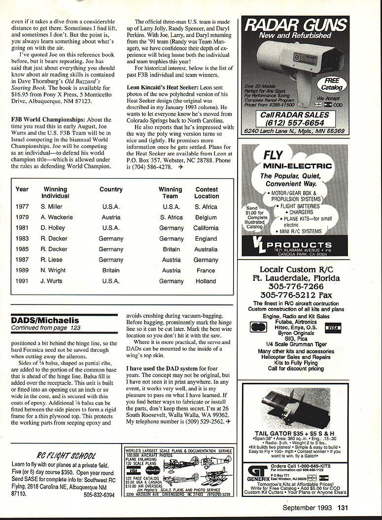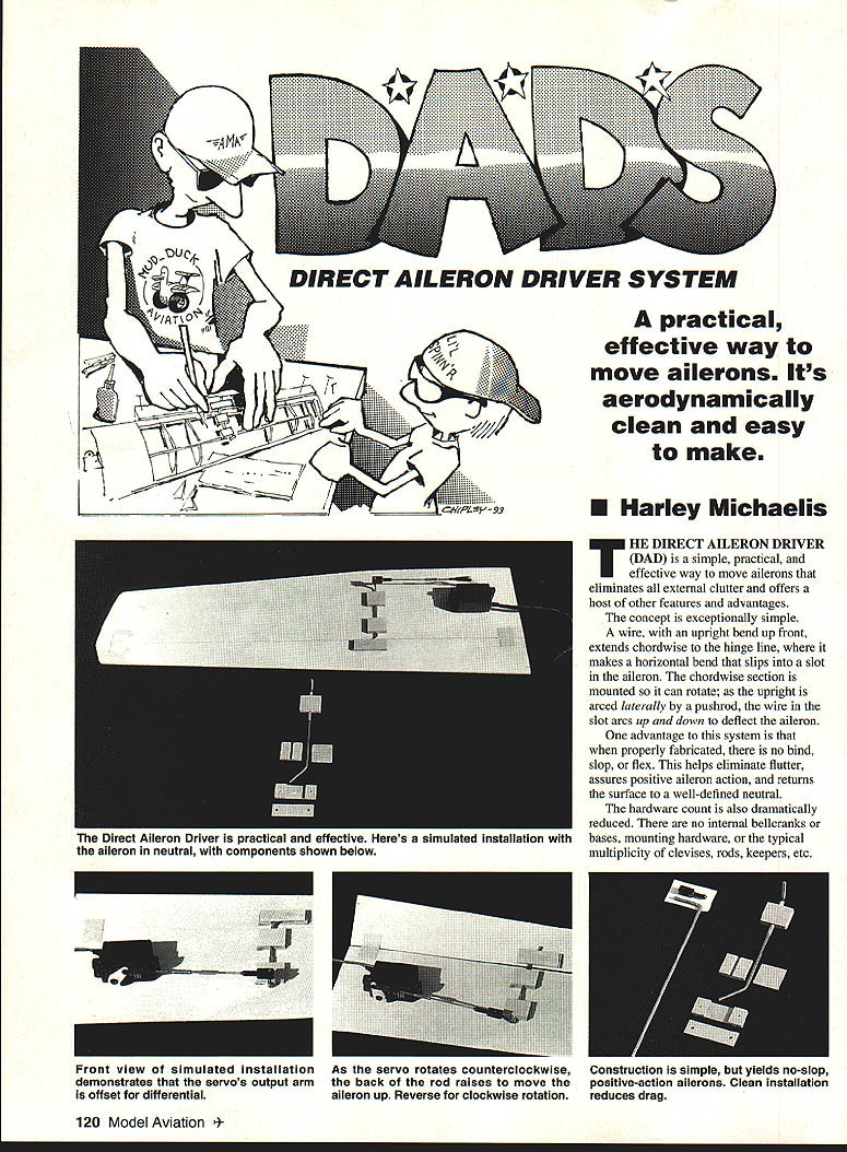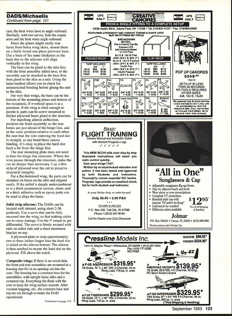 A practical effective way move ailerons Its aerodynamically clean easy make U Harley Michaelis THE DIRECT AILERON DRIVER DAD simple practical effective way move ailerons eliminates external clutter offers host other features advantages concept exceptionally simple wire upright bend up front extends chordwise hinge line makes horizontal bend slips slot aileron chordwise section mounted can rotate upright arced laterally pushrod wire slot arcs up down deflect aileron advantage system properly fabricated no bind slop flex helps eliminate flutter assures positive aileron action returns surface well-defined neutral hardware count also dramatically reduced no internal bellcranks bases mounting hardware typical multiplicity devises rods keepers etc 120 Model Aviation CT AILERON DRIVER SYSTEM N rPt 9 ne iirecs iieron river praciicai ana erTective neres simulatea installation witfl aileron neutral components shown below Front view simulated installationAs servo rotates counterclockwise demonstrates servos output armthe back rod raises move offset differentialaileron up Reverse clockwise rotation Construction simple yields no-slop positive-action ailerons Clean installation reduces drag UP1 Independant speed control & switching struts $2895 UP2Strut & door control Mustangs Door opens strut lowers door closes Door opens strut raises door closes $7465 UP3 Strut & door control valve P47 Door opens-strut lowers-door stays openStrut raisesdoor closes$7465 RENO UNLIMITED MUSTANG RETRACTS Fating II Totally enclosed IImechanism metal cylinder r 85degree retraction Fits between ribs$57900 including UP2 valve Door Cylinders metal 5/16 bore1 & 15 inch stroke $1900 6 inch diameter scale Mustang wheels Machined bar stock -8 spoke hub bronze bearings solid foam tire weight 10 oz $11500 pair ULTRA PRECISION Technical Services Ltd 1244 honeysuckle Crescent Oakville OntarioL6H 2S8 Canada Ph 416 842 1703 Dealer inquiries welcomeAll prices US fundsShipping valves & cylinders $450 straight pushrod between DAD servo. thats internal mounting DAD makes totally clean wing no unsightly drag-causing external hardware No corners have turned tightradius bends associated flexible pushrods eliminated Servos often mounted flat outboard just ahead ailerons effort avoid slop DAD system allows inboard mounting no need long exten sion cables intermediate connectors receiver system works nearly aileron applicationsin frame construction woodskinned wings composite wings Making front assembly Gently clamp threads standard 4-40 threaded rod vise make 900 bend 46 inch below threads Rocket City no-offset Swivel Link found packages #29 #69 will used threaded upright section neutral respect differential has very sturdy pinimportant features application Cut /6 3/ lengths nylon tube Slip shorter piece up front act bushing add longer behind Cut eight pieces 1/32 plywood approx imately 3¼-inch square mounting plate tops bottoms Cut four pieces /32 plywood about 4 act spacers Glue spacers bottoms make no-slop groove wires lay tops will added later spacing between bends related wing thickness radius 1/2 inch upright wire axis swivel center convenient although shorter length can used sure radii match ends bends smooth front bend needs positioned wing thick enough avoid jamming Swivel Link practical spacing between bends 21/2 4 inches thin wings upright can have shorter radius use shorter output arms reduce servo rotation avoid exceeding mechanical limits Make horizontal bends 450 sure have opposing pair An angle less 450 gives less deflection greater angle can result binding extreme up aileron plane rear bend 900 plane upright bend clamp rear bend vise twist threaded end pliers protecting threads Designate mounting plates front place behind bushing Position /i tube leave /32 play fore aft Carefully remove plate use cyanoacrylate CyA glue attach tube wire rear avoid bonding mounting plates wire coat wire something glue wont stick PlC has item called Slicker works well Vaseline car wax etc probably fine Check out join plates over wire unit now ready mount base Making hard slot Get flat chip sample untextured Formica Use top smooth side inward Saw direction avoids burrs smooth side Glue two 3A2 plywood spacer blocks approximately 3h inch apart /32 plywood bottom light sanding may necessary avoid play wireyou want snug fit no heavy bind Thin CyA glue makes very strong bond between smooth Formica birch ply screws added extra strength should countersunk keep unit thin easy fill overhead Tiny flat-headed servo-case screws work well Dremel #954 grinding stone can used countersinking Silicone lubricant can used receptacle reduce friction Installation given direction motion pushrod aileron can made move up down depending way bends opposing pair pointed single-servo application V-shaped output used get differential Since pushrod being pulled has lateral movement aileron should pulled up Continued page 123 risk engines performance anything less True AAC ABC piston/cylinder assemblies Now available over 25 different types popular engines choice professional modelers worldwide Send $200 1993 catalog Performance Specialties ox 3146 nerville NV 89410 Phone 702 265-7523 FAX 702 265-7522 September 1993 121 REALISTIC MOTION CONTROL VALVES valves feature exhaust speed control DADSIMichaeIis Continued page 121 case bent wires have angle outboard Similarly two servos both output arms bent wires angle outboard Since plates might easily tear loose balsa wing skins mount fairly broad one-piece plywood base Use base same thickness hard slot ailerons will align vertically wing base can glued skin first front assembly added next assembly can attached base first glued skin unit Using latter method allows check unintentional bonding before gluing unit skin very thin wings base can bottom mounting plates bottom receptacle overhead space premium wing thick enough permit parts can screw-mounted thicker plywood bases glued structure matching aileron deflection position front ass