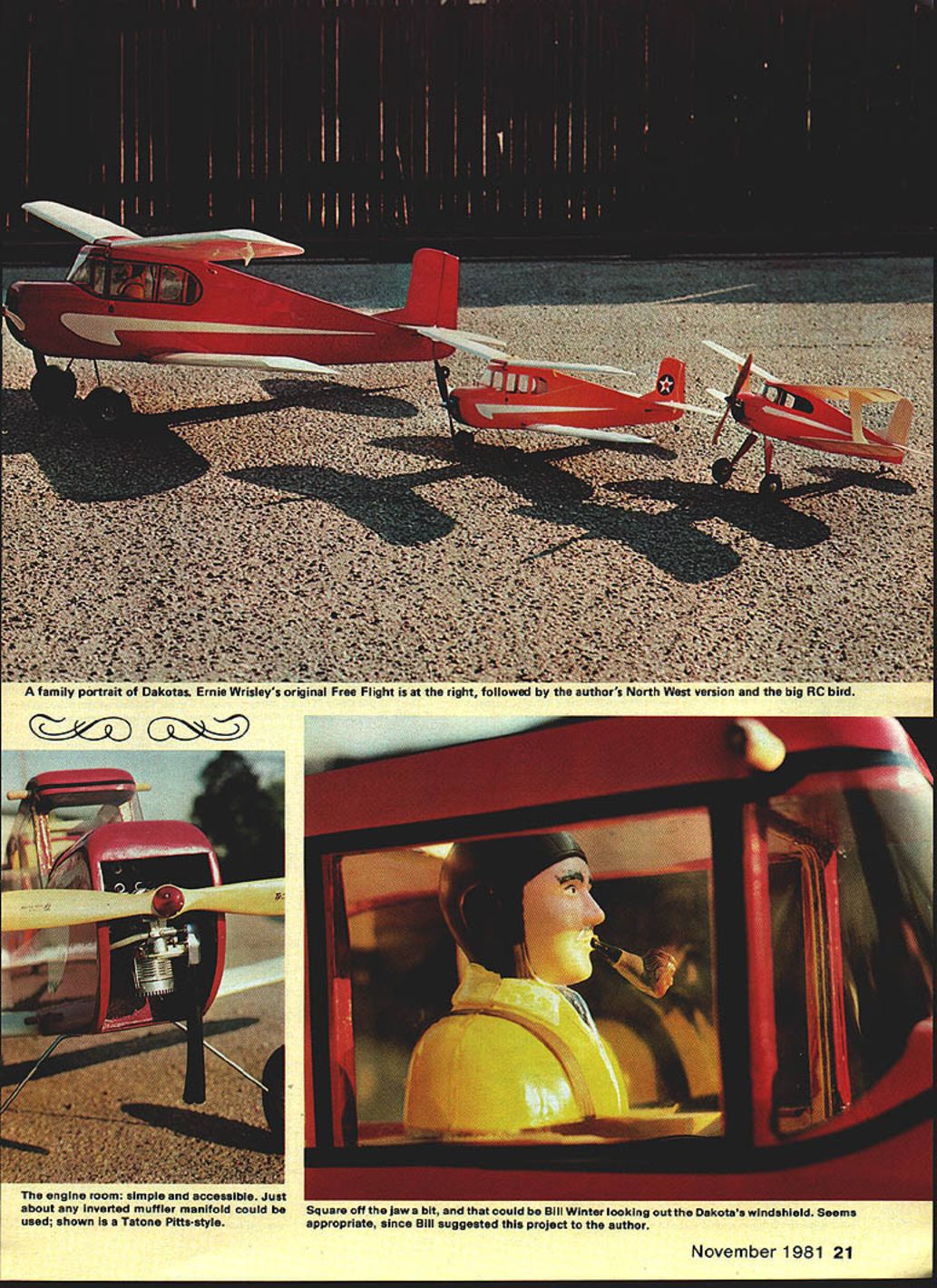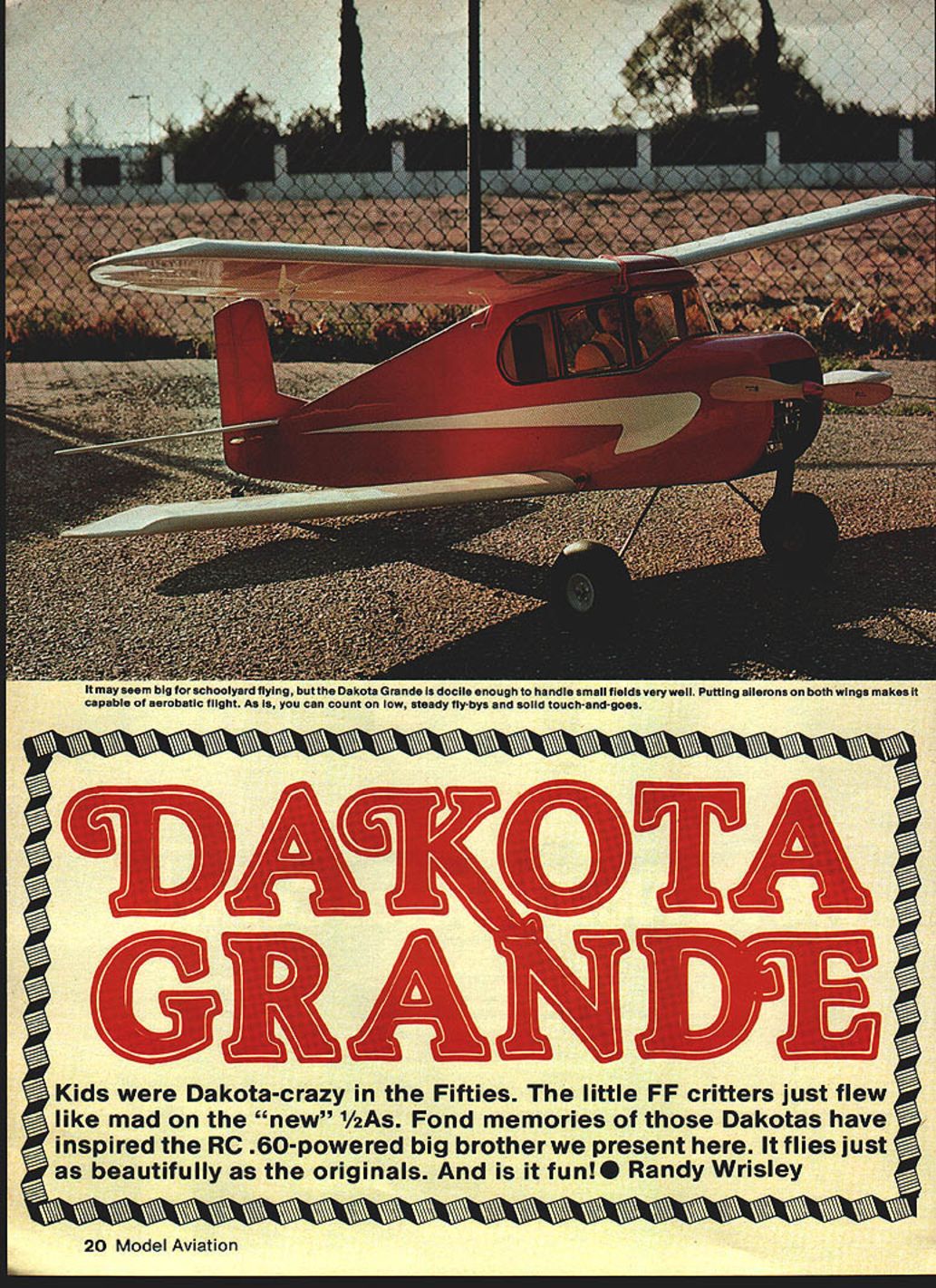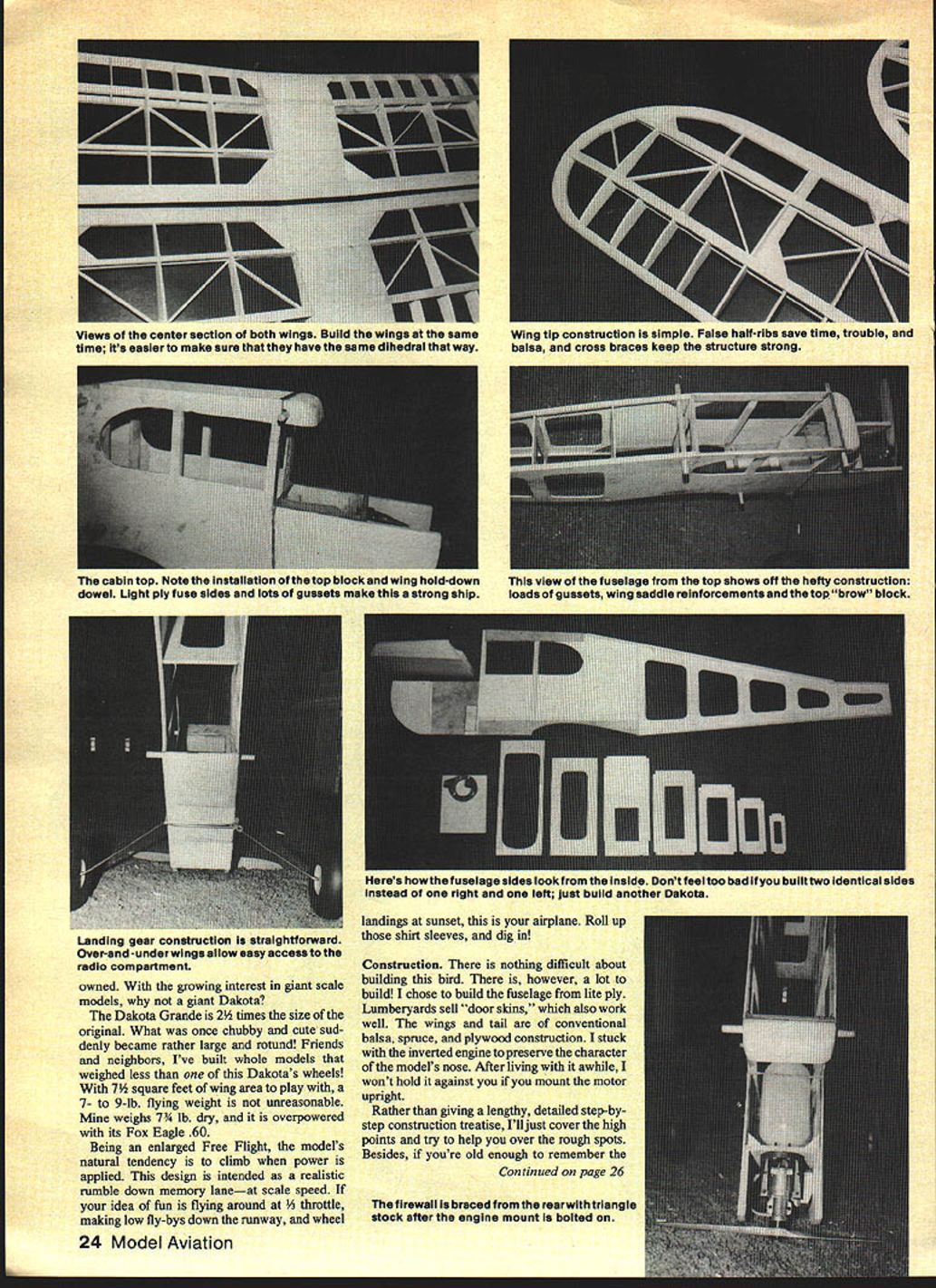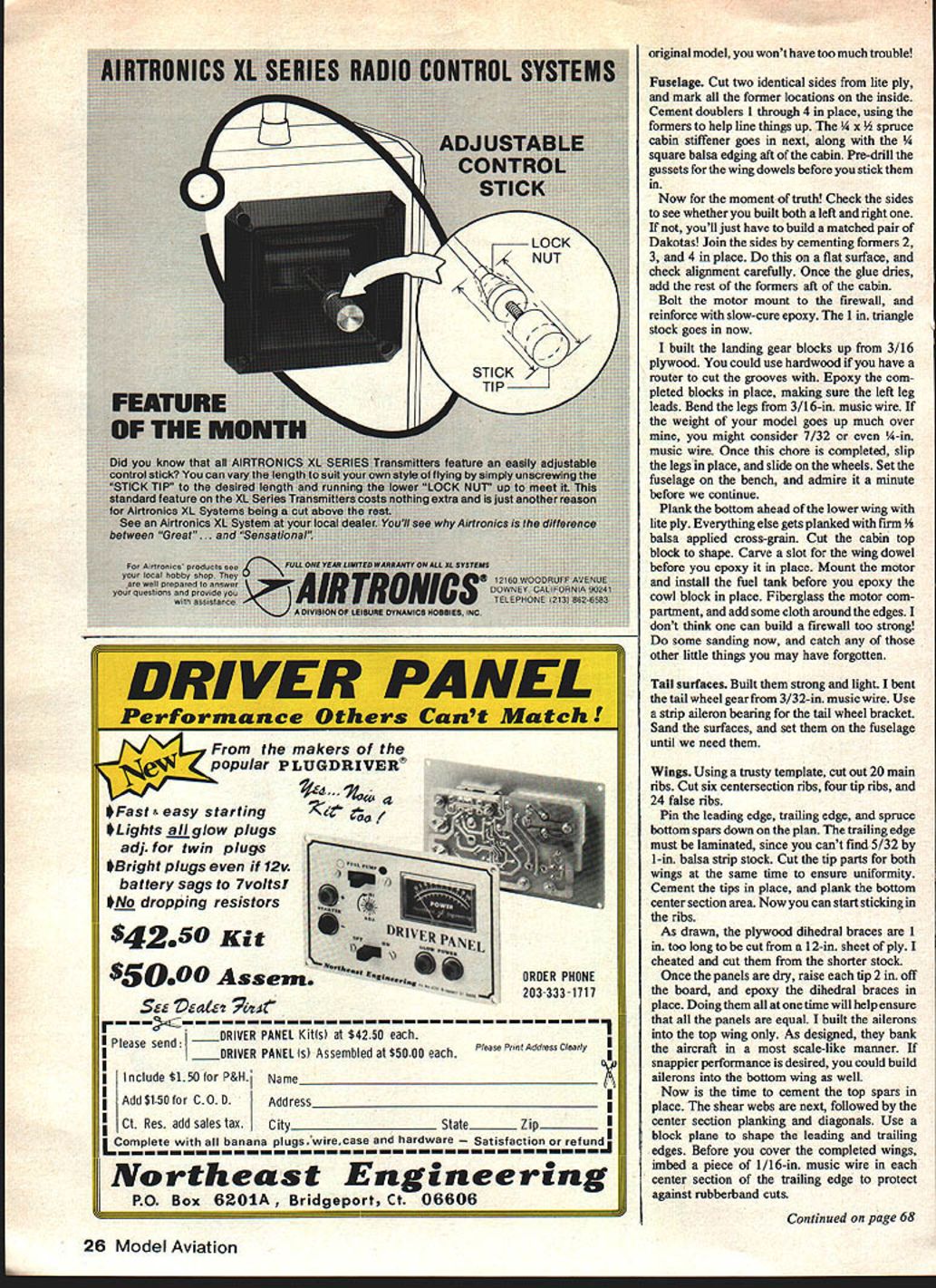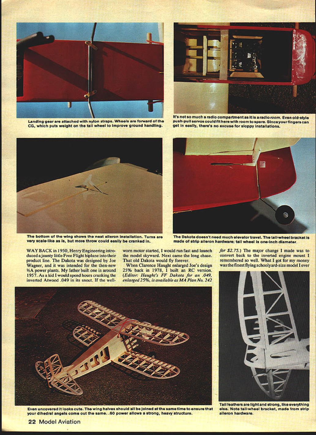 I muy uuum 019 Tor incnooiyara TIYIfl DaKota tirande docile enough handle small tielis very well Putting ailerons both wings makes capable acrobatic flight As can count low steady fly-bys solid touch-and-goes Kids Dakota-crazy Fifties little FF critters just flew like mad new 1/2As Fond memories Dakotas have inspired RC 60-powered big brother present flies just beautifully originals fun @ Randy Wrisley 20 Model Aviation family portrait Dakotas Ernie Wrisleys .. c~i ight anss Tfle engine room simple accessible Just about Inverted muffler manifold could Square off jaw bit could Bill Winter looking out Dakotas windshield Seems used shown Tatone Pitts-styie appropriate since Bill suggested project author November1981 21 I WAY BACK 1950 Henry Engineering intro duced ajaunty little Free Flight biplane product line Dakota designed Joe Wagner intended then-new 1A power plants father built around 1957 As kid would spend hours cranking inverted Atwood 049 its snout wellworn motor started would run fast launch model skyward Next came long chase old Dakota would fly forever Clarence Haught enlarged Joes design 25% back 1978 built RC version Editor Haughts FF Dakota 049 enlarged 25% available MA Plan No 242 $275 major change made convert back inverted engine mount remembered weli What got money finest flying schoolyard-size model lever UrU CPU iigrn U110 Sirung liftS wvuryning uncoverea lOOKS cute Wifl9 flaives unouma 81100 JOiNSO attn same time ensure else Note tall-wheel bracket made strip dihedral angels come out same 60 power allows strong heavy structure aileron hardware 22 Model Aviation Landing gear attached nylon straps Wheels forward Ca puts weight tall wheel Improve ground handling Its notso much radlocompartmentasltisaradloroom old-style push-pull servos could fit herewith room spare Sinceyourflngers can get easily theres no excuse sloppy InstallatIons bottom wing shows neat InstallatIon Turns very scale-ilke throw could easliy cranked Dakota doesnt need much elevatortravel tall-wheel bracket made strip aileron hardware tall wheel one-inch diameter oo HO ThN -Tm3 DOWEL 4 USED BALSA aOCK AS WINOSHEILD CAP F /4 PLYWOOD FIREWALL/ 1 2 BALSA BLflCK NOSE OOWLING FOX EAGLE 60 I/BSADDLE REINFI/8BALSA WEBS BETWEEN IF28 F3 I/4PLYWOOD 1/2 BALSA TRIANGLE LITE -PLY SIDESSECTiONS MOIJITED UNDER NOSE TO TAL OSV4- PLYWOOD BLOCKSUPPER AND LOWER SPARS BOTh WINGS 1/4 BALSA NOSE DOUBLER TO FIRENALL WILLIAMS 155 WHEELSIiBBALSA SHEET ALL RIBSV2X 3/4 BALSA LEADING EDGE 1/4 X 1/2 BALSA LBDGE TAILWHEEL SPRING /4 SHEET CENTERWIRED INTO RUDDER ROST I/8LITE PLY FORALLBULI-EAj5 AILERON BELLCRANK ON V8PLVWOOO GUSSET &16X 1/4 REAR SRAR TOP AND BOT1DM OF BOTH WINGS BALSA FILLER IN SIR ALONG AILERON N I/4X I/2SPRUCE UPPER 8 IDA/ER MAIN SPARS BOTH WINGS owned growing interest giant scale models giant Dakota Dakota Grande 2l times size original What once chubby cute sud denly became rather large rotund Friends neighbors Ive built whole models weighed less Dakotas wheels 7 square feet wing area play 7- 9-lb flying weight unreasonable Mine weighs 7 lb dry overpowered its Fox Eagie 60 Being enlarged Free Flight models natural tendency climb power applied design intended realistic rumble down memory laneat scale speed idea fun flying around V throttle making low fly-bys down runway wheel 24 Model Aviation landings sunset airplane Roll up shirt sleeves dig Construction nothing difficult about building bird however lot build chose build fuselage lite ply Lumberyards sell door skins also work well wings tall conventional balsa spruce plywood construction stuck inverted engine preserve character models nose After living awhile wont hold against you mount motor upright Rather giving lengthy detailed step-bystep construction treatise Ill just cover high points try help over rough spots Besides youre old enough remember Continued page 26 firewall braced rearwith triangle stock after engine mount bolted Views ot center section bOtfl wingS uuiia tne wings inc same tIme its easier make sure have same dihedral way Wing tip constructIon simpie i-alec nan-riDs save lIme Trounle ana balsa cross braces keep structure strong cabin top Note installation top block wing hold-down dowel Light ply fuse sides lots gussets make strong ship view fuselage top shows off hefty construction loads gussets wing saddle reinforcements topbrow block Landing gear construction straignitorwara Over-and -under wings ailow easy access radio compartment Heres fuselage sides look inside Dontfeei too bad built two identical sides instead right left just build another Dakota makers popular PLUGDRIVER t & easy startingRCa Ai Lightsjglow plugs adj twin plug-s Bright plugs 12v battery sags 7voltsl Nodroppingresistors $4250 Kit&N $5000 Assem IORDER PHONE -.J203 333-1717 r ease sendDRIVER PANEL Kits $4250 I_____DRIVER PANEL 5 Assembled $5000 eachPlease Print Address Clearly I Include $150 P&H Name _____________________________________________ Add $150 C 0 D Address___________________________________ Ct Res add sales tax City State Zip__________ banana plugs wirecaae hardware refund Northeast Engineering RO Box 6201A Bridgeport Ct 06606 original model wont have too much trouble Fuselage Cut two identical sides lite ply mark former locations inside Cement doublers 1 through 4 place using formers help line things up x ce cabin stiffener goes next along square balsa edging aft cabin Pre-drill gussets wing dowels before stick m Now moment truth Check sides see whether built both left right youll just have build matched pair Dakotas Join sides cementing formers 2 3 4 place flat surface check alignment carefully Once glue dries add rest formers aft cabin Bolt motor mount firewall reinforce slow-cure epoxy triangle stock goes now built landing gear blocks up 3/16 plywood could use hardwood have router cut grooves Epoxy com pleted blocks place making sure left leg leads Bend legs 3/16-in music wire weight model goes up much over might consider 7/32 -in music wire Once chore complete