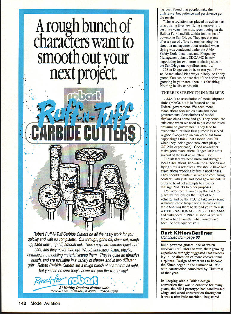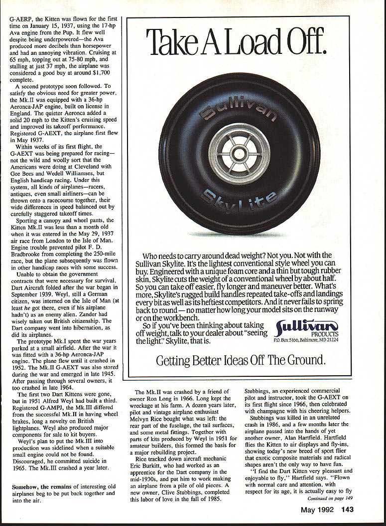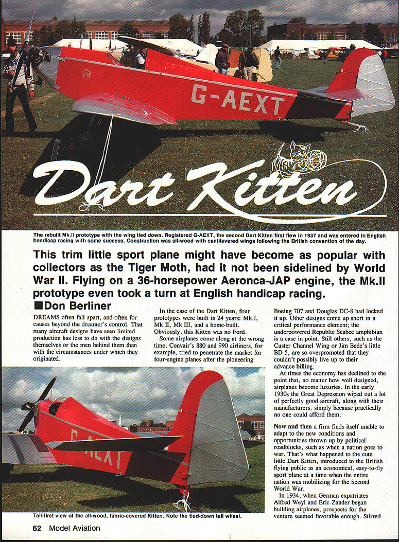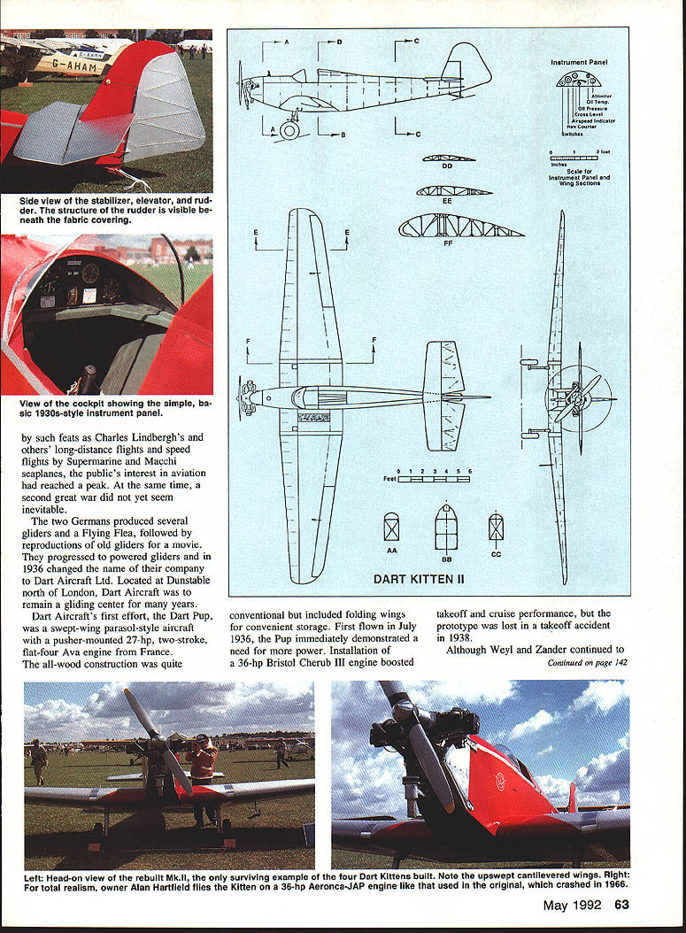 The rebuilt Mkii prototype wing tied down Registered G-AEXT second Dart Kitten first flew 1937 entered Engiish handicap racing some success Construction au-wood cantiievered wings foliowing British convention day trim little sport plane might have become popular collectors Tiger Moth sidelined World War II Flying 36-horsepower Aeronca-JAP engine Mkll prototype took turn English handicap racing EDon Berliner DREAMS often fall apart often causes beyond dreamers control aircraft designs have seen limited production has less designs themselves men behind circumstances under originated case Dart Kitten four prototypes built 24 years MkI MkII MkIll home-built Obviously Kitten no Ford Some airplanes come along wrong time Convairs 880 990 airliners example tried penetrate market four-engine planes after pioneering Boeing 707 Douglas DC-8 locked up Other designs come up short critical performance element underpowered Republic Seabee amphibian case point Still others such Custer Channel Wing Jim Bedes little BD-5 overpromoted couldnt possibly live up advance billing times economy has declined point no matter well designed airplanes become luxuries early 1930s Great Depression wiped out lot perfectly good aircraft along manufacturers simply because practically no could afford Now firm finds itself unable adapt new conditions opportunities thrown up political roadblocks such nation goes war Thats what happened cute little Dart Kitten introduced British flying public economical easy-to-fly sport plane time entire nation mobilizing Second World War 1934 German expatriates Alfred Weyl Eric Zander began building airplanes prospects venture seemed favorable enough Stirred 62 Model Aviation View cockpit showing simple ba sic 1 930s-style instrument panel such feats Charles Lindberghs others long-distance flights speed flights Supermarine Macchi seaplanes publics interest aviation reached peak same time second great war did yet seem inevitable two Germans produced several gliders Flying Flea followed reproductions old gliders movie progressed powered gliders 1936 changed name company Dart Aircraft Ltd Located Dunstable north London Dart Aircraft remain gliding center years Dart Aircrafts first effort Dart Pup swept-wing parasol-style aircraft pusher-mounted 27-hp two-stroke flat-four Ava engine France all-wood construction quite S F 00 DD FF m P 00 AIeped Indicate COUfltr witch. 0I2mM Scale fOr InatrUmellt Panel Wing SeCtIOnS SB DART KITTEN II S 4 AA conventional included folding wings convenient storage First flown July 1936 Pup inunediately demonstrated need power Installation 36-hp Bristol Cherub Ill engine boosted takeoff cruise performance prototype lost takeoff accident 1938 Although Weyl Zander continued May 1992 63 Side view the elevator rud der structure rudder visible neath fabric covering Continued page 142 sour uaro tuuen uulloupow~ . Aeronca-JAP engine like usuu original hed rough bunch characters want smooth out next project 9- / Hobby Dealers Nationwide PG Box 1247 St Charles IL 60174 708-584-7616 has found people make difference patience persistence get results association has p]ayed active part acquiring five new flying sites over past five years recent being Balboa Park landfill within four miles downtown San Diego got after year effort emphasizing situation management resulted flying conducted under AMA Safety Code Insurance Frequency Management plans SDCAMC now negotiating two modeling sites San Diego metropolitan area San Diego can can Form Association Plan ways help hobby grow can sure hobby isnt growing area shrinking Nothing life stands still THERE IS STRENGTH IN NUMBERS AMA association model airplane clubs MAC focused Federal government need associations focused state local governments Associations model airplane clubs come go come existence need put concentrated pressure government tend evaporate after first purpose served good five-year plan can keep happening think associations fail lack good newletter despite GSLMA experience Good newletters make good associations Roger Jaffe edits several best newsletters see think need stronger local associations because attack flying sites relentless should have associations working before need arises should maintain active continuing contacts state local governments order head off attempts close reassign MAPTs other purposes Consider recent moves FAA place restrictions flight RC vehicles FCC take away some Amatuer Radio frequencies case AMA defend interests AT THE NATIONAL LEVEL AMA disbanded 1982 soon new RC channels what would have consequences Kitten/Berliner Continued page 63 build powered gliders survived until after war growing experience strongly suggested success lay direction conventional airplanes Design what become Kitten began summer 1936 construction completed Christmas year keeping British design convention continue years MkI prototype cantilevered wings wood construction throughout trim little machine Registered 142 Model Aviation Robart Ruff-N-Tuff Carbide Cutters nasty work quickly no complaints Cut through grind off clear out rough up sand down rip off smooth out guys carbide-quick cool never load up Wood fiberglass lexan plastic ceramics no modeling material scares Theyre quite abrasive bunch available variety shapes two different grits Robart Carbide Cutters rough bunch characters right can sure theyll never rub wrong way G-AERP Kitten flown first time January 15 1937 using 17-hp Ava engine Pup flew well despite being underpoweredthe Ava produced decibels horsepower annoying vibration Cruising 65 mph topping out 75-80 mph stalling just 37 mph airplane considered good buy around $1700 complete second prototype soon followed satisfy obvious need greater power MkII equipped 36-hp Aeronca-JAP engine built license England quieter Aeronca added solid 20 mph Kittens cruising speed improved its takeoff performance Registered G-AEXT airplane first flew May 1937 Within weeks its first flight G-AEXT being prepared racing wild wooll