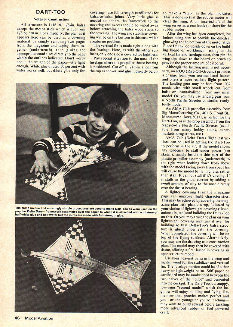 U. U U U U U U U U U UUUU U mu. U. U U U U U U Delta Dart built hundreds thousands Dart-Too second step using design tool developing beginning modelers skills Designed Frank Ehling Text Hobie Steele THE DART-TOO AMA project conceived like its predecessor Delta Dart also known AMA Cub Frank Ehling Technical Director Academy Model Aeronautics off-duty hours Frank donated design did Delta Dart MOD EL AVIATION tool used second step developing beginners aeromodeling skill Dart-Too uses AMA Cub wing tail designed follow-up AMA Cub provides additional feeling accomplishment builder because fuselage profile nearly resembles full-scale aircraft does basic AMA Cub allows beginner produce second model can built approximately same time about hour AMA Cub further develops ability work hands much preferred stepping up too-complicated model result drop before comple tion Some may feel Dart-Too sufficiently advanced AMA Cub has found building two three AMA Cubs model advances workmanship young modelers skill dexterity pro gresses understanding also increases model completed Like AMA Cub Dart-Too can used class room teaching fundamentals aerodynamics geometry mathematics also providing student satisfaction carrying project through comple tion pleasure flight continued page 46 July1975 43 DART-TOO Notes Construction structure 1/16 X 1/8-in balsa except motor stick cut 1/8 X 3/8 simplicity plan appears can used covering material simply removing two pages magazine taping gether underneath gluing appropriate wood sizes directly page within outlines indicated Dont worry about weight paperits light enough White glue diluted 50 percent water works well dilute glue coveringuse full strength undiluted balsa-to-balsa joints Very little glue needed adhere framework covering excess should wiped away before attaching balsa wood strips covering wing stabilizer cover ing will bottom case creates no problem vertical fin made right along fuselage other sur faces side covered lightness Pay special attention nose fuselage propeller thrust bearing positioned Cut off 1/16-in slice top shown glue directly below make step plan indicates done rubber motor will clear wing pin inserted aft wing serves rear hook anchor rubber motor After wing has completed before being bent provide dihedral glue wing bottom motor stick Place Delta-Too upside down build ing board workbench resting vertical fin fuselage nose pin wing tips down board bench provide proper amount dihedral Although landing gear neces sary ROG Rise-Off-Ground provides change normal hand launch offers realistic flight pattern landing gear may bent 032 music wire small wheels cut balsa cannabalized small model may use landing gear North Pacific Skeeter similar readyto-fly model An AMA Cub propeller assembly Sig Manufacturing Co 401 S Front St Montezuma Iowa 50171 perfect Dart-Too prop assembly ready-to-fly North Pacific Skeeter avail able hobby shops super markets drug stores etc AMA Cub Delta Dart flight instruc tions can used getting Dart-Too perform air model shows tendency stall under power see sketch simply bend thin part plastic propeller assembly underneath right looking down above model facing away will cause model fly circles rather stall cannot stall its circling stalls glide correct adding small amount clay nose directly over thrust bearing lighter covering magazine page can improve flight characteristics may achieved covering mag azine plan plastic wrap followed choice lightweight covering tissue onionskin etc building Delta-Too may trace plan lightweight covering turn over building Delta-Toos balsa struc ture glued underneath covering completed covering will top flying surfaces Alternatively may use drawing construction plan model may covered tissue offering first lesson covering open structure model Use heaviest balsa wing lighter wood stabilizer vertical fin fuselage portion could either heavy lightweight balsa Stiff paper cardboard may sandwiched between two halves pilot cemented cockpit Dart-Too snapp low-wing second model ginner will enjoy building flying Re member practice makes perfect youor youngster youre teachingmay want build several before tackling advanced rubber fuel powered craft 46 Model Aviation same unique amazingly simple procedures used make DartToo used popular Delta Dartframawork assembles over paper tQ attached mixture half white- t tk inin* ~4ik