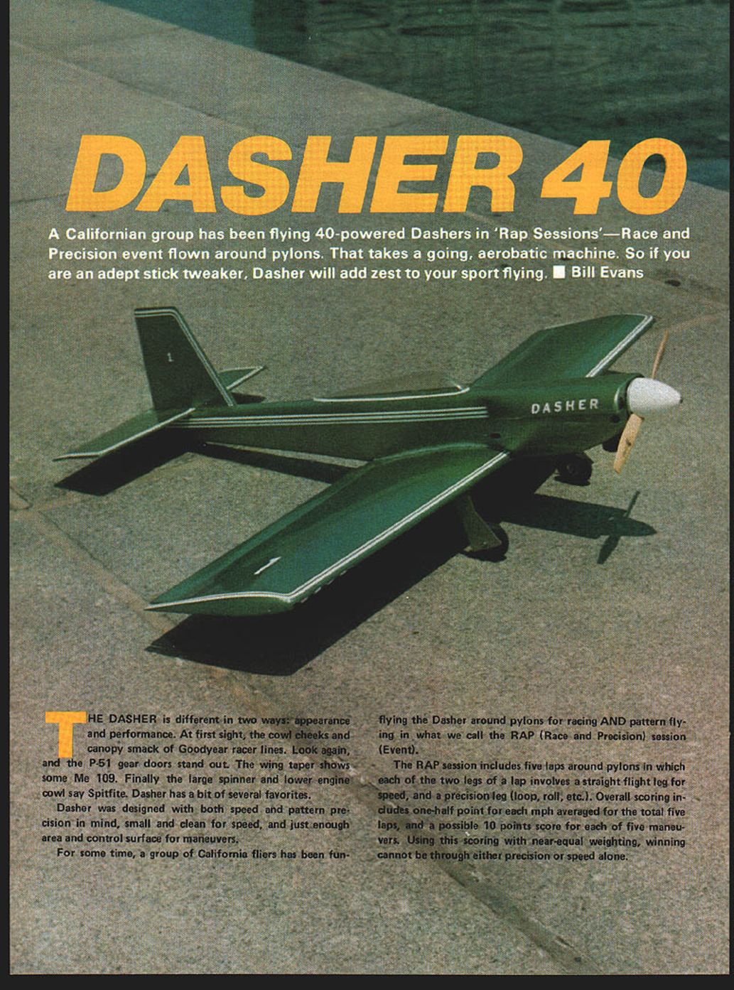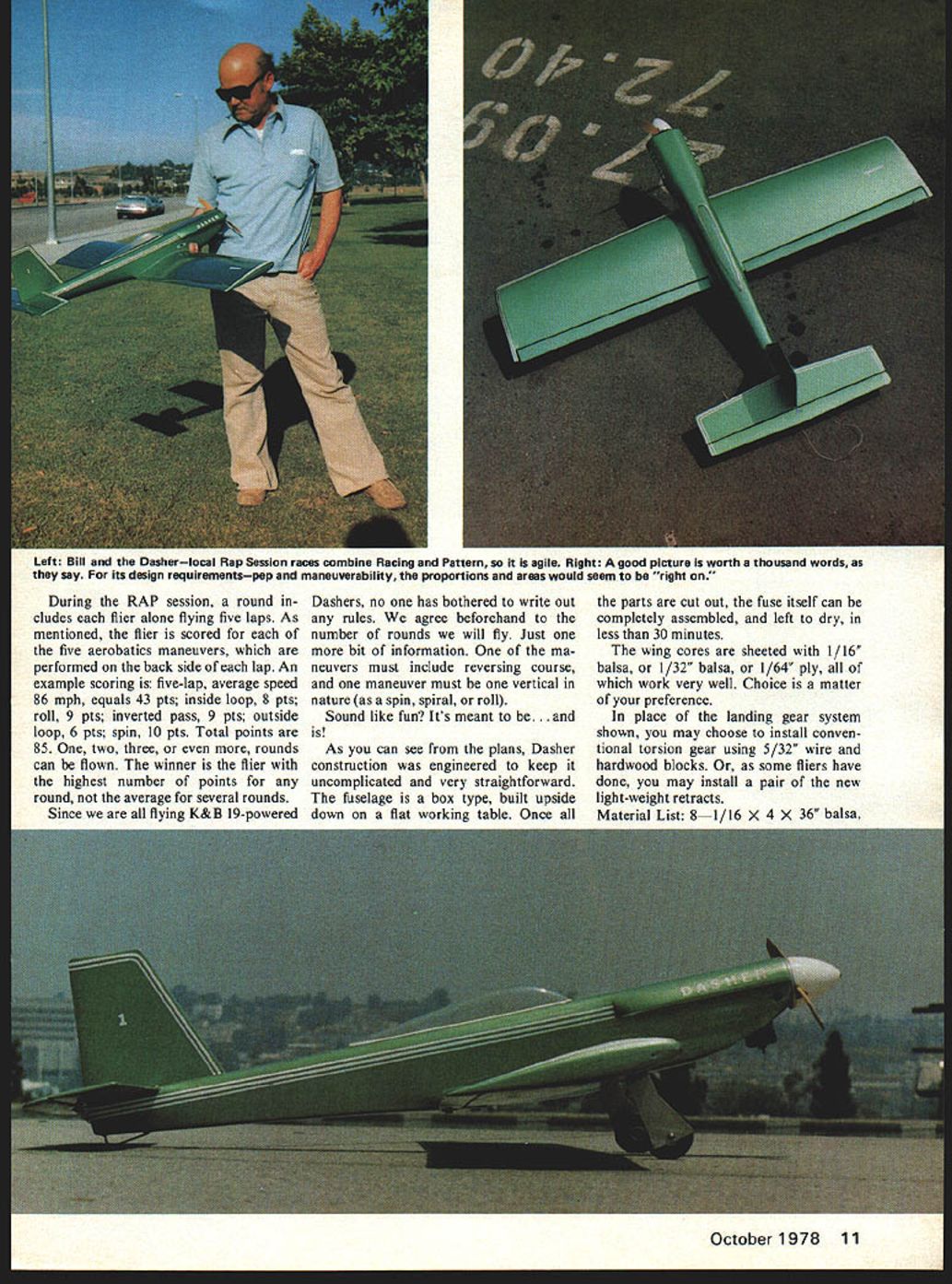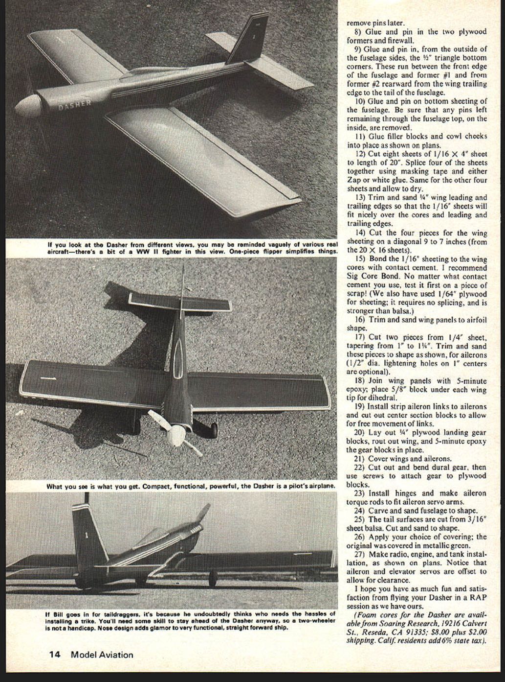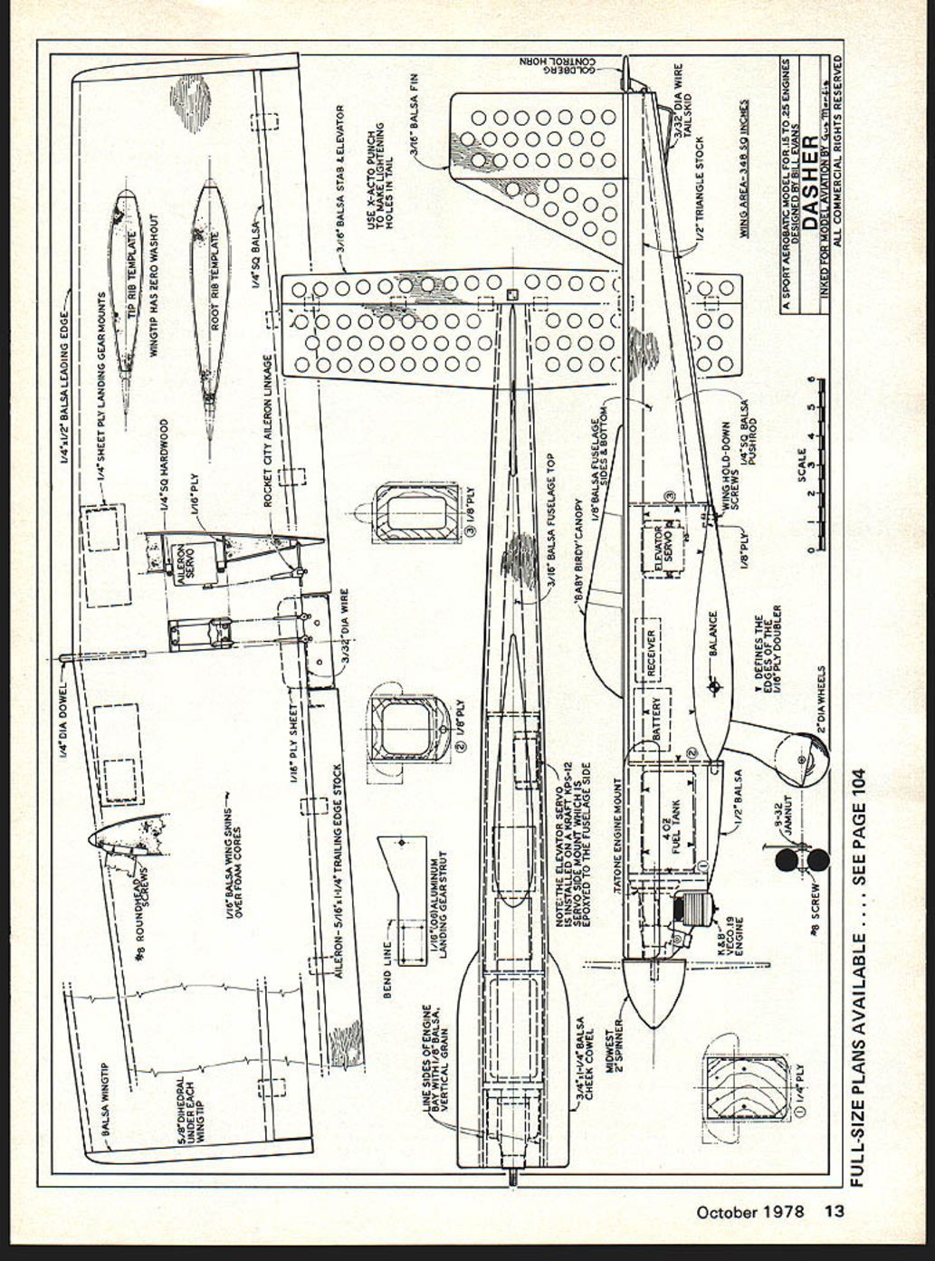 NO OCR TEXT Left Bill Dasherlocal Rap Session races combine Racing Pattern agile Right good picture worth thousand words say its design requirementspep maneuverability proportions areas would seem right During RAP session round cludes flier alone flying five laps As mentioned flier scored five aerobatics maneuvers performed back side lap An example scoring five-lap average speed 86 mph equals 43 pts inside loop 8 pts roll 9 pts inverted pass 9 pts outside loop 6 pts spin 10 pts Total points 85 One two three rounds can flown winner flier highest number points round average several rounds Since flying K&B 19-powered Dashers no has bothered write out rules agree beforehand number rounds will fly Just bit information ma neuvers must include reversing course maneuver must vertical nature spin spiral roll Sound like fun Its meant be. an see plans Dasher construction engineered keep uncomplicated very straightforward fuselage box type built upside down flat workin2 table Once parts cut out fuse itself can completely assembled left dry less 30 minutes wing cores sheeted 1/16 balsa 1/32 balsa 1/64 ply work very well Choice matter preference place landing gear system shown may choose install conven tional torsion gear using 5/32 wire hardwood blocks some fliers have done may install pair new light-weight retracts Material List 81/16 x 4 X 36 balsa October1978 11 33/16 X 3 X 36 balsa 13/16 X 4 X 36 balsa 2 36 balsa Plywood 1/64 ply optional wing sheeting ply formers Y4 ply fire wall Construction 1 Read instructions several times thoroughly understand 2 Cut four pieces out sheet Yt balsa 3 Glue pin strips leading trailing edges foam wing panels sure keep panels bending warping pinning strips Set assembly aside dry 4 Cut out fuselage parts top doublers sides formers etc Note fuse top cut shape shown plans 5 Lay fuselage top flat surface pin down 6 Run bead glue top inside edge fuselage sides pin fuselage top 7 Glue pin length ngle along top inside edge fuselage Push pins angle outside fuselage will make easy 12 Model Aviation met re feelingit could Thompson Mustangs shot Right Perched authors field box aircraft seems compact business-like Mostly straight lines -114DIA DOWELI/4xI/2 BALSA LEADING EDGE 1/4 SHEET PLY LAN DING GEAR MOUNTS BALSA WINGTIP1 *8 IIL____ _____ 5/8 DIHEDRAL UNDER EACH SERVO1/16 PLY- WINGTIP 1/16 BALSA WING SKINS OVER FOAM CORES ROCKET CITY AILERON LINKAGE ___ PLY SHEETI..2 Ioo 3/16 BALSA STAB &ELEVATOR -.0USE X-ACTO PUNCH TO MAKE LIGHTENING BEND LINE0HOLES IN TAIL 03/16BALSA FIN BAY WITH I/B BALSAI/16L06ALUMINUM ______- o / NOTETHE ELEVATOR SERVO3/16 BALSA FUSELAGE TOP00Q0 0 IS INSTALLED ON KRAFT KPS-12 0 SERVO SIDE MOUNT WHICH ISBABY BIRDYCANOPY-s\JyJ JJZ EPOXYED TO THE FUSELAGE SIDE0000QO TATONE ENGINE MOUNT ____________________________________________________________[v32][b2596161417600]] SIDES & BOT0000 3/4xI-I/4 BALSA CHEEK COWEL MIDWEST 2SPINNER F/ t dQ PLY ENGINEI/2BALSAI/BPLYI/4SQ BALSA_________________ V DEFINES THEPUSHROD EDGES OF THE 1116PLY DOUBLER SPORT AEROBAlIC MODEL FOR 15 T025 ENGINES B SCREW~L _____________________iiZIIIZiiLIZII SCALED SIGNED BY BIA DIA WHEELSBY C ALL RESERVEO FULL-SIZE PLANS AVAILABLE .. SEE PAGE 104 WING AREA-34B som~ DASHER U 0 0 -I 0 0 CD 0 -a look Dasher different views may reminded vaguely various real aircrafttheres bit WW II fighter n imw Ona-niata flinnar ImnliflaR thina II bill goes Tor tammaraggers S necause ne unaouoioaiy iruinxs wno nougs nassIes UT installing trike Youll need some skill stay ahead Dasher anyway two-wheeler handicap Nose design adds glamor very functional straight forward ship 14 Model Aviation remove pins later 8 Glue pin two plywood formers firewall 9 Glue pin outside fuselage sides ngle bottom corners run between front edge fuselage former #1 former #2 rearward wing trailing edge tail fuselage 10 Glue pin bottom sheeting fuselage sure pins left remaining through fuselage top inside removed 11 Glue filler blocks cowl cheeks place shown plans 12 Cut eight sheets 1/16 X 4 sheet length 20 Splice four sheets together using masking tape either Zap white glue Same other four sheets allow dry 13 Trim sand leading trailing edges 1/16 sheets will fit nicely over cores leading trailing edges 14 Cut four pieces wing sheeting diagonal 9 7 inches the2OX 16 sheets 15 Bond 1/16 sheeting wing cores contact cement recommend Sig Core Bond No matter what contact cement use test first piece scrap also have used 1/64 plywood sheeting requires no splicing stronger balsa 16 Trim sand wing panels airfoil shape 17 Cut two pieces 1/4 sheet tapering 1 1 / Trim sand pieces shape shown ailerons 1/2 dia lightening holes 1 centers optional 18 Join wing panels 5-minute epoxy place 5/8 block under wing tip dihedral 19 Install strip aileron links ailerons cut out center section blocks allow free movement links 20 Lay out ood landing gear blocks rout out wing 5-minute epoxy gear blocks place 21 Cover wings ailerons 22 Cut out bend dural gear use screws attach gear plywood blocks 23 Install hinges make aileron torque rods fit aileron servo arms 24 Carve sand fuselage shape 25 The tail surfaces cut 3/16 sheet balsa Cut sand shape 26 Apply choice covering original covered metallic green 27 Make radio engine tank instal lation shown plans Notice aileron elevator servos offset allow clearance hope have much fun satis faction flying Dasher RAP session have Foam cores Dasher avail able Soaring Research 19216 Cal vert St Reseda CA 9133S $800 plus $200 shipping Calif residents add 6% state t