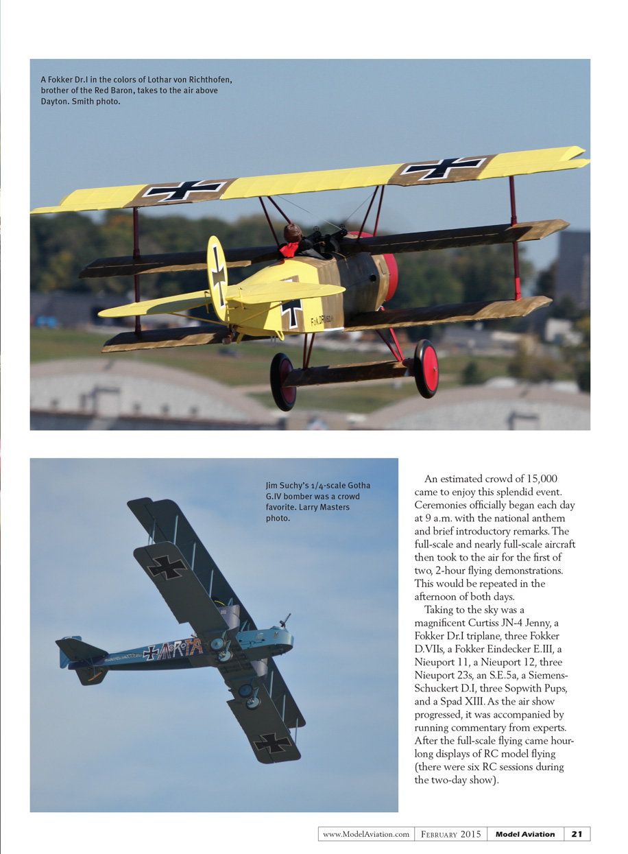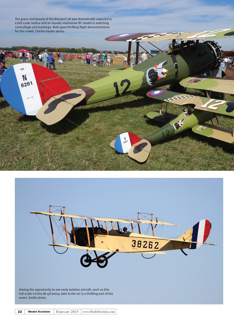 Taking to the sky was a magnificent JN-4 Jenny, a Fokker Dr.I triplane, three Fokker D.VIIs, a Fokker Eindecker E.III, a Nieuport 11, a Nieuport 12, three Nieuport 23s, an S.E.5a, a Siemens-Schuckert D.I, three Sopwith Pups, and a Spad XIII. As the air show progressed, it was accompanied by running commentary from experts. After the full-scale flying came hour-long hour displays of RC model flying (there were six RC sessions during the two-day show).