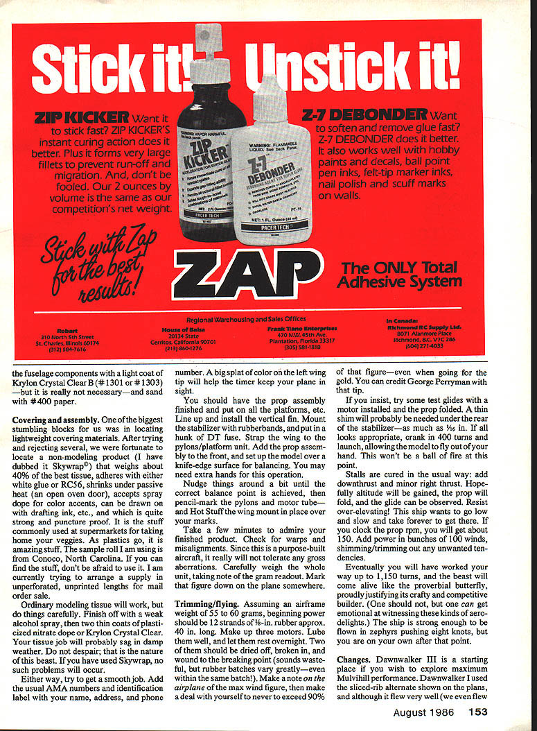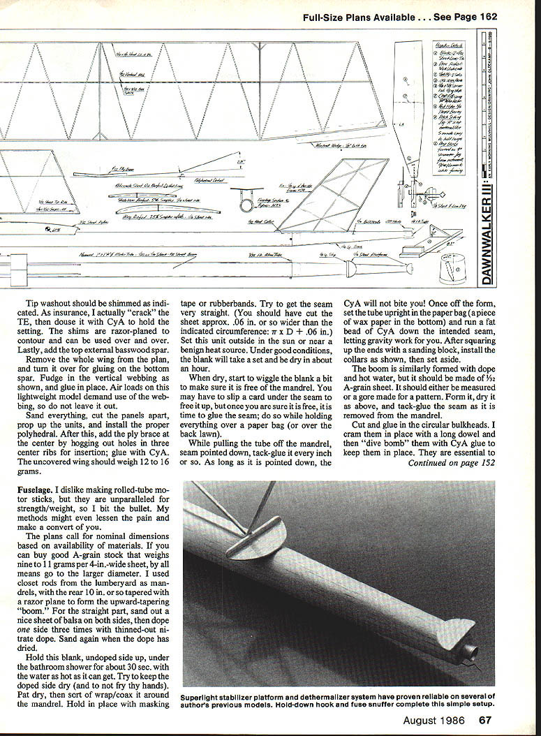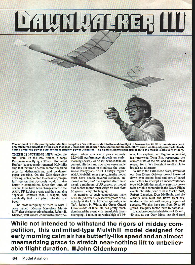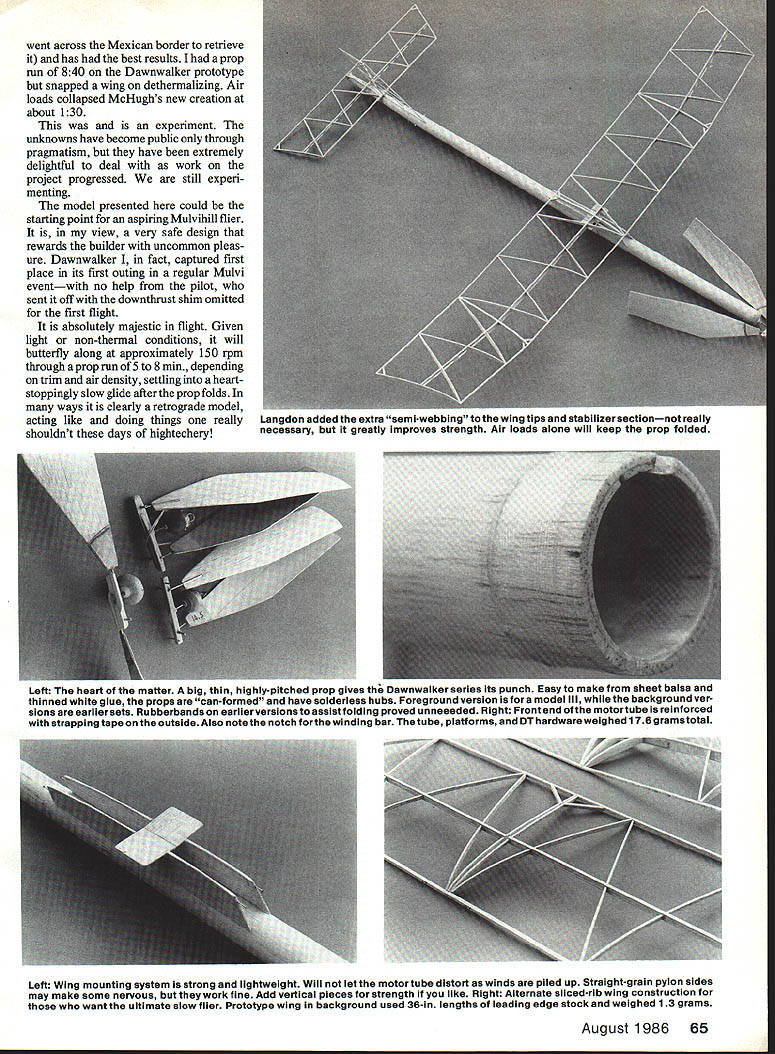 The moment truth prototype builder Bob Langdon few milliseconds maiden flight Dawnwalker Ill rubber wound only400turns winds less ideal model clocked absolutely magnificent 330 prop leading edge profile clearly flaring under power burst efficient power utilization no-frills lightweight approach model also very evident THERE IS NOTHING NEW under sun True late Sixties George Perryman flying 2-oz Unlimited Rubber subsequently renamed Mulvihill ship featured 5-mm motor run fixed prop dethermalizing condenser paper covering Zaic three-view drawing notes pointed heavier regu lar version obviously would survive better competition Since time course have changes both AMA FF Rubber events emerging special contests suspect will eventually find place rule book intriguing what once named Meuser Marvelous Mulvi hill after innovative founder Robert B Meuser well known columnist/author/de signer aim probe ultimate Mulvihill performance through earlymorning dawn one-shot winner-take-all contest now rules simple foxy order eliminate occa sional Pennyplane F iD entry regular AMA Mulvihill rules applyplusthe model must have double-covered surfaces en closed motor airplane itself must weigh minimum 30 grams model rubber motor must weigh no less 60 grams Very challenging number such competitions have staged over past seven years notably US FF Championships Taft Robert P White Great Grand Gumbandito has pretty much dominated event remarkable times averaging 11 mm high 14 min airplane 80-gram version renowned Twin Fin represents current state art have great respect thought worthwhile broach alternate 1984 Reno Nats several San Diego Orbiteer crowd hunkered down over casino food sort dared other attempt indoor/outdoortype Mulvihill might eventually prove viable contender Dawn Flight events date four us Charlie Yost Robert Langdon Don McHugh author have built flown eight pre tenders task varying degrees success Weights have run 50 80 grams Fragility factor zero passable Langdon recorded high time 15 min 40 sec Otay Mesa test field intended withstand rigors midday com petition unlimited-type Mulvihill model designed early morning calm air has butterfly-like speed almost mesmerizing grace stretch near-nothing lift unbeliev able flight duration EJohn Oldenkamp 64 Model Aviation went across Mexican border retrieve has best results prop run 840 Dawnwalker prototype snapped wing dethermalizing Air loads collapsed McHughs new creation about 130 experiment unknowns have become public through pragmatism have extremely delightful deal work project progressed still experi menting model presented could starting point aspiring Mulvihill flier view very safe design rewards builder uncommon pleas ure Dawnwalker fact captured first place its first outing regular Mulvi eventwith no help pilot sent off downthrust shim omitted first flight absolutely majestic flight Given light non-thermal conditions will butterfly along approximately 150 rpm through prop run 5 8 mm depending trim air density settling heart stoppingly slow glide after prop folds ways clearly retrograde model acting like doing things really shouldnt days hightechery Left heart matter big thin highiy-pitched prop gives th Dawnwaiker series its punch Easy make sheet balsa thinned white glue props can-formed have soiderless hubs Foreground version fora model lii whiie background ver sions eariier sets Rubberbands earlierversions assist folding proved unneeeded Right Front end motortube reinforced strapping tape outside Also note notch forthe winding bar tube piatforms DT hardware weighed 176 gramstotal Left Wing mounting system strong lightweight Wili let motor tube distort winds piled up Straight-grain pylon sides may make some nervous work fine Add vertical pieces strength like Right Alternate sliced-rib wing construction want ultimate slow flier Prototype wing background used 36-in lengths leading edge stock weighed 13 grams August 1986 65 angaon aaaea extra semi-webbing wing tips stabilizersectionnot really necessary greatly improves strength Air loads alone will keep prop folded discovery process has answered some questions Lightweights need fly slowly once upset invariably go power stall speed up dash earth discouraging results tricky ground turbulence seem need inordinate amount power-robbing downthrust cure foregoing However given light air performance ab solutely astoundingly magnificent think will disappointed try Construction Target weight fin ished model less rubber motor 55 grams Selection materials very im portant thoughtful use glue Proper ly done will hit mark end up attractive reasonably robust machine Weigh everything ahead time good triple beam balance scale discard parts grossly overweight As guidelines balsa sheet weights about follows motor tube blank 345 x 36 95 grams rib sheet stock 3 x 36 Bgrain 12 grams wing leading edge LE trailing edge TE stock /32 x rams etc Some 6-lb stock actually stronger 10 12-lb stock depending grain makeup Propeller might want start unit since somewhat different norm blade outlines should cut laid up thinned white glue form similar plan No need soak blades Merely tape position separated wax paper set aside few days dry hub little block spruce cut drilled size relieved shaft front rubbed out Hot Stuff hardening prop folder stops glued after installation hangers last step photos should help explain Suffice say solderless hub unit comes out very light being strong enough task After prop blades dry should edge-sanded covered dope tissue bottom cut made inlet tubing carries hangers glued place cyanoacrylate CyA plywood cheeks put place Form hangers simple wire Ls test-fit tubing inlets Set blade pitch jig proper orientation tape hanger down 900 thrust line gob 5min epoxy will hold together Once both blades done mounted hub kept place short lengths tubing glued outer ends hangers well should have prop unit nominal 23 diameter 30 pitch hub spring washers target weight 12 14 grams Stabilizer/fin Build next Use wood sizes show