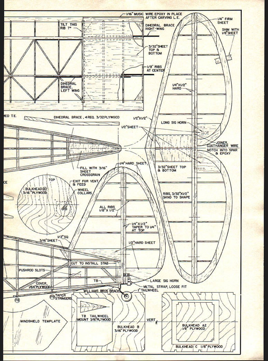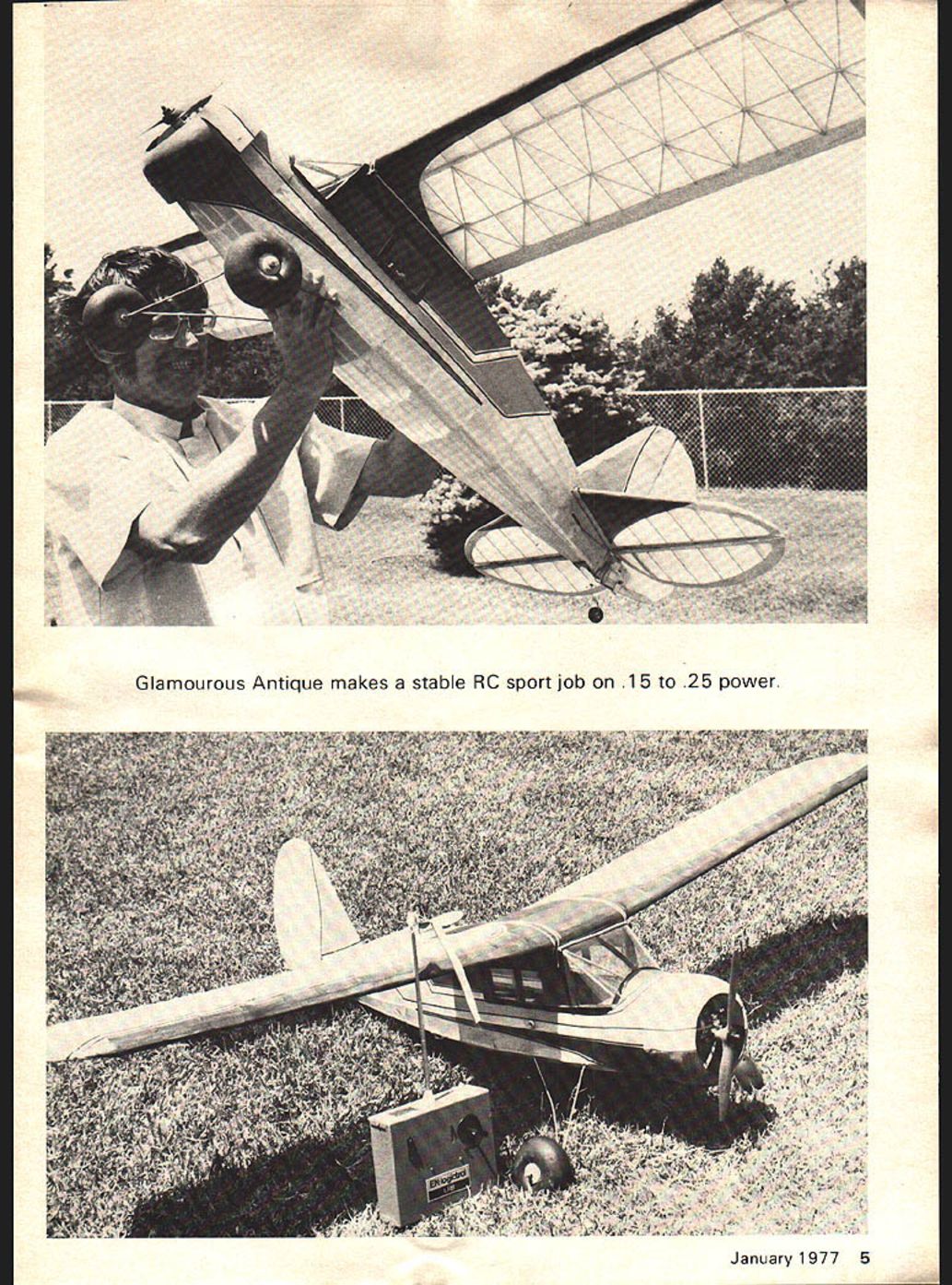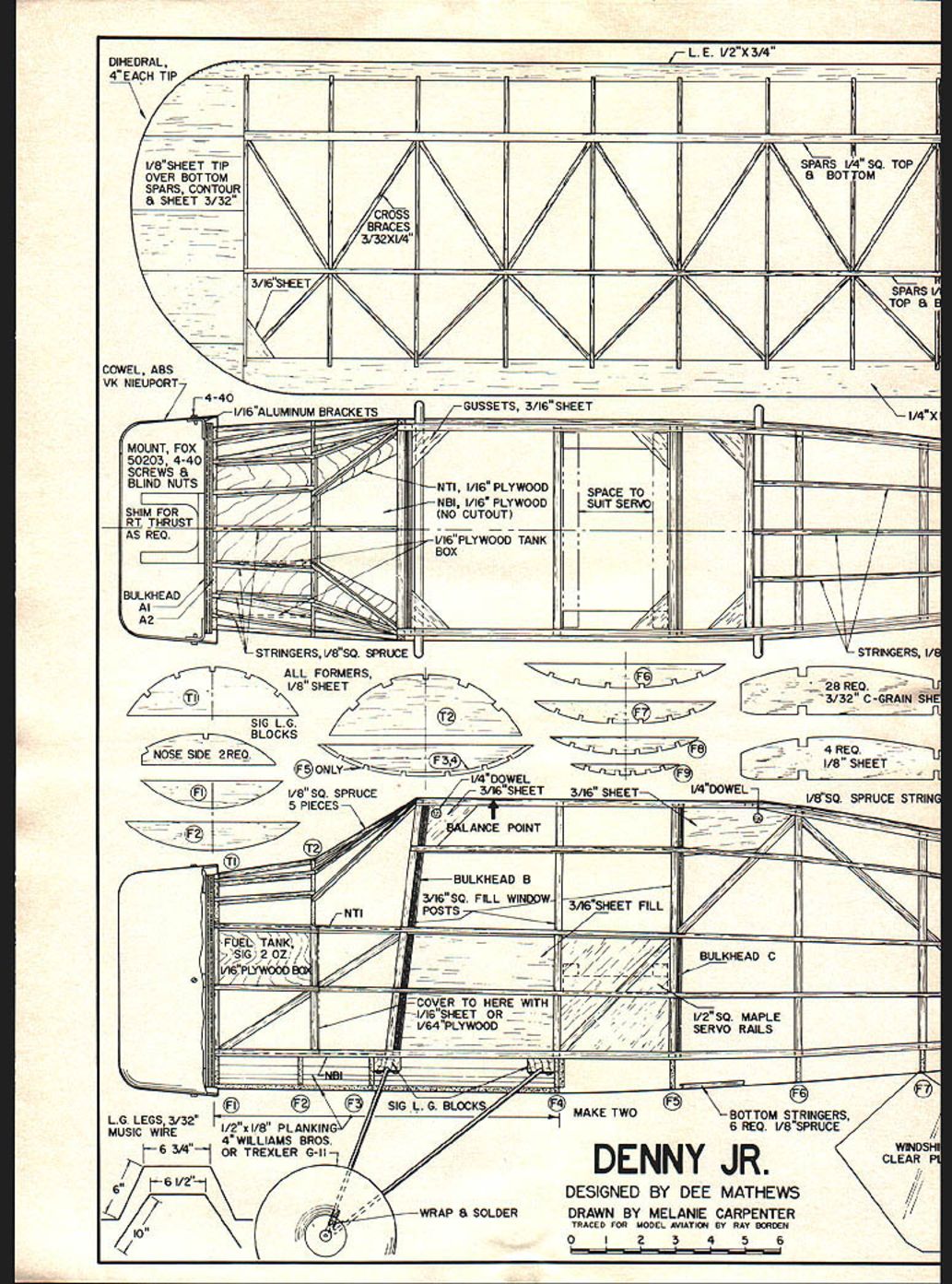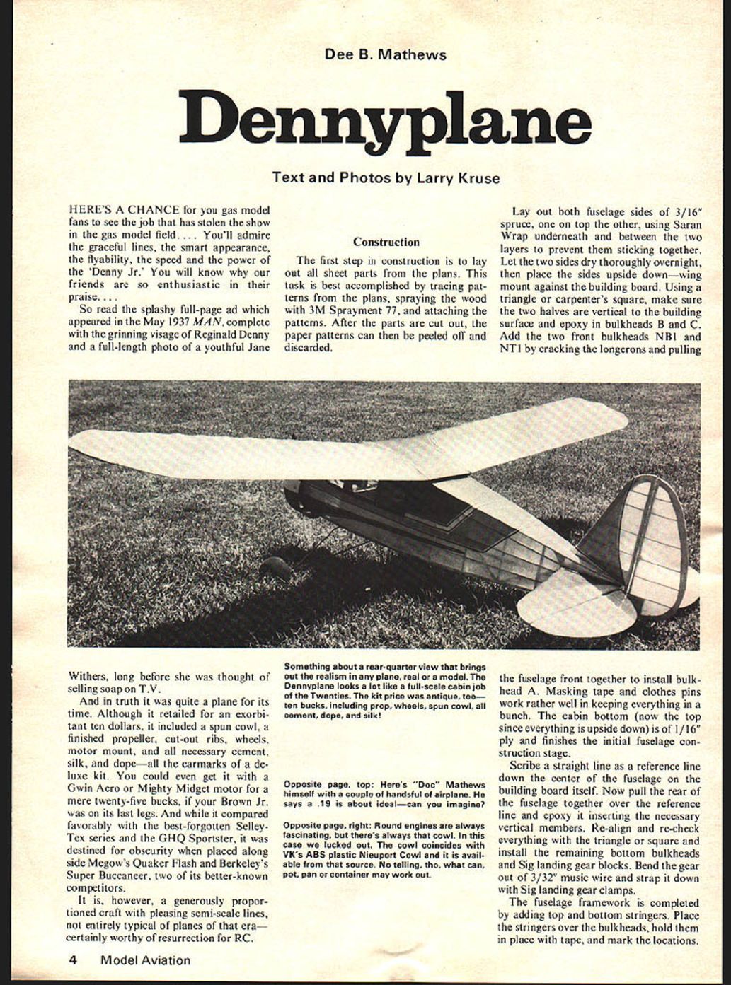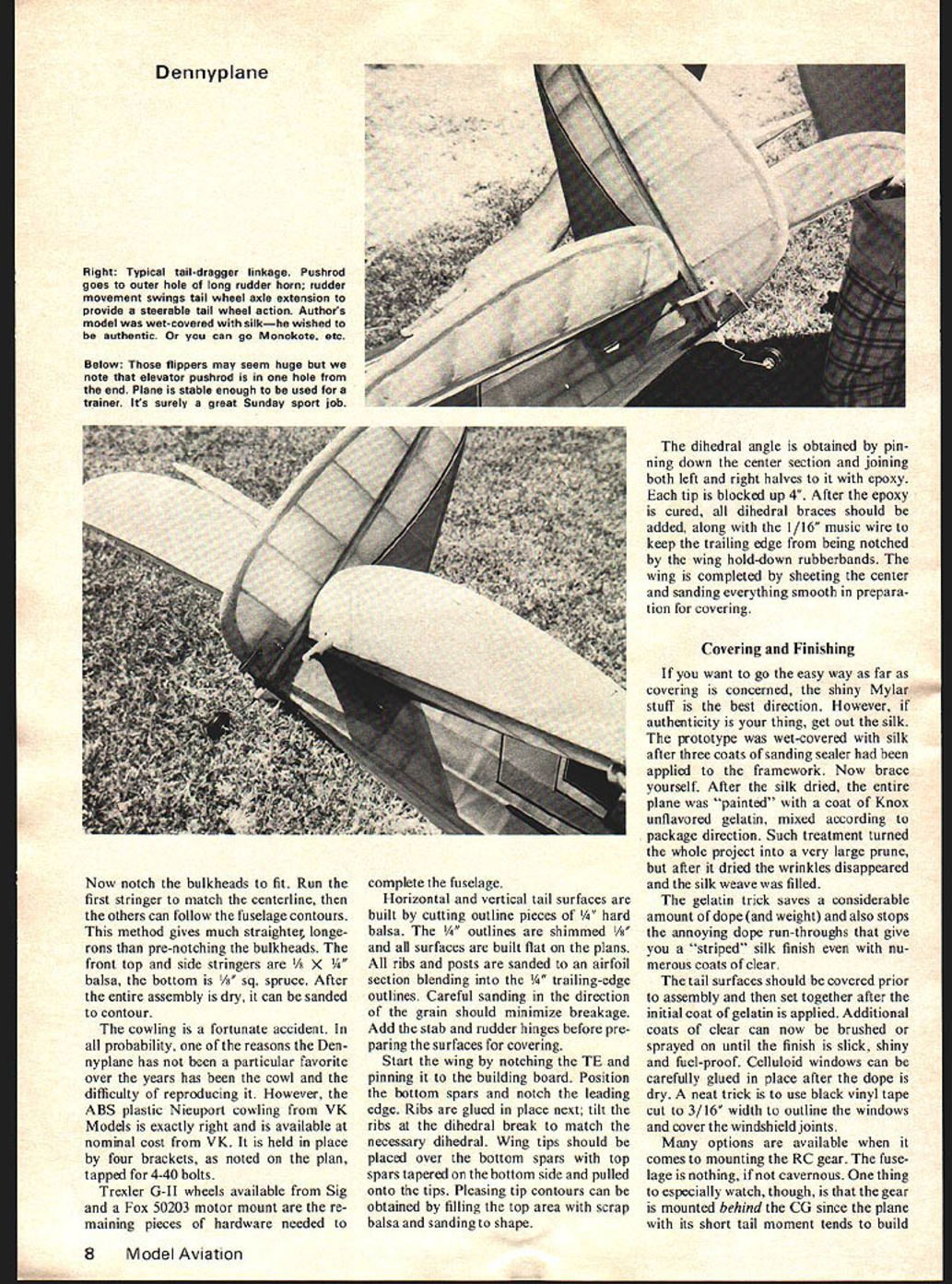 Dee B Mathews Dennyplane Text Photos Larry K ruse HERES CHANCE gas model fans see job has stolen show gas model field. l admire graceful lines smart appearance flyability speed power Denny Jr will know friends enthusiastic praise.. So read splashy full-page ad appeared May 1937 MAN complete grinning visage Reginald Denny full-length photo youthful Jane Withers long before thought selling soap TV truth quite plane its time Although retailed exorbi tant ten dollars included spun cowl finished propeller cut-out ribs wheels motor mount necessary cement silk dopeall earmarks de luxe kit could get Gwin Aero Mighty Midget motor mere twenty-five bucks Brown Jr its last legs compared favorably best-forgotten Selley Tex series GHQ Sportster destined obscurity placed along side Megows Quaker Flash Berkeleys Super Buccaneer two its better-known competitors however generously propor tioned craft pleasing semi-scale lines entirely typical planes era certainly worthy resurrection RC Construction first step construction lay out sheet parts plans task best accomplished tracing pat terns plans spraying wood 3M Sprayment 77 attaching patterns After parts cut out paper patterns can peeled off discarded Opposite page top Heres Doc Mathews himself couple handsful airplane says 19 about idealcan imagine Opposite page right Round engines always fascinating theres always cowl case lucked out cowl coincides VKs ABS plastic Nieuport Cowl avail able source No telling tho what can pot pan container may work out Lay out both fuselage sides 3/16 spruce top other using Saran Wrap underneath between two layers prevent sticking together Let two sides dry thoroughly overnight place sides upside down wing mount against building board Using triangle carpenter s square make sure two halves vertical building surface epoxy bulkheads B C Add two front bulkheads NBl NT1 cracking longerons pulling fuselage front together install bulk head Masking tape clothes pins work rather well keeping everything bunch cabin bottom now top since everything upside down 1/16 ply finishes initial fuselage con struction stage Scribe straight line reference line down center fuselage building board itself Now pull rear fuselage together over reference line epoxy inserting necessary vertical members Re-align re-check everything triangle square install remaining bottom bulkheads Sig landing gear blocks Bend gear out 3/32 music wire strap down Sig landing gear clamps fuselage framework completed adding top bottom stringers Place stringers over bulkheads hold place tape mark locations 4Model Aviation Something about rear-quarter view brings Out realism plane real model Dennyplane looks lot like full-scale cabin job Twenties kit price antique too ten bucks including prop wheels spun cowl cement dope silkl Glamourous Antique makes stable RC sport job 15 25 power January 1977 5 DIHEDRAL 4EACH 1IP 7cz _________ ____ _______I_______ I/BTIP OVER BOTTOM SPARS CONTOUR B SHEET 3/32 3/16I-EET CROSS BRACES 3/32X1/4 COWEL ABS - VK NIEUPORT 4-40 I/16ALUMINUM BRACKETS MOUNT FOX 50203 4-40 SCREWS 8 BLIND NUTS SHIM FOR RT THRUST ___________ AS REQ BULKHEAD Al x / L 7, rLE V2X3/4 / / p GUSSETS 3/16 SHEET / 4 NTI 1/16 PLYWOOD NBI 1/16 PLYWOOD NO CUTOUT 1/16 PLYWOOD TANK BOX NGERS VBSO SPRUCE Li ALL FORMERS I/B SHEET SIG LG BLOCKS NOSE SIDE 2REO ONLY 1/4 DO WEL I3/16SHEET I/B SQ SPRUCE5 P1 ANCE POINT / BULKHEAD B IFILL WIN W pNTI/ SPACE TO / 7 SFARS 8 BOT / SQ TOP 0M SPARS TOP B I/4X III LJ~- STRINGERS 1/8 -6 3/32 C-GRAIN SHE F ~EQ7I j/BSHEE 3/16 SHEET1/4 DOWEL-1I/8SQ SPRUCE STRINC IHEET FILL 1vN #JEL TANK I BULKHEAD C 7j11 x 7II I6PLYWOOO 7 II5BCOVER TO HERE WITH OR- , \ SIG LG BLOCK~ LG LEGS 3/32 MUSIC WIRE I/2x I/B PLANKING 4 WILLIAMS BROS 6 3A4j OR TREXLER G-Ii 6K6 I/2j - WRAP B SOLDER 10 - MAKE TWO IKN~ I/2SQ MAPLE SERVO RAILS @BOTTOM STRINGERS 6 REQ 1/8~SPRUCE DENNY JR DESIGNED BY DEE MATHEWS DRAWN BY MELANIE CARPENTER TRACED FOR MODEL AVIATION BY RAY BORDEN 0I 23456 WINDSHI CLEAR P1 / / TILT THISII RIB 7 N 4F ii L - -DIHEDRAL BRACE LEFT WING 4-Ji- I-jI-II III II I__ II-H-_ IIII I7JZL __14II II -- H I4- r 1/16 MUSIC WIRE EPOXY IN PLACE _____ AFTER CARVING L E y DIHEDRAL BRACE / RIGHT WING/ 1// _3/32SHEET TOPS BOTTOM7 / I I/B RIBS AT CENT / 1/4 XI/2 / /HARD /1 _____I II I/2XV2 LONG SIG HORNN I/2SHEET 4 W--- DIHEDRAL BRACE 4 REQ 3/32 PLYWOOD r 4 FIRM SHEET \\SHIM WITH \V8SHEET III II OATHANGE WIRE ___ NOTCH INTO SPAR OXY II I/4HARD SHEE\____ CROSSGRAIN7 TOPEXIT FOR VENT BULKHEADWHEEL 3/16 PLYWOOD 6SHEET /I/2HARD SHEET / E SIG HORN N METALLOOSE FIT TAILWHEEL CUT TO INSTALL ZODSLOTS7YC II / / TB TAILWHEEL MOUNT 16PLYWOOO ii / WINDSHIELD TEMPLATE I/ BULKHEAD B /3/16 PLYWOOD / 1/ VERT BULKHEAD A2 1/8 PLYWOOD 7 BULKHEAD C 1/8 PLYWOOD /n /nI / ED TE Dennyplane Right Typical tail-dragger linkage Pushrod goes Outer hole long rudder horn rudder movement swings tail wheel axle extension provide steerable tail wheel action Authors model wet-covered silkhe wished suthentic can go Monokote etc Below Those flippers may seem huge note elevator pushrod hole end Plane stable enough used trainer Its surely great Sunday sport job Now notch bulkheads fit Run first stringer match centerline others can follow fuselage contours method gives much straighte longe rons pre-notching bulkheads front top side stringers /8 X a bottom /8 sq spruce After entire assembly dry can sanded contour cowling fortunate accident probability reasons Den nyplane has particular favorite over years has cowl difficulty reproducing However ABS plastic Nieuport cowling VK Models exactly right available nominal cost VK held place four brackets noted plan tapped 4-40 bolts Trexler G-II wheels available Sig Fox 50203 motor mount re maining pieces hardware needed complete fuselage Horizontal vertical tail surfaces built cutting outline pieces balsa ines shimmed surfaces built flat plans ribs posts sanded airfoil section blending /4 trailing-edge outlines Careful sanding direction grain should minimize breakage Add stab 