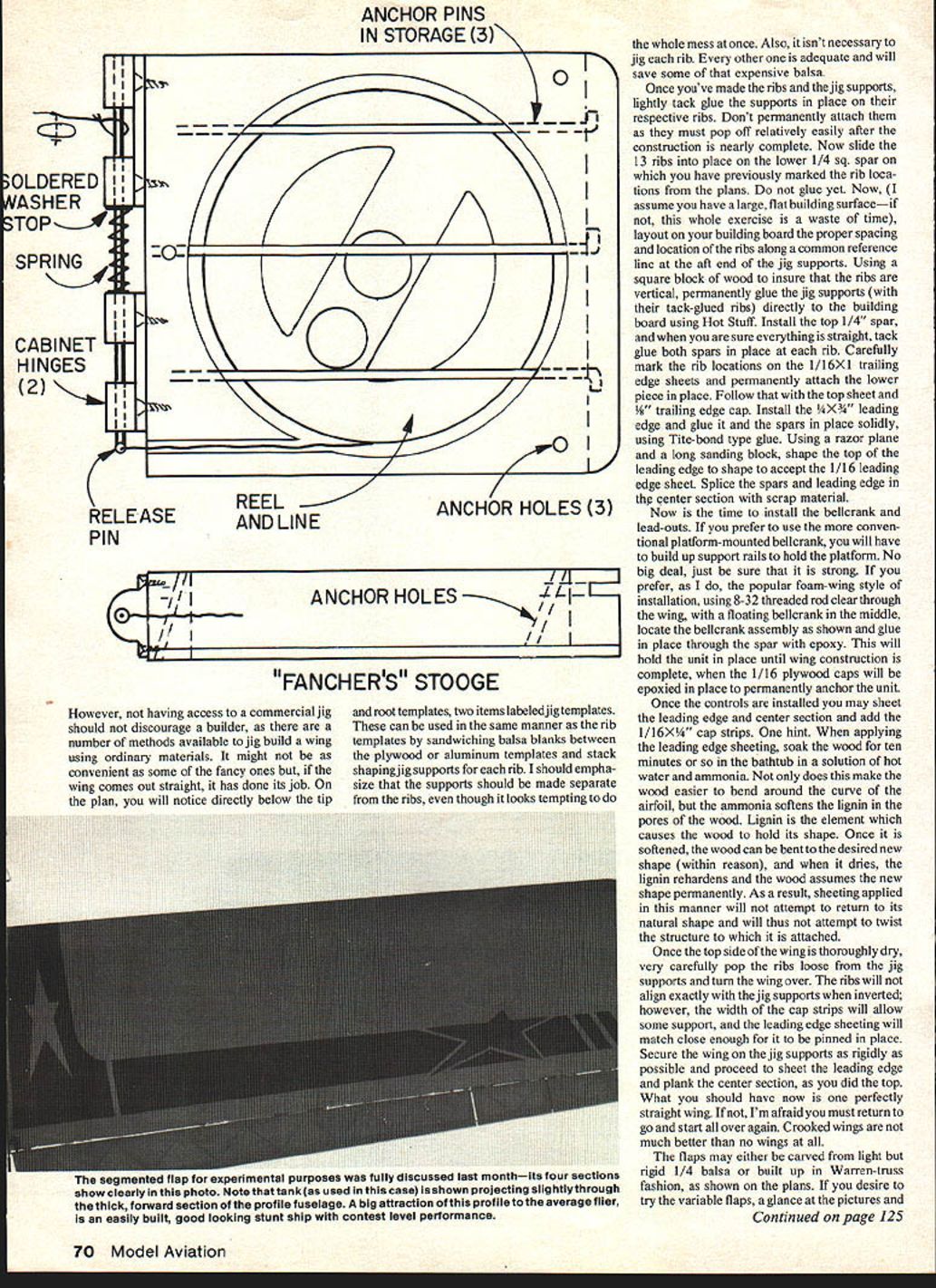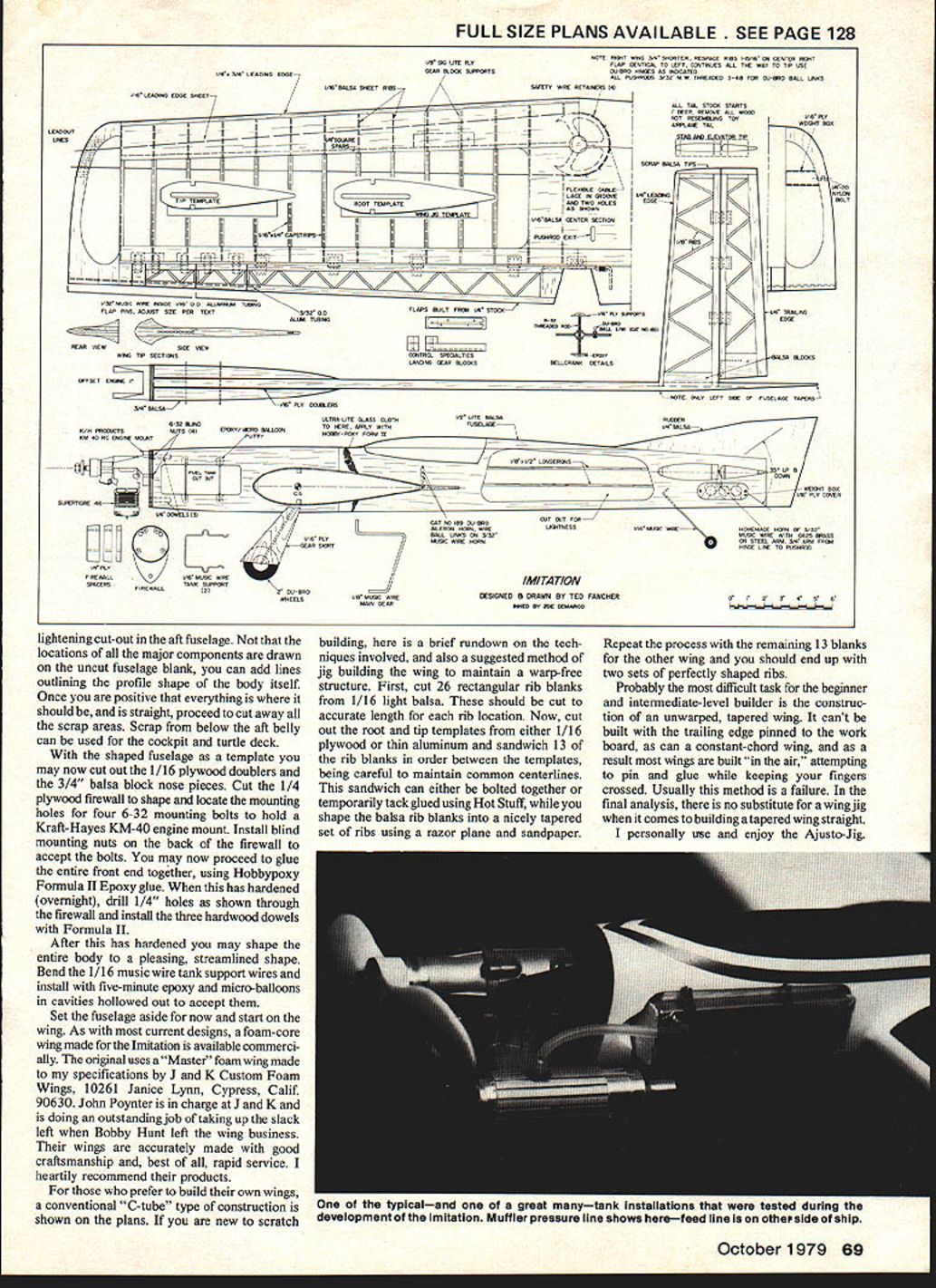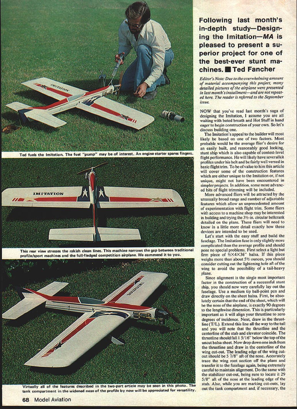 NO OCR TEXT Following last months in-depth studyDesign ing ImitationMA pleased present su perior project best-ever stunt ma chines U Ted Fancher Editors Note Due overwhelming amount material accompanying project detailed pictures airplane presented last months installmentand repeat ed reader referred September issue NOW youve read last months saga designing Imitation assume waiting bated breath Hot Stuff hand eager begin construction own So lets discuss building Imitations appeal builder will likely based two factors Most probable would average fliers desire easily built reasonably good looking stunt ship also capable contest-level flight performance will likely have several kit profiles under belt fairly well versed basic flight trim value him article will cover some construction features either unique Imitation unique might have encountered simplerprojects addition some advanc ed bits flight trimming will included advanced fliers will attracted unusually broad range number adjustable features allow unprecedented amount experimentation flight trim Some fliers access machine shop may interested building trying 3-in circular bellcrank detailed plans fliers will need know little detail exactly devices intended used Lets start easy stuff build fuselage Imitation fuse slightly complicated average profile should pose no special problems First select light firm piece X4X36 balsa piece weighs about 5 ounces should consider cutting out lightening hole aft wing avoid possibility tail-heavy plane Since alignment single important factor construction successful stunt ship should now very carefully lay out fuselage Use medium tip ball-point pen draw directly sheet balsa First abso lutely certain end sheet will nose airplane exactly 90 degrees lengthwise dimension particularly important will align thrustline zero degrees incidence Next draw thrustline T/L Extend line way tail will note thrustline centerline stab elevator coincide thrustline should fall 1 5/16 below top uncut balsa sheet Now drop down inch thrustline draw centerline wing cut-out leading edge wing cut out should 5 7/8 aft nose Accurately trace wing root section off plans transfer fuselage agaln being extremely careful maintaln alignment same stabilizer cut-out being sure locate 29 5/8 aft nose leading edge stab Also marking cut-outs lay out tank compartment necessary 68 Model Aviation rear view stresses rakish clean linesnarrows gap between traoitionai profilelsport machines full-fledged competition airplane commend tSC tWUCI C tHC nay Mc tank compartment widened nose profile now will appreciated versatility FULL SIZE PLANS AVAILABLE PAGE 128 NATE RONOT TANG O/4 STARTER TESTATE RIMS I-SiN NO CENTER RIGHT TM NO ATE PLY AT IPENTICAL TA LCTT CIGGTINGES ALL THE MOAT TO TIP USE IU4 3/4 SAWING EWAEWEAR MLWHW WNOTSWi-NOT HINGES AS INHICATEW ALL TUSOWTAS 3/SA MW TASEAGEG S-3M TAM H/-mA MALL UNTS L 9NOT TESEMMINO TOT Lie iK4- L1—IWRAPT MOO ARES-L ~ il__1 Y2~TTA&AWCLEHATAM IIII~4E SCRTAWMLSATIPS LACE IN GROOAE LHLEARNHP/TWO ELETIMLE CARLA ITIP TEMPLATEIIIITOOT TEMPLATEIII ANO THEA ROLESETAWMALT ITWMNLSA TAMPER SECTIOR AS CAROM EAITj] J IURRRS LILL ___ JI2-flu____ FLAT RSS AC/AST SIZE PER TROT3/32 HEFLATS ROUT FROG UN STACTEGGE _____ ALIBI TEMNO 7--— REAR AEWSIAM AEW WINO TAP SECTIONSANOTTOL STEWALTIES-MERITMGLSA ROARS LWLMSG GEAR WOOLSELLAROSTHETAILS ATYGET EPAMLE P _________ ___NOTE 305 LEPT RIPE GE FASELAGE TAPERS RHO- BALSA ULM PUT AW/MERS ALTRA-OTE GLASS CLOTOIHTLITE MALSO STLTQ IM ROTA WIPE 3 MUSIC WIPE IMITATION ESIDRED S DRAWN BY TED FANCIER MERM Mi 3MM EMERREW TANEMACE TON HE H/TO WUOC MOPE WITH TAOS MTONS AM STEEL AMMO 3/A AMMO FTHM TTAM LIE TA TOSARCE 0T2ALEAAlightening cut-out aft fuselage locations major components drawn uncut fuselage blank can add lines outlining profile shape body itself Once positive everything should straight proceed cut away scrap areas Scrap below aft belly can used cockpit turtle deck shaped fuselage template may now cut out 1/16 plywood doublers 3/4 balsa block nose pieces Cut 1/4 plywood firewall shape locate mounting holes four 6-32 mounting bolts hold Kraft-Hayes KM-40 engine mount Install blind mounting nuts back firewall accept bolts may now proceed glue entire front end together using Hobbypoxy Formula II Epoxy glue has hardened overnight drill 1/4 holes shown through firewall install three hardwood dowels Formula II After has hardened may shape entire body pleasing streamlined shape Bend 1 / 16 music wire tank support wires install five-minute epoxy micro-balloons cavities hollowed out accept Set fuselage aside now start wing As current designs foam-core wing made Imitation available commerci ally original uses Master foam wing made specifications J K Custom Foam Wings 10261 Janice Lynn Cypress Calif 90630 John Poynter charge J K doing outstanding job taking up slack left Bobby Hunt left wing business wings accurately made good craftsmanship best rapid service heartily recommend products prefer build own wings conventional C-tube type construction shown plans new scratch building brief rundown tech niques involved also suggested method jig building wing maintain warp-free structure First cut 26 rectangular rib blanks 1/16 light balsa should cut accurate length rib location Now cut out root tip templates either 1/16 plywood thin aluminum sandwich 13 rib blanks order between templates being careful maintain common centerlines sandwich can either bolted together temporarily tack glued using Hot Stuff shape balsa rib blanks nicely tapered set ribs using razor plane sandpaper Repeat process remaining 13 blanks other wing should end up two sets perfectly shaped ribs Probably difficult task beginner intermediate-level builder construc tion unwarped tapered wing cant built trailing edge pinned work board can constant-chord wing result wings built air attempting pin glue keeping fingers crossed Usually method failure final analysis no substitute wing jig comes building tapered wing straight personally use e