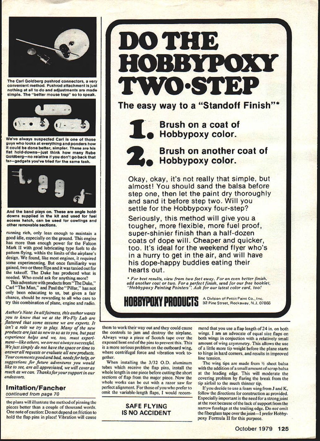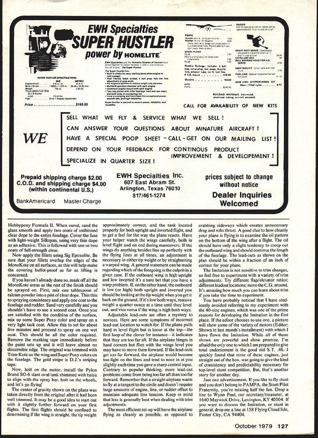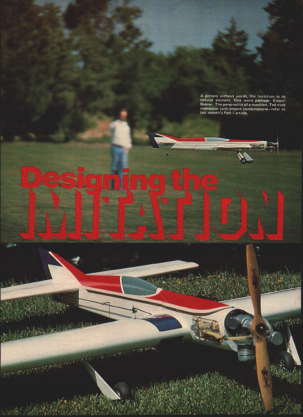 NO OCR TEXT Following last months in-depth studyDesign ing ImitationMA pleased present su perior project best-ever stunt ma chines U Ted Fancher Editors Note Due overwhelming amount material accompanying project detailed pictures airplane presented last months installmentand repeat ed reader referred September issue NOW youve read last months saga designing Imitation assume waiting bated breath Hot Stuff hand eager begin construction own So lets discuss building Imitations appeal builder will likely based two factors Most probable would average fliers desire easily built reasonably good looking stunt ship also capable contest-level flight performance will likely have several kit profiles under belt fairly well versed basic flight trim value him article will cover some construction features either unique Imitation unique might have encountered simplerprojects addition some advanc ed bits flight trimming will included advanced fliers will attracted unusually broad range number adjustable features allow unprecedented amount experimentation flight trim Some fliers access machine shop may interested building trying 3-in circular bellcrank detailed plans fliers will need know little detail exactly devices intended used Lets start easy stuff build fuselage Imitation fuse slightly complicated average profile should pose no special problems First select light firm piece X4X36 balsa piece weighs about 5 ounces should consider cutting out lightening hole aft wing avoid possibility tail-heavy plane Since alignment single important factor construction successful stunt ship should now very carefully lay out fuselage Use medium tip ball-point pen draw directly sheet balsa First abso lutely certain end sheet will nose airplane exactly 90 degrees lengthwise dimension particularly important will align thrustline zero degrees incidence Next draw thrustline T/L Extend line way tail will note thrustline centerline stab elevator coincide thrustline should fall 1 5/16 below top uncut balsa sheet Now drop down inch thrustline draw centerline wing cut-out leading edge wing cut out should 5 7/8 aft nose Accurately trace wing root section off plans transfer fuselage agaln being extremely careful maintaln alignment same stabilizer cut-out being sure locate 29 5/8 aft nose leading edge stab Also marking cut-outs lay out tank compartment necessary 68 Model Aviation rear view stresses rakish clean linesnarrows gap between traoitionai profilelsport machines full-fledged competition airplane commend tSC tWUCI C tHC nay Mc tank compartment widened nose profile now will appreciated versatility FULL SIZE PLANS AVAILABLE PAGE 128 NATE RONOT TANG O/4 STARTER TESTATE RIMS I-SiN NO CENTER RIGHT TM NO ATE PLY AT IPENTICAL TA LCTT CIGGTINGES ALL THE MOAT TO TIP USE IU4 3/4 SAWING EWAEWEAR MLWHW WNOTSWi-NOT HINGES AS INHICATEW ALL TUSOWTAS 3/SA MW TASEAGEG S-3M TAM H/-mA MALL UNTS L 9NOT TESEMMINO TOT Lie iK4- L1—IWRAPT MOO ARES-L ~ il__1 Y2~TTA&AWCLEHATAM IIII~4E SCRTAWMLSATIPS LACE IN GROOAE LHLEARNHP/TWO ELETIMLE CARLA ITIP TEMPLATEIIIITOOT TEMPLATEIII ANO THEA ROLESETAWMALT ITWMNLSA TAMPER SECTIOR AS CAROM EAITj] J IURRRS LILL ___ JI2-flu____ FLAT RSS AC/AST SIZE PER TROT3/32 HEFLATS ROUT FROG UN STACTEGGE _____ ALIBI TEMNO 7--— REAR AEWSIAM AEW WINO TAP SECTIONSANOTTOL STEWALTIES-MERITMGLSA ROARS LWLMSG GEAR WOOLSELLAROSTHETAILS ATYGET EPAMLE P _________ ___NOTE 305 LEPT RIPE GE FASELAGE TAPERS RHO- BALSA ULM PUT AW/MERS ALTRA-OTE GLASS CLOTOIHTLITE MALSO STLTQ IM ROTA WIPE 3 MUSIC WIPE IMITATION ESIDRED S DRAWN BY TED FANCIER MERM Mi 3MM EMERREW TANEMACE TON HE H/TO WUOC MOPE WITH TAOS MTONS AM STEEL AMMO 3/A AMMO FTHM TTAM LIE TA TOSARCE 0T2ALEAAlightening cut-out aft fuselage locations major components drawn uncut fuselage blank can add lines outlining profile shape body itself Once positive everything should straight proceed cut away scrap areas Scrap below aft belly can used cockpit turtle deck shaped fuselage template may now cut out 1/16 plywood doublers 3/4 balsa block nose pieces Cut 1/4 plywood firewall shape locate mounting holes four 6-32 mounting bolts hold Kraft-Hayes KM-40 engine mount Install blind mounting nuts back firewall accept bolts may now proceed glue entire front end together using Hobbypoxy Formula II Epoxy glue has hardened overnight drill 1/4 holes shown through firewall install three hardwood dowels Formula II After has hardened may shape entire body pleasing streamlined shape Bend 1 / 16 music wire tank support wires install five-minute epoxy micro-balloons cavities hollowed out accept Set fuselage aside now start wing As current designs foam-core wing made Imitation available commerci ally original uses Master foam wing made specifications J K Custom Foam Wings 10261 Janice Lynn Cypress Calif 90630 John Poynter charge J K doing outstanding job taking up slack left Bobby Hunt left wing business wings accurately made good craftsmanship best rapid service heartily recommend products prefer build own wings conventional C-tube type construction shown plans new scratch building brief rundown tech niques involved also suggested method jig building wing maintain warp-free structure First cut 26 rectangular rib blanks 1/16 light balsa should cut accurate length rib location Now cut out root tip templates either 1/16 plywood thin aluminum sandwich 13 rib blanks order between templates being careful maintain common centerlines sandwich can either bolted together temporarily tack glued using Hot Stuff shape balsa rib blanks nicely tapered set ribs using razor plane sandpaper Repeat process remaining 13 blanks other wing should end up two sets perfectly shaped ribs Probably difficult task beginner intermediate-level builder construc tion unwarped tapered wing cant built trailing edge pinned work board can constant-chord wing result wings built air attempting pin glue keeping fingers crossed Usually method failure final analysis no substitute wing jig comes building tapered wing straight personally use e