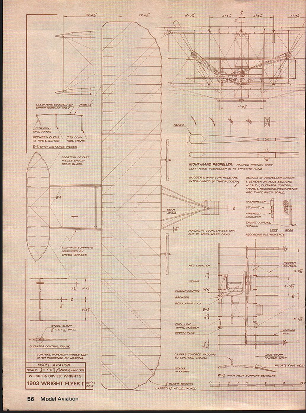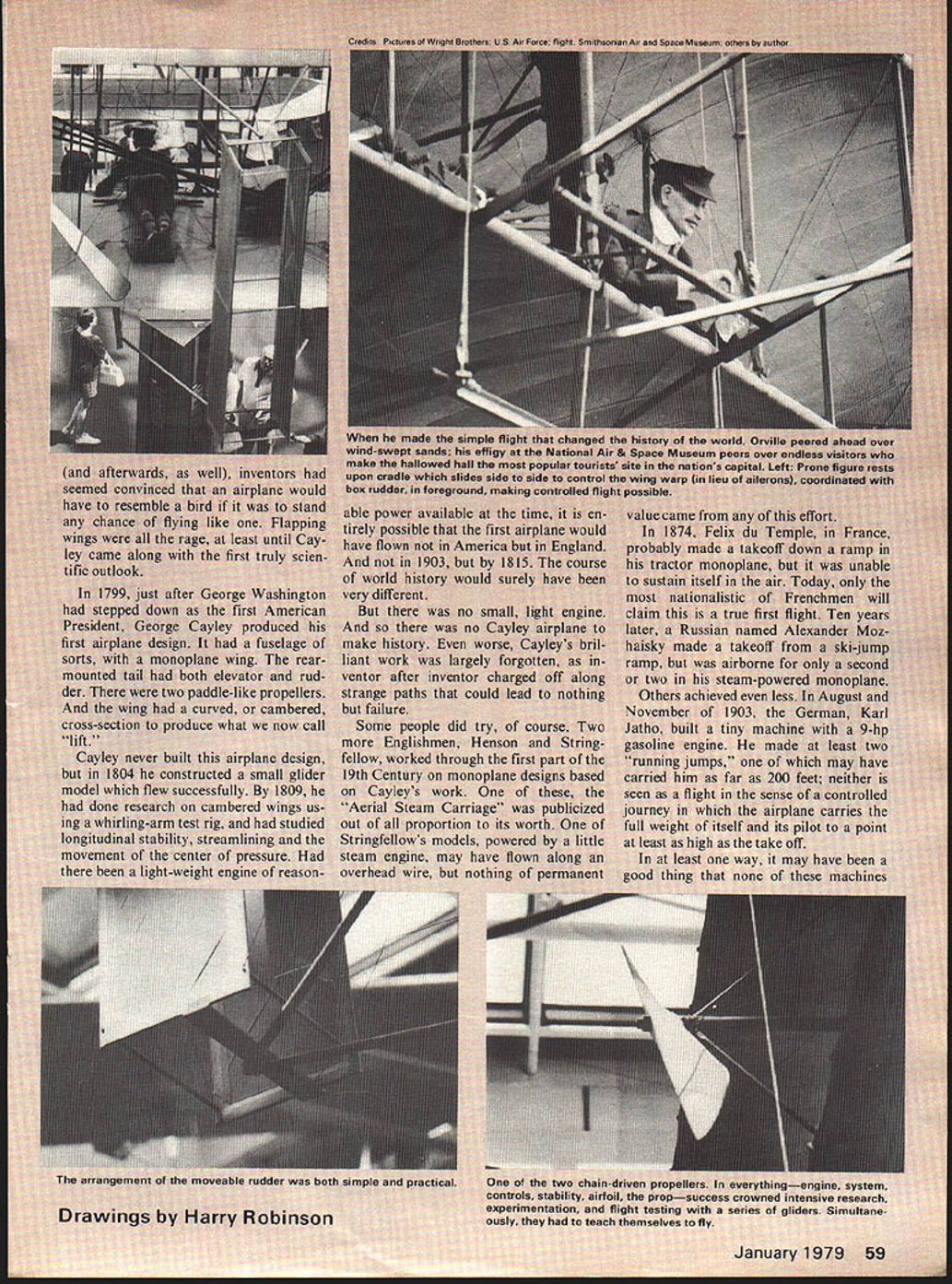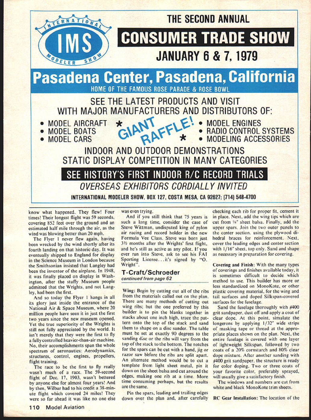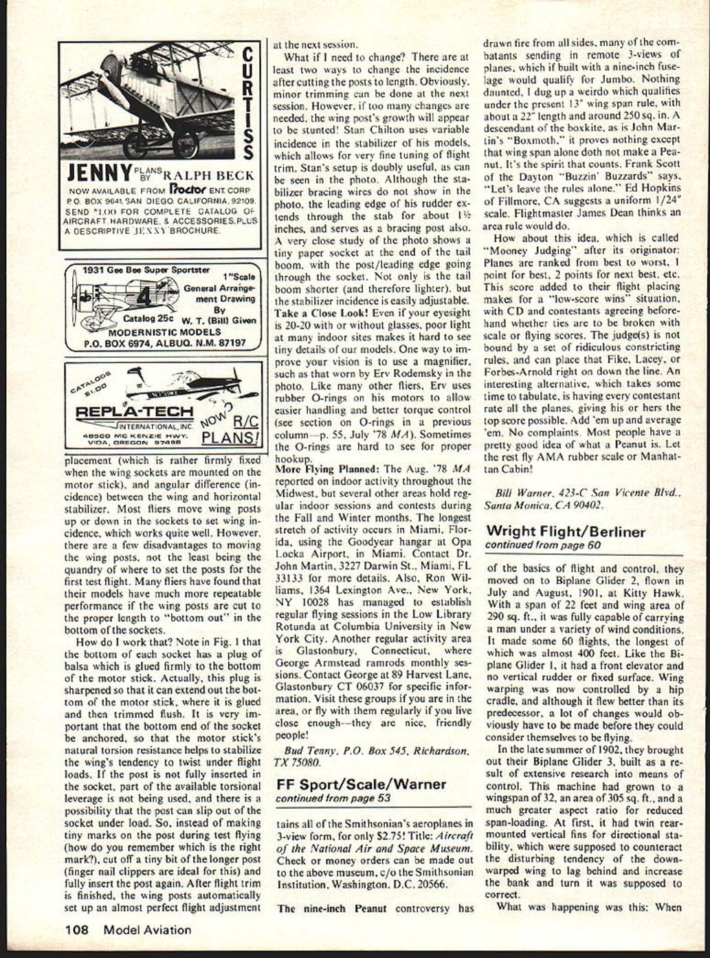 JUST about everyone has least relative 75 years old Someone alive Wright Brothers made historic first flight fully controlled heavier-than-air flying machine flight led directly enormous changes transportation war fare us sport recrea tion Three-quarters ci several lifetimes teei alone 1903 what now story getting place another like several lifetimes progress Yet happened just over th span average personi men vry far fr wasnt just w wanted fly lot years invent th failed reasons obvious mi tother think n lle Wr Litical 75th fame tha sketc like oughi ut built hand after Most o ing ORVILLE WRIGHTWILBUR WRIGHT wrong art over ilbur oth NO OCR TEXT SYA IDOL1 &YACt W AT SPAR 4 EWIR r ONL R BRACC WIRCS WARPING ANALS 7 / ____iT EI 906 TRC DCTAILS 7 CL/P S/PPORT -J PLA1r CL/P D i N. 8 COUNTER WOODSCAEWS APPLICATIONS S7C/T CLIP M NA/N SPAR wiN STRL/TE -7 CLLCR STAY 4 ott srnurs SKID PIX/NG NA/N SPAR sorrc STEEL_SOLDERE DIA NOLES CL/P t 5K ELEVATIONS OrAL trr.i4tAtn arws C OTNEa 58 S7TEL ST PtCCCS fITTINGS fo STtfL aRAZED SMarT uaaRW4 ivor 4 807 5SOLDERED IV/RE PULLEY ot SNAPT RR 0 Co z -J C w N 8 LI UId no sm no 0 n won trgely tor c couli i try Henson ugh ionopla k 0n4 pa nave fl nothing U / IThis nardstretc incodandb mlineVIOW Ut reallylearn fly befoi rfect airplan man would ti ns 5 step involved figui trying r flown like a 5-foot span bir moved Lrping lateral toa form e theire a17-foot I 60 Mc U R T S S V PLANS BY RALPH BECK NOW AVAILABLE FROM lloaoe ENT CORP P0 BOX 9641 SAN DIEGO CALIFORNIA 92109 SEND lX FOR COMPLETE CATALOG OF AIRCRAFT HARDWARE & ACCESSORIESPLUS DESCRIPTIVE jENNY BROCHURE 1931 Gee Bee Super Sportster 1SIe IGeneral Arrange ICatalog 25c w T By1 Imont Drawing Bill Given ERNISTIC MODELS PO BOX 6974 ALBUO NM 87197 placement rather firmly tixed wing sockets mounted motor stick angular difference cidence between wing horizontal stabilizer Most fliers move wing posts up down sockets set wing cidence works quite well However few disadvantages moving wing posts least being quandry set posts first test flight fliers have found models have much repeatable performance wing posts cut proper length bottom out bottom sockets work Note Fig bottom socket has plug balsa glued firmly bottom motor stick Actually plug sharpened can extend out bot tom motor stick glued trimmed flush very im portant bottom end socket anchored motor sticks natural torsion resistance helps stabilize wings tendency twist under flight loads post fully inserted socket part available torsional leverage being used possibility post can slip out socket under load So instead making tiny marks post during test flying remember right mark cut off tiny bit longer post finger nail clippers ideal fully insert post again After flight trim finished wing posts automatically set up almost perfect flight adjustment next session What need change least two ways change incidence after cutting posts length Obviously minor trimming can done next session However too changes needed wing posts growth will appear stunted Stan Chilton uses variable incidence stabilizer models allows very fine tuning flight trim Stans setup doubly useful can seen photo Although sta bilizer bracing wires show photo leading edge rudder ex tends through stab about 11/2 inches serves bracing post also very close study photo shows tiny paper socket end tail boom post/leading edge going through socket tail boom shorter therefore lighter stabilizer incidence easily adjustable Take Close Look eyesight 20-20 glasses poor light indoor sites makes hard see tiny details models way im prove vision use magnifier such worn Fry Rodemsky photo Like other fliers Fry uses rubber 0-rings motors allow easier handling better torque control see section 0-rings previous column p 55 July 78 MA Sometimes 0-rings hard see proper hookup Flying Planned Aug 78 MA reported indoor activity throughout Midwest several other areas hold reg ular indoor sessions contests during Fall Winter months longest stretch activity occurs Miami Flor ida using Goodyear hangar Opa Locka Airport Miami Contact Dr John Martin 3227 Darwin St Miami FL 33133 details Also Ron Wil liams 1364 Lexington Ave New York NY 10028 has managed establish regular flying sessions Low Library Rotunda Columbia University New York City Another regular activity area Glastonbury Connecticut George Armstead ramrods monthly ses sions Contact George 89 Harvest Lane Glastonbury CT 06037 specific infor mation Visit groups area fly regularly live close enough---they nice friendly people Bud Tenny PO Box 545 Richardson TX 75080 FF Sport/Scale/Warner continued page 53 tains Smithsonians aeroplanes 3-view form $275 Title Aircraft National Air Space Museum Check money orders can made out above museum c/o Smithsonian Institution Washington DC 20566 nine-inch Peanut controversy has drawn fire sides com batants sending remote 3-views planes built nine-inch fuse lage would qualify Jumbo Nothing daunted dug up weirdo qualifies under present 13 wing span rule about 22 length around 250 sq descendant boxkite John Mar tins Boxmoth proves nothing except wing span alone doth make Pea nut Its spirit counts Frank Scott Dayton Buzzin Buzzards says Lets leave rules alone Ed Hopkins Fillmore CA suggests uniform 1/24 scale Flightmaster James Dean thinks area rule would about idea called Mooney Judging after its originator Planes ranked best worst point best 2 points next best etc score added flight placing makes low-score wins situation CD contestants agreeing before hand whether ties broken scale flying scores judges bound set ridiculous constricting rules can place Fike Lacey Forbes-Arnold right down line An interesting alternative takes some time tabulate having contestant rate planes giving hers top score possible Add em up average em No complaints Most people have pretty good idea what Peanut Let rest fly AMA rubber scale Manhat tan Cabin Bill Warner 423-C San Vicente Blvd. Santa Monica CA 90402 Wright Flight/Berliner continued page 60 basics flight control mov