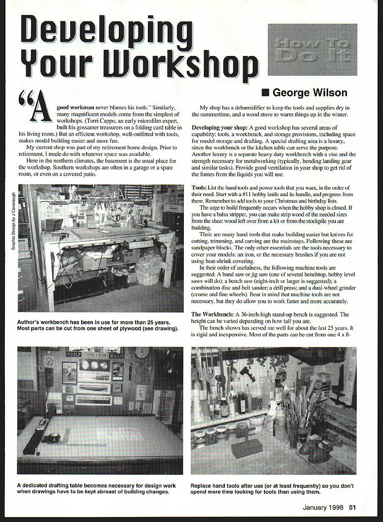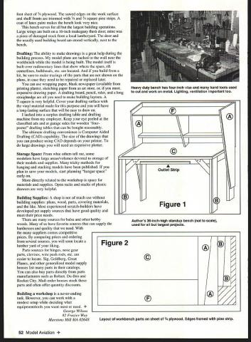 Developing Workshop good workman never blames tools Similarly magnificent models come simplest workshops Tom Cappo early microfilm expert built gossamer treasurers folding card table living room efficient workshop well-outfitted tools makes model building easier fun current shop part retirement home design Prior retirement made whatever space available northern climates basement usual place workshop Southern workshops often garage spare room covered patio shop has dehumidifier keep tools supplies dry summertime wood stove warm things up winter Developing shop good workshop has several areas capability tools workbench storage provisions including space model storage drafting special drafting area luxury since workbench kitchen table can serve purpose Another luxury separate heavy duty workbench vise strength necessary metalworking typically bending landing gear similar tasks Provide good ventilation shop get rid fumes liquids will use Tools List hand tools power tools want order need Start #11 hobby knife its handle progress Remember add tools Christmas birthday lists urge build frequently occurs hobby shop closed have balsa stripper can make strip wood needed sizes sheet wood left over kit stockpile building hand tools make building easier knives cutting trimming carving mainstays Following sandpaper blocks other essentials tools necessary cover models iron necessary brushes using heat-shrink covering order usefulness following machine tools suggested band saw jig saw several benchtop hobby level saws will bench saw eight-inch larger suggested combination disc belt sander drill press dual-wheel grinder coarse fine wheels Bear mind machine tools necessary allow work faster accurately Workbench 36-inch-high stand-up bench suggested height can varied depending tall bench shown has served well about last 25 years rigid inexpensive Most parts can cut 4 x 8January 1998 51 U George Wilson Authors workbench has use 25 years Most parts can cut sheet plywood see drawing dedicated drafting table becomes necessary design work Replace hand tools after use least frequently dont drawings have kept abreast building changes spend time looking tools using foot sheet 3/4 plywood sawed edges work surface shelf fronts trimmed square pine strips coat latex paint makes bench look very nice bench serves largest building operations Large wings built 16-inch mahogany flush door piece damaged stock local lumberyard door usually used building board stored vertically next bench Drafting ability make drawings great help during building process model plans tacked wall near workbench model being built model itself built over rudimentary lines show spars rib centerlines bulkheads etc located build kit sure make tracings parts shown plans case need repaired replaced later can use wrapping paper blank newspaper available printing plants sketching paper art store must expensive drawing paper drafting board pencil ruler long straightedge need make building layouts T-square very helpful Cover drafting surface vinyl material made purpose will have long-lasting surface will easy draw lucked surplus drafting table drafting machine employer Keep eye peeled classified ads garage sales wooden four poster drafting tables can bought reasonably ultimate drafting convenience Computer Aided Drafting CAD capability size drawings can produce using CAD depends printer large drawings will need expensive plotter Storage Space what others tell some modelers have large areaslvolumes devoted storage models supplies tricky methods hanging stacking models have published plan save models start planning hangar space early directly related workshop space materials supplies Open rncks stacks plastic drawers very helpful Building Supplies shop much use building supplies plans wood parts covering materials like Most experienced scratch-builders have developed pet supply sources have good quality meet price needs sources balsa other hobby woods us have favorite sources can supply hardnesses quality need suppliers comes competitive prices comparing prices ordering several sources will soon locate lumber yard liking Parts sources hinges nose gear parts devises wire push rods etc easier locate Sig Goldberg Great Planes other generalized model supply houses list parts catalogs can also buy parts directly parts manufacturers such Robart Du-Bro Rocket City Mail-order houses stock parts often offer quantity discounts Building workshop never-ending task However can work modest setup deciding what equipment/tools want need ge Wilson 82 Frazier Way Marstons Mill MA 02648 6 Outlet Strip Figure 1 Layout workbench parts sheet ood Edges framed pine strip 52 Model Aviation y duty bench has four-inch vise hand tools used cut work metal Lighting ventilation important too w V Authors 36-inch-high standup bench scale used largest projects Figure 2 B /