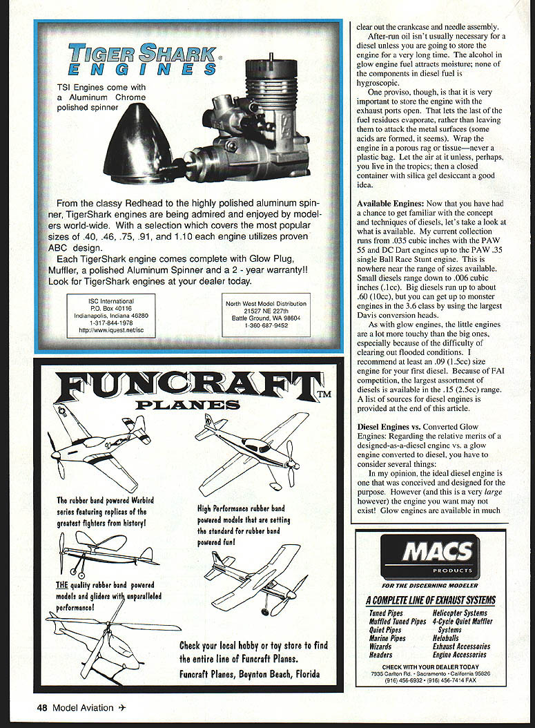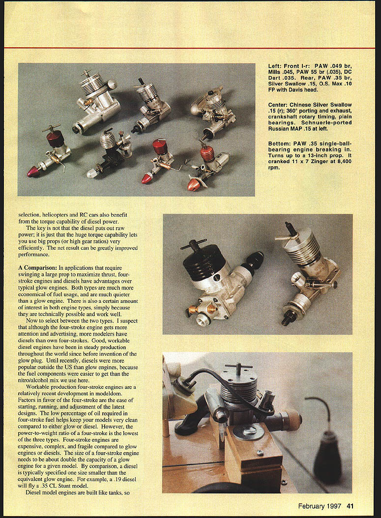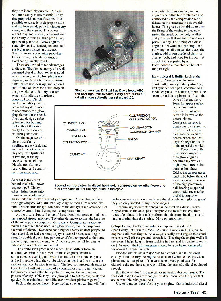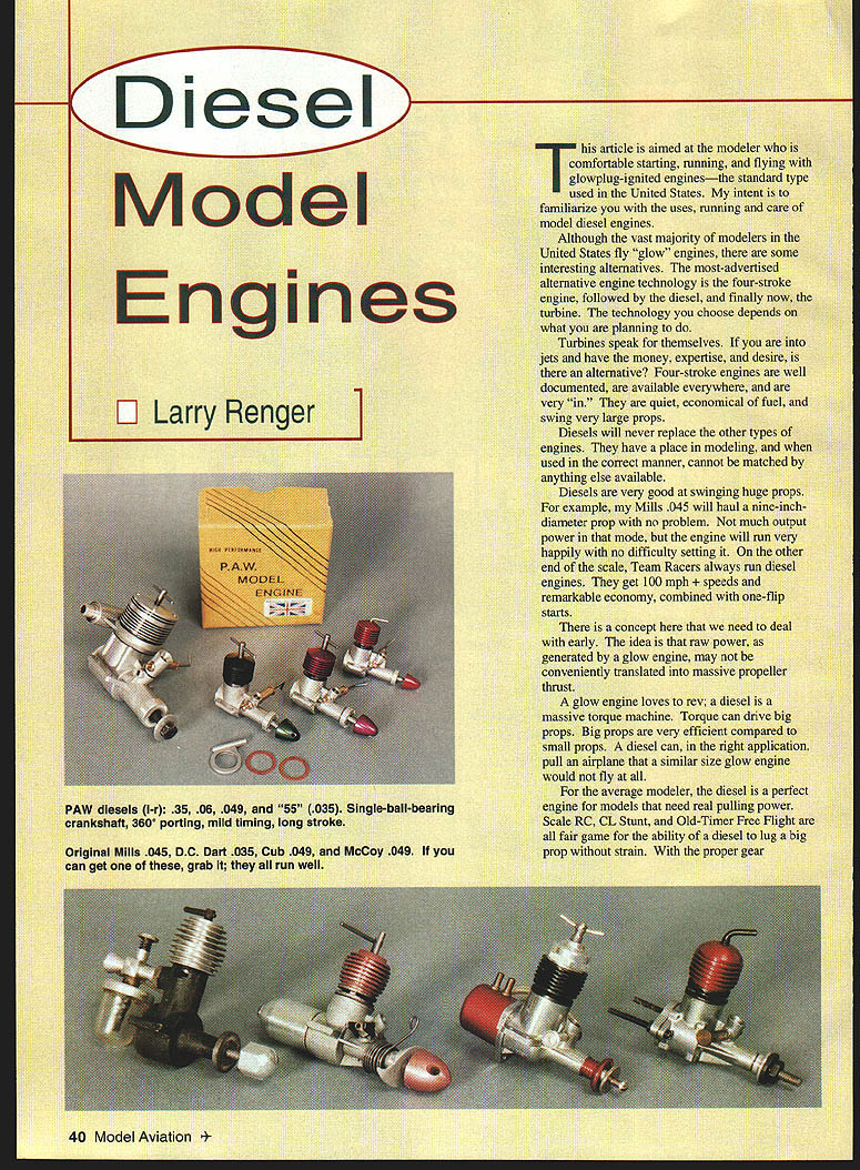 Diesel Model Engines D Larry Renger 1 article aimed modeler comfortable starting running flying glowplug-ignited enginesthe standard type used United States intent familiarize uses running care model diesel engines Although vast majority modelers United States fly glow engines some interesting alternatives most-advertised alternative engine technology four-stroke engine followed diesel finally now turbine technology choose depends what planning Turbines speak themselves jets have money expertise desire alternative Four-stroke engines well documented available everywhere very quiet economical fuel swing very large props Diesels will never replace other types engines have place modeling used correct manner cannot matched anything else available Diesels very good swinging huge props example Mills 045 will haul nine-inchdiameter prop no problem much output power mode engine will run very happily no difficulty setting other end scale Team Racers always run diesel engines get 100 mph ds remarkable economy combined one-flip starts concept need deal early idea raw power generated glow engine may conveniently translated massive propeller thrust glow engine loves rev diesel massive torque machine Torque can drive big props Big props very efficient compared small props diesel can right application pull airplane similar size glow engine would fly average modeler diesel perfect engine models need real pulling power Scale RC CL Stunt Old-Timer Free Flight fair game ability diesel lug big prop strain proper gear 40 Model Aviation diesels I-r 35 06 049 55 035 Single-bail-bearIng crankshaft 3800 portIng mild timing long stroke Original Mills 045 DC Dart 035 Cub 049 McCoy 049 can get grab run well Left Front l-r PAW 049 br Mills 045 PAW 55 br 035 DC Dart 035 Rear PAW 35 br Silver Swallow 15 0S Max 10 FP Davis head Center Chinese Silver Swallow 15 r 3600 portIng exhaust crankshaft rotary tIming plain bearings Schnuerle-ported Russian MAP 15 left Bottom PAW 35 sIngle-ballbearing engine breaking Turns up 13-inch prop cranked 11 x 7 Zlnger 8400 rpm selection helicopters RC cars also benefit torque capability diesel power key diesel puts out raw power just huge torque capability lets use big props high gear ratios very efficiently net result can greatly improved performance Comparison applications require swinging large prop maximize thrust fourstroke engines diesels have advantages over typical glow engines Both types much economical fuel usage much quieter glow engine also certain amount interest both engine types simply because technically possible work well Now select between two types suspect although four-stroke engine gets attention advertising modelers have diesels own four-strokes Good workable diesel engines have steady production throughout world since before invention glow plug Until recenfly diesels popular outside US glow engines because fuel components easier get intro/alcohol mix use Workable production four-stroke engines relatively recent development modeldom Factors favor four-stroke ease starting running adjustment latest designs low percentage oil required four-stroke fuel helps keep models very clean compared either glow diesel However power-to-weight ratio four-stroke lowest three types Four-stroke engines expensive complex fragile compared glow engines diesels size four-stroke engine needs about double capacity glow engine given model comparison diesel typically specified size smaller equivalent glow engine example 19 diesel will fly 35 CL Stunt model Diesel model engines built like tanks February 1997 41 incredibly durable diesel will tune easily run essentially size prop modification possible run 16-inch prop 35 produce usable power damage engine power output may ideal sometimes ability swing huge prop rpm need Glow engines generally need designed around particular rpm range happy turning other-size propellers Excess wear unsteady settings overheating usually results several other advantages diesels fuel economy welldesigned diesel about twice good glow engine glow plug required cant burn out starting batteries unnecessary diesel cant flame out because fuel drop hit glow element Battery booster systems idle completely unneeded too Diesels can incredibly small because dont need accommodate glow plug element head head design can optimized burning fuel extra cavity glow coil disturbing flow negative side diesels use funnysmelling greasy fuel hard start because require adjustment two major tuning devices instead Diesels relatively hard find experts rare 0-RING SEAL CyliNDER C0MRESSI0N ADJUSliNG SCREW CYliNDER HEAD C0NTRA-PST0N COMBUSliON CHAMBER CONNECIiNG ROD ___0 CRANKSHFr So what secret behind little-known engine type Diethyl ether Ether bursts flame column air saturated ether rapidly compressed Glow plug engines use glowing coil platinum alloy ignite nitro/alcohol fuel mix Diesels time ignition point diethyl-ether/kerosene fuel charge controlling engines compression ratio As piston rises top stroke compresses heats trapped air/fuel mixture ether detonates start burning main power component kerosene Compression ratios much higher used glow engine improves thermal efficiency Kerosene has higher energy content per pound alcohol fuel economy enjoys second boost resulting roughly double run time per ounce fuel compared same power output glow engine As glow oil engine lubrication contained fuel combustion process model diesel differs automotive industrial diesel engines air compressed higher levels model engines oil sprayed combustion chamber fine mist moment combustion start hot compressed air starts burn fuel need chemical electric igniter process controlled injector timing amount pattern spray OK use glow plug get engine started quickly cold isnt like own dear platinum gems Back model diesel have chemical will flash Second contra-piston diesel head sets compression ether/kerosene fuel detonates just right time cycle CRANKCASE particular temperature engine temperature can controlled compr