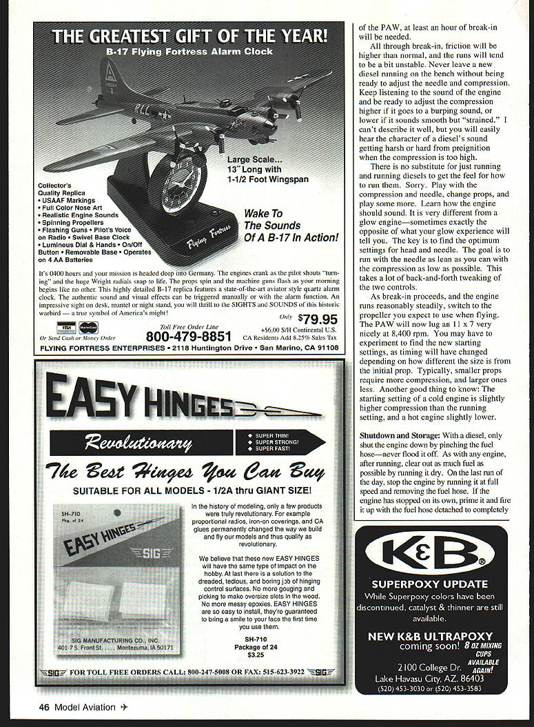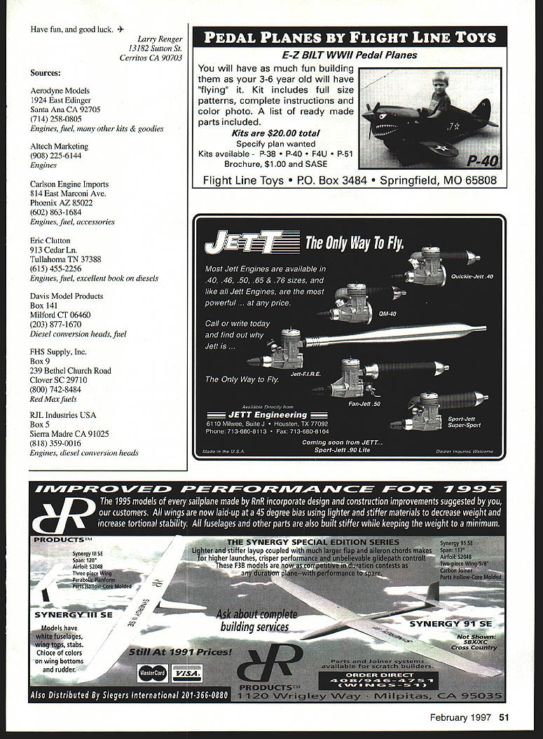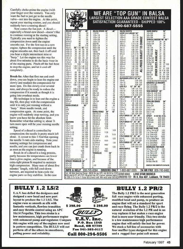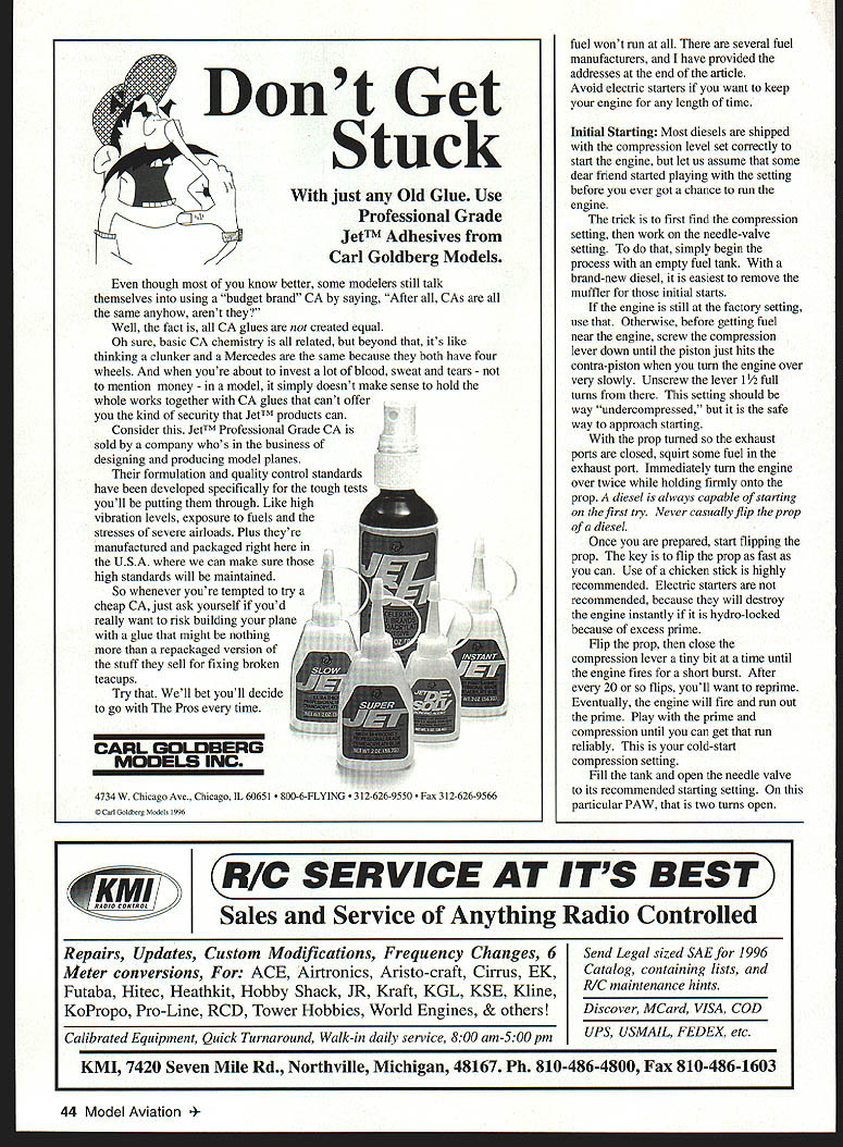 Diesel Model Engines D Larry Renger 1 article aimed modeler comfortable starting running flying glowplug-ignited enginesthe standard type used United States intent familiarize uses running care model diesel engines Although vast majority modelers United States fly glow engines some interesting alternatives most-advertised alternative engine technology four-stroke engine followed diesel finally now turbine technology choose depends what planning Turbines speak themselves jets have money expertise desire alternative Four-stroke engines well documented available everywhere very quiet economical fuel swing very large props Diesels will never replace other types engines have place modeling used correct manner cannot matched anything else available Diesels very good swinging huge props example Mills 045 will haul nine-inchdiameter prop no problem much output power mode engine will run very happily no difficulty setting other end scale Team Racers always run diesel engines get 100 mph ds remarkable economy combined one-flip starts concept need deal early idea raw power generated glow engine may conveniently translated massive propeller thrust glow engine loves rev diesel massive torque machine Torque can drive big props Big props very efficient compared small props diesel can right application pull airplane similar size glow engine would fly average modeler diesel perfect engine models need real pulling power Scale RC CL Stunt Old-Timer Free Flight fair game ability diesel lug big prop strain proper gear 40 Model Aviation diesels I-r 35 06 049 55 035 Single-bail-bearIng crankshaft 3800 portIng mild timing long stroke Original Mills 045 DC Dart 035 Cub 049 McCoy 049 can get grab run well Left Front l-r PAW 049 br Mills 045 PAW 55 br 035 DC Dart 035 Rear PAW 35 br Silver Swallow 15 0S Max 10 FP Davis head Center Chinese Silver Swallow 15 r 3600 portIng exhaust crankshaft rotary tIming plain bearings Schnuerle-ported Russian MAP 15 left Bottom PAW 35 sIngle-ballbearing engine breaking Turns up 13-inch prop cranked 11 x 7 Zlnger 8400 rpm selection helicopters RC cars also benefit torque capability diesel power key diesel puts out raw power just huge torque capability lets use big props high gear ratios very efficiently net result can greatly improved performance Comparison applications require swinging large prop maximize thrust fourstroke engines diesels have advantages over typical glow engines Both types much economical fuel usage much quieter glow engine also certain amount interest both engine types simply because technically possible work well Now select between two types suspect although four-stroke engine gets attention advertising modelers have diesels own four-strokes Good workable diesel engines have steady production throughout world since before invention glow plug Until recenfly diesels popular outside US glow engines because fuel components easier get intro/alcohol mix use Workable production four-stroke engines relatively recent development modeldom Factors favor four-stroke ease starting running adjustment latest designs low percentage oil required four-stroke fuel helps keep models very clean compared either glow diesel However power-to-weight ratio four-stroke lowest three types Four-stroke engines expensive complex fragile compared glow engines diesels size four-stroke engine needs about double capacity glow engine given model comparison diesel typically specified size smaller equivalent glow engine example 19 diesel will fly 35 CL Stunt model Diesel model engines built like tanks February 1997 41 incredibly durable diesel will tune easily run essentially size prop modification possible run 16-inch prop 35 produce usable power damage engine power output may ideal sometimes ability swing huge prop rpm need Glow engines generally need designed around particular rpm range happy turning other-size propellers Excess wear unsteady settings overheating usually results several other advantages diesels fuel economy welldesigned diesel about twice good glow engine glow plug required cant burn out starting batteries unnecessary diesel cant flame out because fuel drop hit glow element Battery booster systems idle completely unneeded too Diesels can incredibly small because dont need accommodate glow plug element head head design can optimized burning fuel extra cavity glow coil disturbing flow negative side diesels use funnysmelling greasy fuel hard start because require adjustment two major tuning devices instead Diesels relatively hard find experts rare 0-RING SEAL CyliNDER C0MRESSI0N ADJUSliNG SCREW CYliNDER HEAD C0NTRA-PST0N COMBUSliON CHAMBER CONNECIiNG ROD ___0 CRANKSHFr So what secret behind little-known engine type Diethyl ether Ether bursts flame column air saturated ether rapidly compressed Glow plug engines use glowing coil platinum alloy ignite nitro/alcohol fuel mix Diesels time ignition point diethyl-ether/kerosene fuel charge controlling engines compression ratio As piston rises top stroke compresses heats trapped air/fuel mixture ether detonates start burning main power component kerosene Compression ratios much higher used glow engine improves thermal efficiency Kerosene has higher energy content per pound alcohol fuel economy enjoys second boost resulting roughly double run time per ounce fuel compared same power output glow engine As glow oil engine lubrication contained fuel combustion process model diesel differs automotive industrial diesel engines air compressed higher levels model engines oil sprayed combustion chamber fine mist moment combustion start hot compressed air starts burn fuel need chemical electric igniter process controlled injector timing amount pattern spray OK use glow plug get engine started quickly cold isnt like own dear platinum gems Back model diesel have chemical will flash Second contra-piston diesel head sets compression ether/kerosene fuel detonates just right time cycle CRANKCASE particular temperature engine temperature can controlled compr