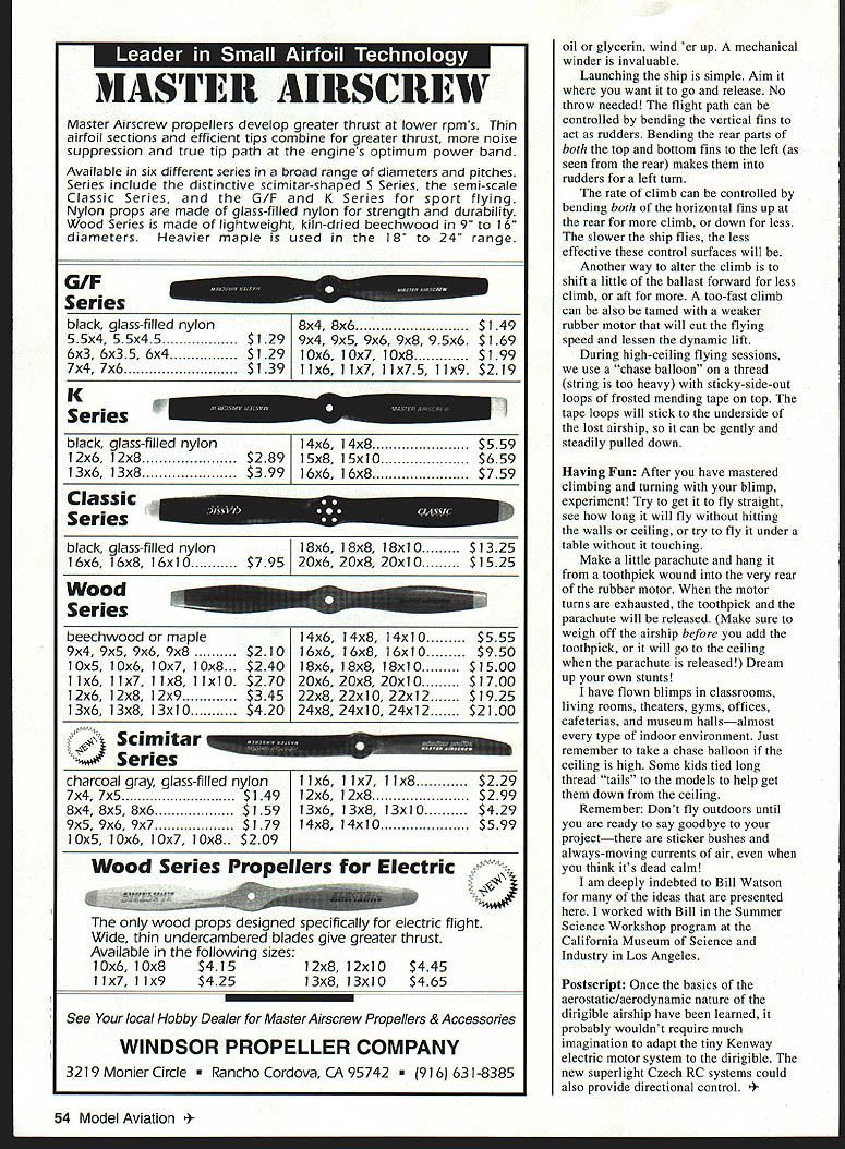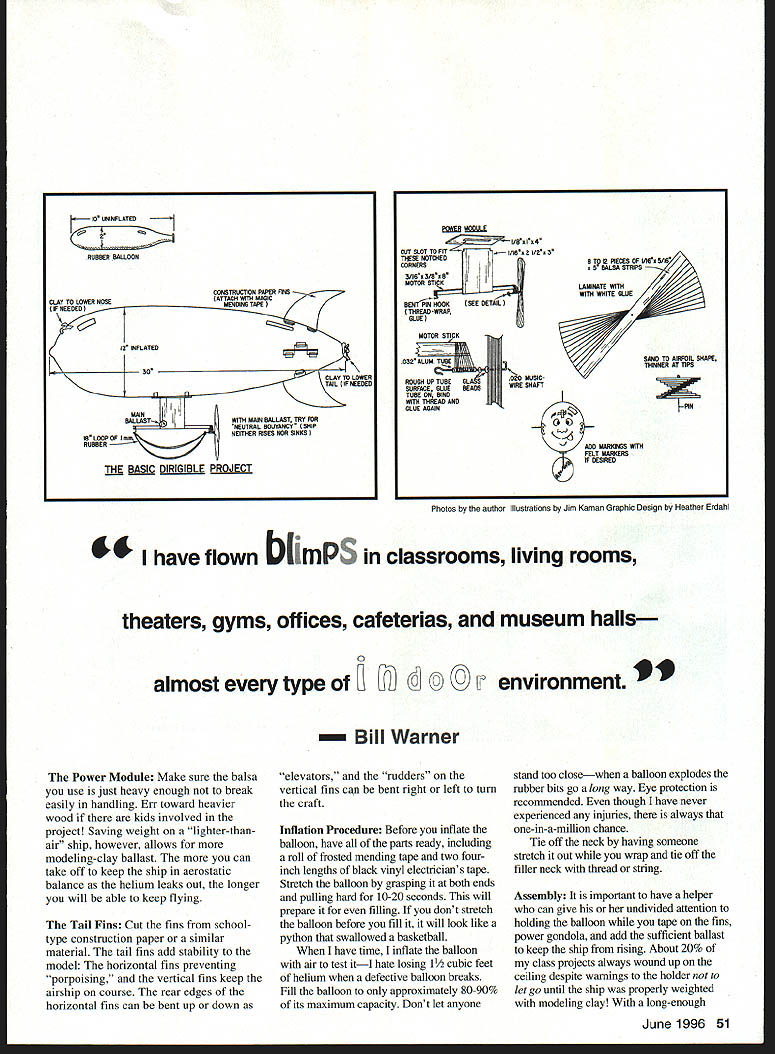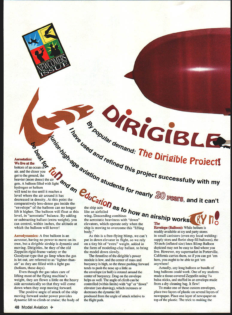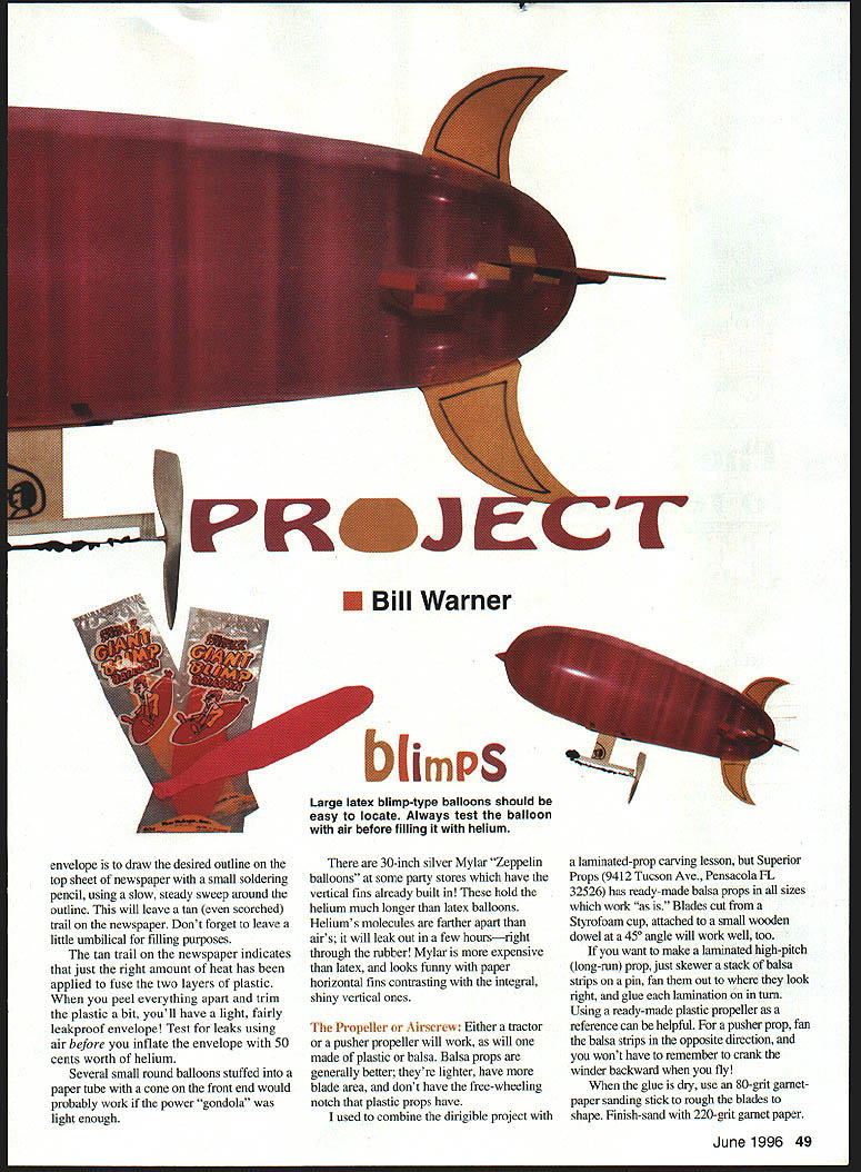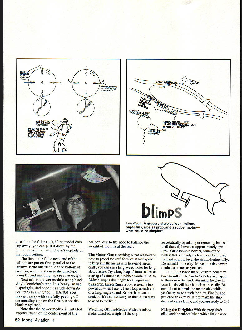 0 Aerostatics Weliveatthe bottom ocean air closer get ground heavier dense air gets balloon filled light hydrogen heliumV will tend rise until reaches level air around has decreased density point comparatively less-dense gas inside envelope balloon can no longer lift higher balloon will float level aerostatic balance adding subtracting ballast extra weight can control within inches altitude balloon will hover Aerodynamics free balloon aerostat having no power move its own dirigible airship dynamic moving Dirigibles old Zeppelin rigid-frame variety Goodyear-type go limp gas let out referred lighter-than air filled light gas helium days though gas takes care lifting flying machines weight flown little heavy side aerostatically will come down stop moving forward positive angle attack ship moving forward under power provides dynamic lift climb cruise body L 0 04 cit1 0Ject SUCCeSStII tor flearly ship aOO airfoiled Q ho wing Descending combines W airship Worksy Envelope Balloon helium readily available toy party stores small canisters local weldingsupply store florist shop fill balloons 30-inch inflated size latex Blimp Balloon depicted may easy find live However supermarket Porterville California carries can get em ought able get em anywhere Actually long balloon bundle long balloons could work students made tissue-covered Zeppelin using 1/16 balsa sticks stuffed envelope made dry cleaning bag flew make custom envelopes place two layers plastic several layers newspaper Place layer newspaper top plastic trick making the aerostatic heaviness down elevators operate ship moving overcome lifting body As free-flying blimp cant put down elevator flight rely tiny bit extra weight added form modeling-clay ballast bring model down slowly thrustline dirigibles power module low center mass buoyancy high thrust pushing forward tends push nose up little envelope hull rotated around center buoyancy Drag envelope helps well angle climb can controlled within limits up down elevator see drawing increases decreases dynamic lift produced angle attack relative flight path Ip 48 Model Aviation % tJirigff Projecti envelope draw desired outline top sheet newspaper small soldering pencil using slow steady sweep around outline will leave tan scorched trail newspaper Dont forget leave little umbilical filling purposes tan trail newspaper indicates just right amount heat has applied fuse two layers plastic peel everything apart trim plastic bit youll have light fairly leakproof envelope Test leaks using air before inflate envelope 50 cents worth helium Several small round balloons stuffed paper tube cone front end would probably work power gondola light enough 30-inch silver Mylar Zeppelin balloons some party stores have vertical fins already built hold helium much longer latex balloons Heliums molecules farther apart airs will leak out few hoursright through rubber Mylar expensive latex looks funny paper horizontal fins contrasting integral shiny vertical ones Propdkr Aircrew Either tractor pusher propeller will work will made plastic balsa Balsa props generally better theyre lighter have blade area dont have free-wheeling notch plastic props have used combine dirigible project laminated-prop carving lesson Superior Props 9412 Tucson Ave Pensacola FL 32526 has ready-made balsa props sizes work Blades cut Styrofoam cup attached small wooden dowel 450 angle will work well too want make laminated high-pitch long-mn prop just skewer stuck balsa strips pin fan out look right glue lamination turn Using ready-made plastic propeller reference can helpful pusher prop fan balsa strips opposite direction wont have remember crank winder backward fly glue dry use 80-grit garnetpaper sanding stick rough blades shape Finish-sand 220-grit garnet paper June 1996 49 U Bill Warner Large latex blimp-type balloons should easy locate Always test balloon air before filling helium 64 CJTSLOTTOPITffTh.--I6Z23 cORNERSIiiL\1IS MLSASTRPS~ /lBSBB// MOTOR STICKLAMNATE WTI4 / BENT PIN HOOKSEE DETAL// WITHWHTEBIUE / ThREAD-WRAP MOTOR STICK ROUGH UP TUBESLAA020 IAISIC SURFACE GLUEBEAUS E SHAFT TUBE ON BINSJjjjIIIjjj WITH THREAD AND GLUE AGAIN ADD MAJIKINGS WmA FELT MARKERS F DESIRED SAND TO AIRFOIL SHAPE THINNER AT TIPS Photos author Illustrations Jim Kaman Graphic Design Heather Erdahi have flown blImpS classrooms living rooms theaters gyms offices cafeterias museum halls almost type of0 ronment 9 Bill Warner Power Module Make sure balsa use just heavy enough break easily handling Err toward heavier wood kids involved project Saving weight lighter-than air ship however allows modeling-clay ballast can take off keep ship aerostatic balance helium leaks out longer will able keep flying Tail Fins Cut fins schooltype construction paper similar material tail fins add stability model horizontal fins preventing porpoising vertical fins keep airship course rear edges horizontal fins can bent up down elevators rudders vertical fins can bent right left turn craft Inflation Procedure Before inflate balloon have parts ready including roll frosted mending tape two fourinch lengths black vinyl electricians tape Stretch balloon grasping both ends pulling hard 10-20 seconds will prepare filling dont stretch balloon before fill it will look like python swallowed basketball have time inflate balloon air test itI hate losing 1 t/2 cubic feet helium defective balloon breaks Fill balloon approximately 80-90% its maximum capacity Dont let anyone stand too closewhen balloon explodes rubber bits go long way Eye protection recommended though have never experienced injuries always one-in-a-million chance Tie off neck having someone stretch out wrap tie off filler neck thread string Assembly important have helper can give undivided attention holding balloon tape fins power gondola add sufficient ballast keep ship rising About 20% class projects always wound up ceiling despite warnings holder let go until ship properly weighted modeling clay long-enough June1996 51 411 DD14I K