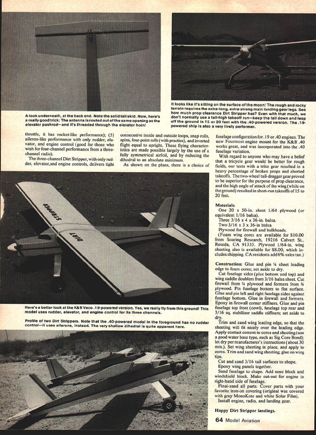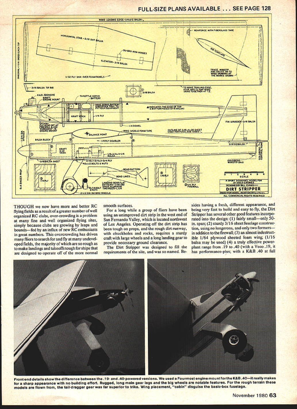 NO OCR TEXT FULL-SIZE PLANS AVAILABLE. SEE PAGE 128 WING "I/4s1/Z BALSA / /1 $REINFORCE WITH FIRERGIASS TAM I / TRACE WINGTIP AND SPUCE ON TOII WING DRAWING AT THE MARKS SHORN BAP RIB 5 -TO MARE TRAILING EDGE GWE AND CLAMP WING SKINS TOGETHER AT TE KEB 19 ENGINETHROTTLE SERVO -MITE MOUNT,- BATTERY IIA-WDICATESThE EDGE OVTOP Ill-- IT YOIJR VIN& BOTTOMPIECESI3IIB BALSAI i I\I -- _____IIRAFT ICRI/4PLY gIiIqN-FIN &RUDDE -3/14 BALSA 1/4 DOWEL 4W______ MOUNTWING SADDLE FOAM TAPEOUTIOf3/IB43%IIEET _____erqi _________ II*BALANCE POINT_____________ BALSABLOCK -LSA I__ iIIII ___KRAFT TANKfl---tj%I/B3/44-I4Ij 3/IBBALSA SHEET AI-3143-3/4 PLYGOLDEBG WOI/DBOLTS & RUTS 1WING P SKID yk-~N Bj4ZBTBHOLTBEND PATTERNI/BUI54 je BEND LINES-. SCALE LANDING GEAR FLAT II-IHAHN MO WPATTERNIIIBCDBI21 APLY &NUTSDIRT STRIPPER -2-1/2 DIN DIJ-BRO WHEELSPD AVIATiON BYA..AVi THOUGH now have better RC flying fields result greater number well organized RC clubs over-crowding problem fine well organized flying sites simply because clubs growing leaps boundsfed influx new RC enthusiasts great numbers overcrowding has driven fliers search fly undevel oped fields majority rough make landings takeoffs tough ships designed operate off normal smooth surfaces long group fliers have using unimproved dirt strip west end San Fernando Valley located northwest Los Angeles Operating off dirt strip has tough props rough dirt runway chuckholes rocks requires sturdy craft large wheels long landing gear provide necessary ground clearance Dirt Stripper designed fill requirements site named Besides having fresh different appearance being very fast build easy fly Dirt Stripper has several other good features incorpo rated design 1 fairly smallonly 50in span 2 sturdy 3/16 sheet fuselage construc tion using no longerons two formers addition firewall 3 almost indestruct ible 1/64 plywood sheeted foam wing 1/16 balsa may used 4 truly effective powerplant range 19 40 Veco 19 has performance-plus K&B 40 full November 1980 63 III III III liii DI 1/32 PLY SKIN OVER FOAM PANELS~ Front end details Show ditterence between inc i - ano 4U-powered versions usca 1-ourmoet engine mount forthe K&B 40it really makes sharp appearance no building effort Rugged long main gear legs big wheels notable features rough terrain models flown tail-dragger gear far superior trike Wing placement cabin disguise basic-box fuselage throttle has rocket-like performance 5 aileron-like performance rudder ele vator engine control good wish four-channel performance threechannel radio three-channel Dirt Stripper rud der elevatorand engine controls delivers tight consecutive inside outside loops snap rolls spins four-point rolls practice inverted flight equal upright flying character istics made possible largely use fully symmetrical airfoil reducing dihedral absolute minimum As shown plans choice fuselage configurationfor19 or40 engines new Fourmost engine mount K&B 40 works great incorporated 40 fuselage variation regard anyone may have belief tricycle gear would better rough fields tests trike gear resulted heavy percentage broken props aborted takeoffs two-wheel tail-dragger gear proved superior purpose prop clearance high angle attack wing ground resulted short-run takeoffs 15 20 feet Materials 20 x 50-in sheet 1/64 plywood equivalent 1/16 balsa Three 3/16 x 4 x 36-in balsa Two 3/16 x 3 x 36-in balsa Plywood firewall bulkheads Foam wing cores available $1000 Soaring Research 19216 Calvert St Reseda CA 91335 Plywood 1/64-in wing sheeting also available $800 cludes shipping CA residents add 6% sales tax Construction Glue pin t leading edge foam cores set aside dry Cut fuselage sides plus bottom top wing saddle doublers 3/16 balsa sheet Cut firewall 4 plywood formers plywood Pin fuselage bottom flat surface Glue pin left right fuselage sides against fuselage bottom Glue firewall formers Epoxy firewall corner stiffners Glue pin fuselage top front cowl fuselage top rear 3/16 sq stabilizer saddle stiffners set aside dry Trim sand wing leading edge sheeting will fit nicely over leading edge Apply contact cement cores sheeting use good water base type such Sig Core Bond let dry per manufacturers instructions about 30 mm Set wing sheeting place apply cores Trim sand wing sheeting giue wing tips Cut sand 3/16 tail surfaces shape Epoxy wing panels together Sand fuselage shape Add nose block windshield block Make cut-out engine right-hand side fuselage Final-sand parts Cover parts favorite iron-on covering original covered gray MonoKote white Solar Film Install engine radio landing gear Happy Dirt Stripper landings 64 Model Aviation look underneath back end Note solid tail skid Now heres really good trick antenna routed Out same opening elevator pushrodand its threaded through elevator horn looks like its sitting surface moon rough rocky terrain requires extra-long extra-strong main landing gear legs See much prop clearance Dirt Stripper has much dont normally use tail-high takeoff runkeep tail down leap off ground 15 20 feet 40-powered version 19powered ship also very lively performer Heres better look K&B Veco 1 9-powered vemion Yes really fly ground model uses rudder elevator engine control Its three channels Profile two Dirt Strippers Note 40-powered model foreground has no rudder controlit uses ailerons instead very shallow dihedral quite apparent here