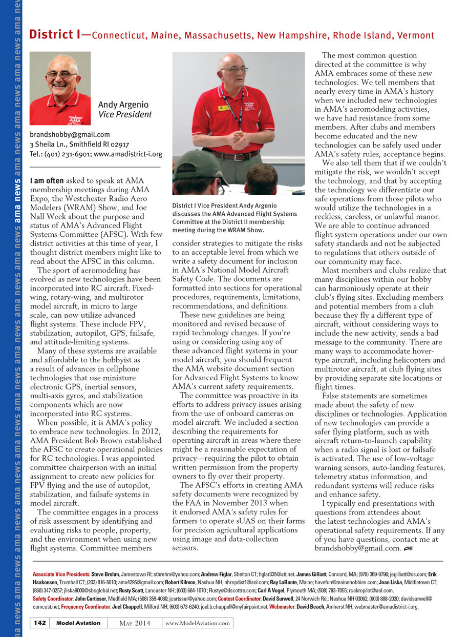 I am often asked to speak at AMA membership meetings during AMA Expo, the Westchester Radio Aero Modelers Show, and Joe Nall Week. The topic this year is the purpose and status of AMA’s Advanced Flight Systems Committee (AFSC). With few district activities at this time of year, I thought district members might like to read about the AFSC in this column.