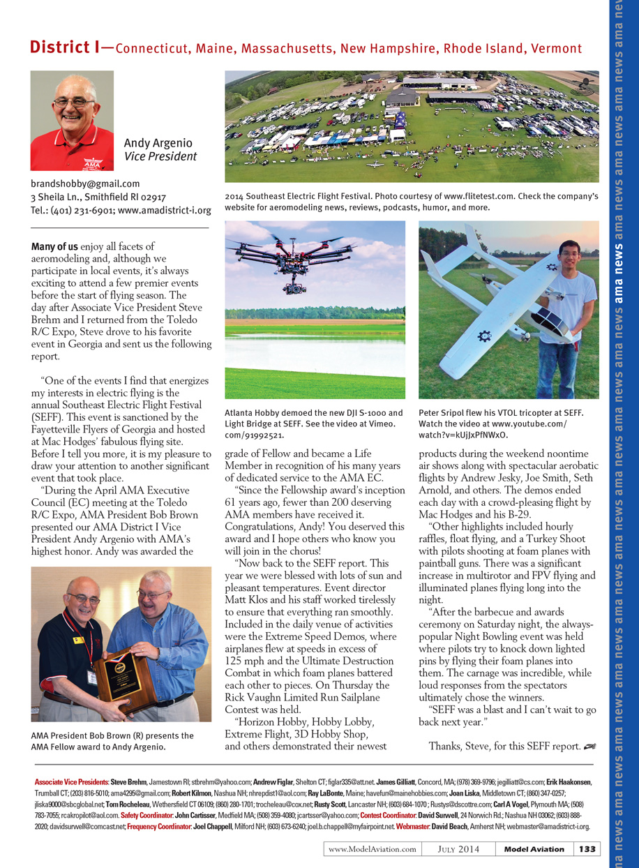 “During the April AMA Executive Council (EC) meeting at the Toledo R/C Expo, AMA President Bob Brown presented our AMA District I Vice President Andy Argenio with AMA’s highest honor. Andy was awarded the grade of Fellow and became a Life Member in recognition of his many years of dedicated service to the AMA EC.