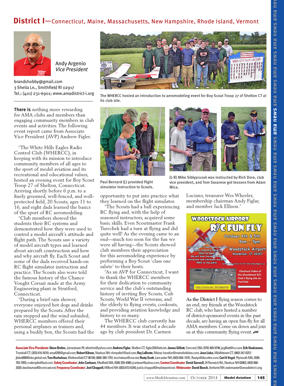“The White Hills Eagles Radio Control Club (WHERCC), in keeping with its mission to introduce community members of all ages to the sport of model aviation and its recreational and educational values, hosted an evening event for Boy Scout Troop 27 of Shelton, Connecticut. Arriving shortly before 6 p.m. to a finely groomed, well-fenced and well-protected field, about 20 Scouts, ages 11 to 16, and eight dads learned the basics of the sport of RC aeromodeling.