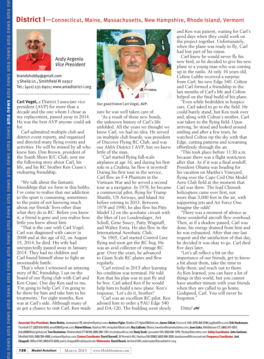 Carl Vogel, a District I associate vice president (AVP) for more than a decade and the one I chose as my replacement, passed away in 2014. He was the best AVP anyone could ask for.