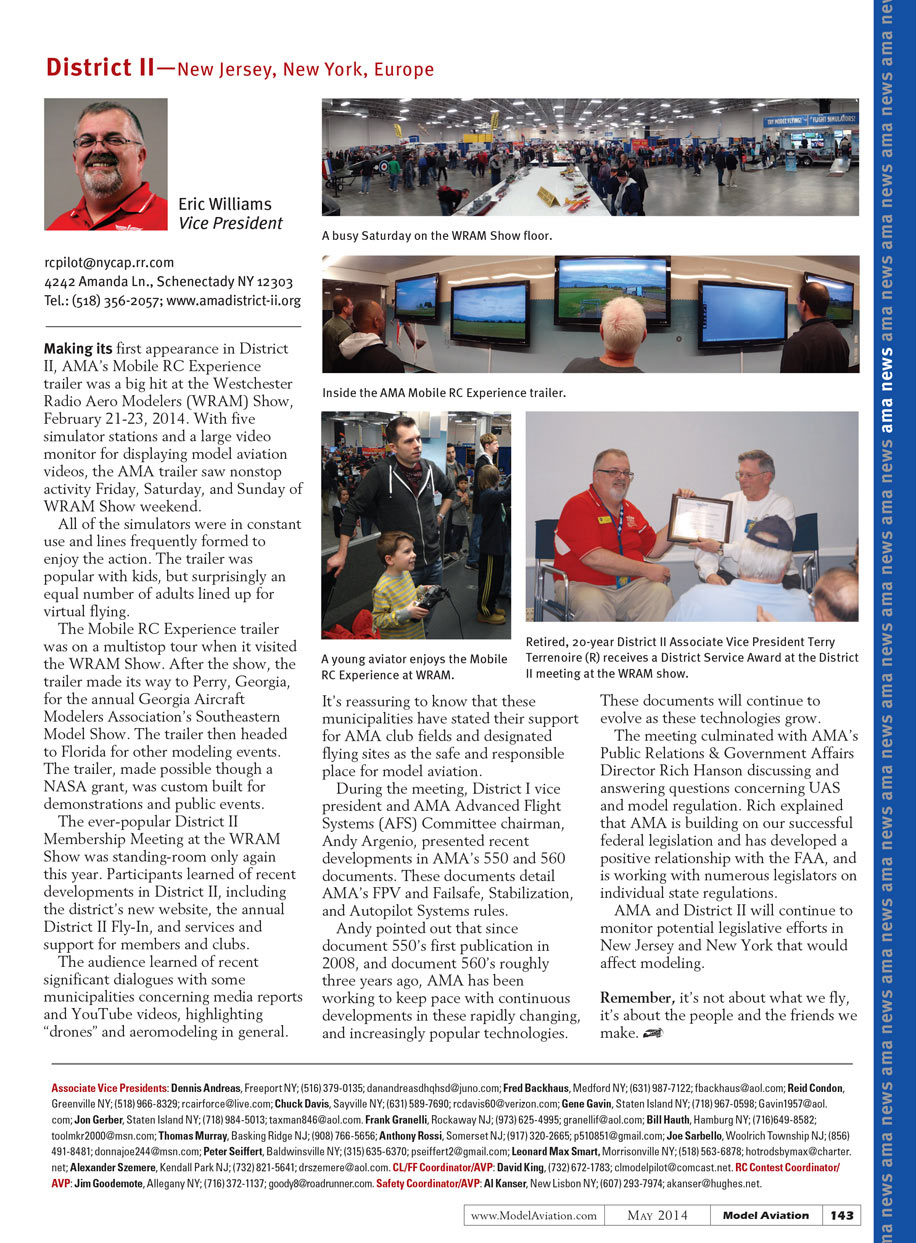 Making its first appearance in District II, AMA’s Mobile RC Experience trailer was a big hit at the Westchester Radio Aero Modelers (WRAM) Show, February 21-23, 2014. With five simulator stations and a large video monitor for displaying model aviation videos, the AMA trailer saw nonstop activity Friday, Saturday, and Sunday of WRAM Show weekend.