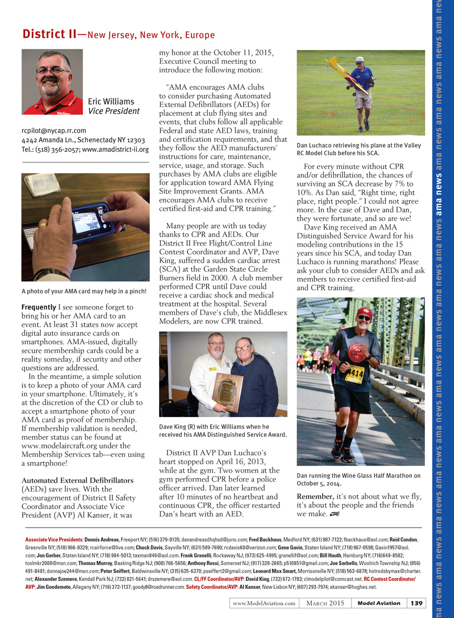 Dave received an AMA District Service Award for his modeling contributions in the 15 years since his SCA, and today Dan is racing marathons! Please ask your club to consider AEDs and ask members to receive certified first-aid and CPR training.