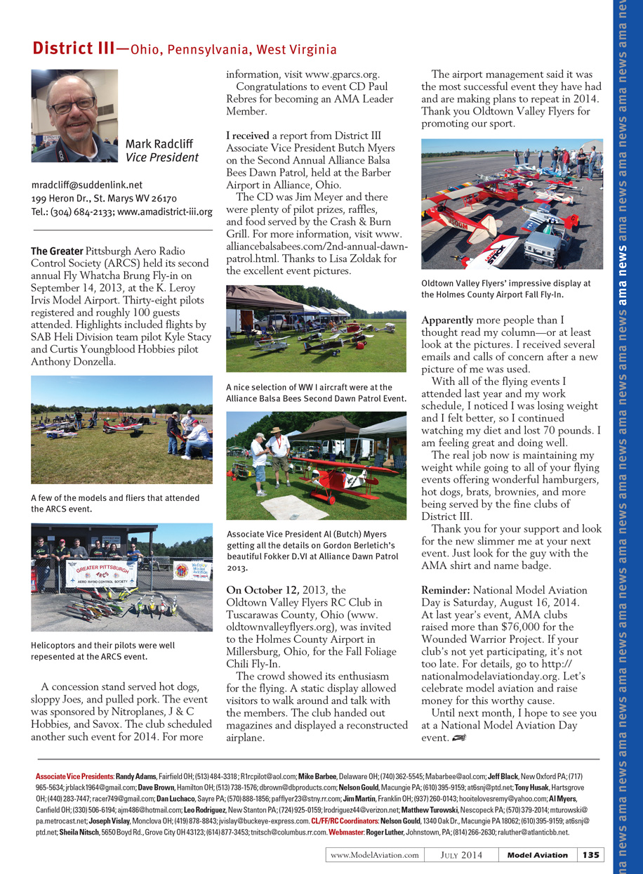 I received a report from District III Associate Vice President Butch Myers on the Second Annual Alliance Balsa Bees Dawn Patrol, held at the Barber Airport in Alliance, Ohio.