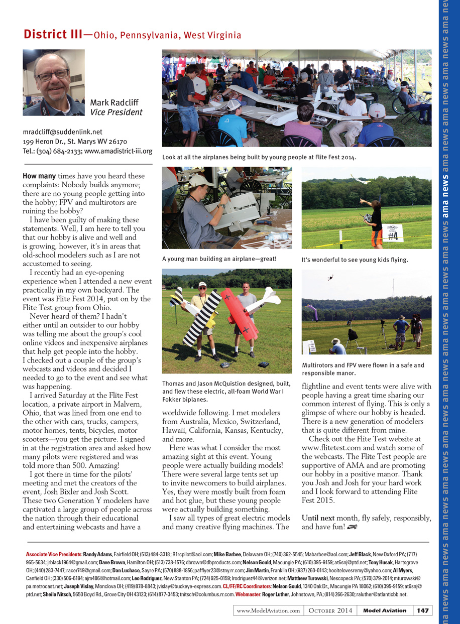 Check out the Flite Test website at www.flitetest.com and watch some of the webcasts. The Flite Test people are very supportive of AMA and are promoting our hobby in a positive manor. Thank you Josh and Josh for your hard work and I am looking forward to attending Flite Fest 2015.