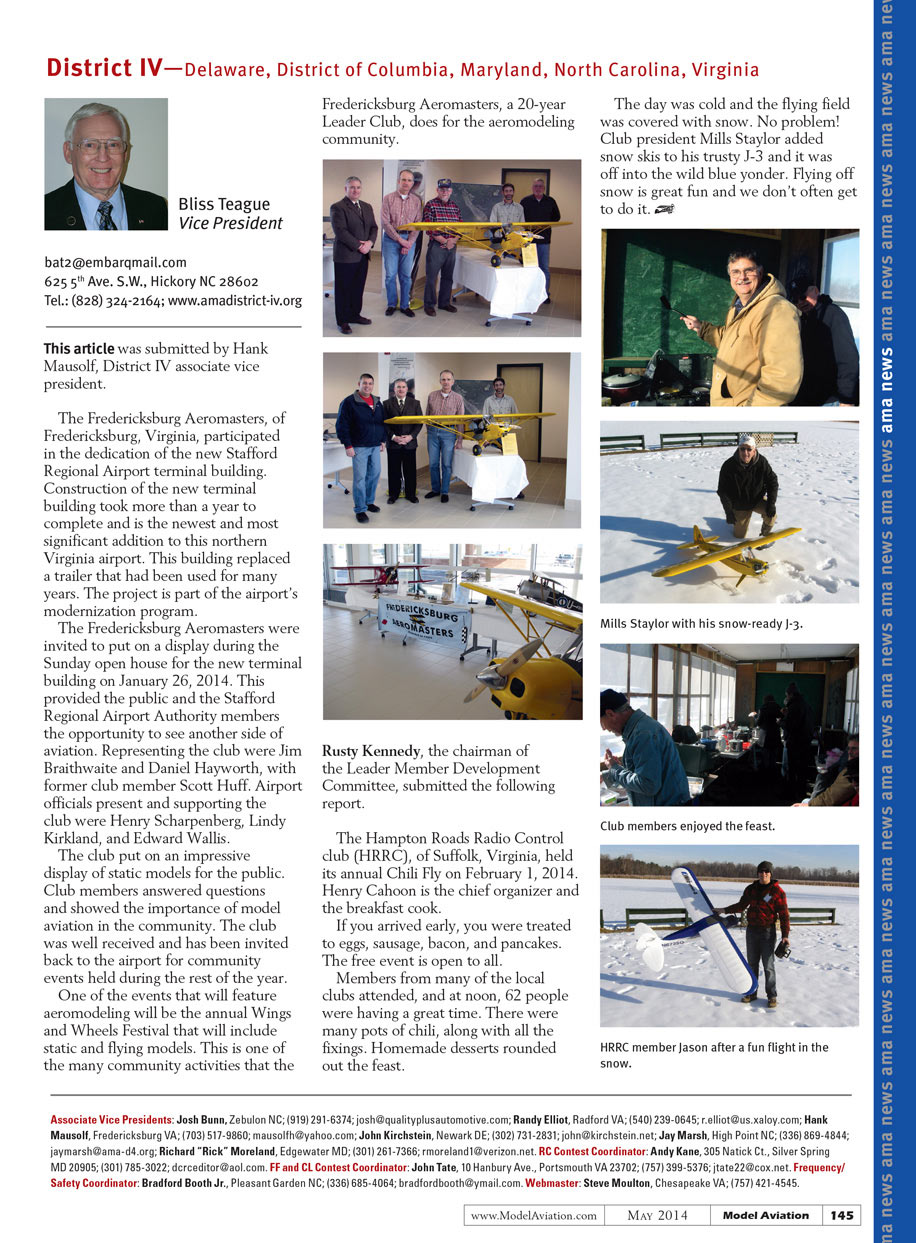 One of the events that will feature aeromodeling will be the annual Wings and Wheels Festival that will include static and flying models. This is one of the many community activities that the Fredericksburg Aeromasters, a 20-year Leader Club, does for the aeromodeling community.