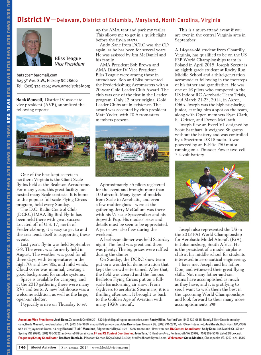 AMA President Bob Brown, AMA District IV Vice President Bliss Teague, and Hank Mausolf were among those in attendance. Bob and Bliss presented the Fredericksburg Aeromasters with a 20-year Gold Leader Club Award. The club was one of the first in the Leader program. Only 12 other original Gold Leader Clubs are in existence. The award was accepted by club president Matt Yoder, with 20 Aeromasters members present.