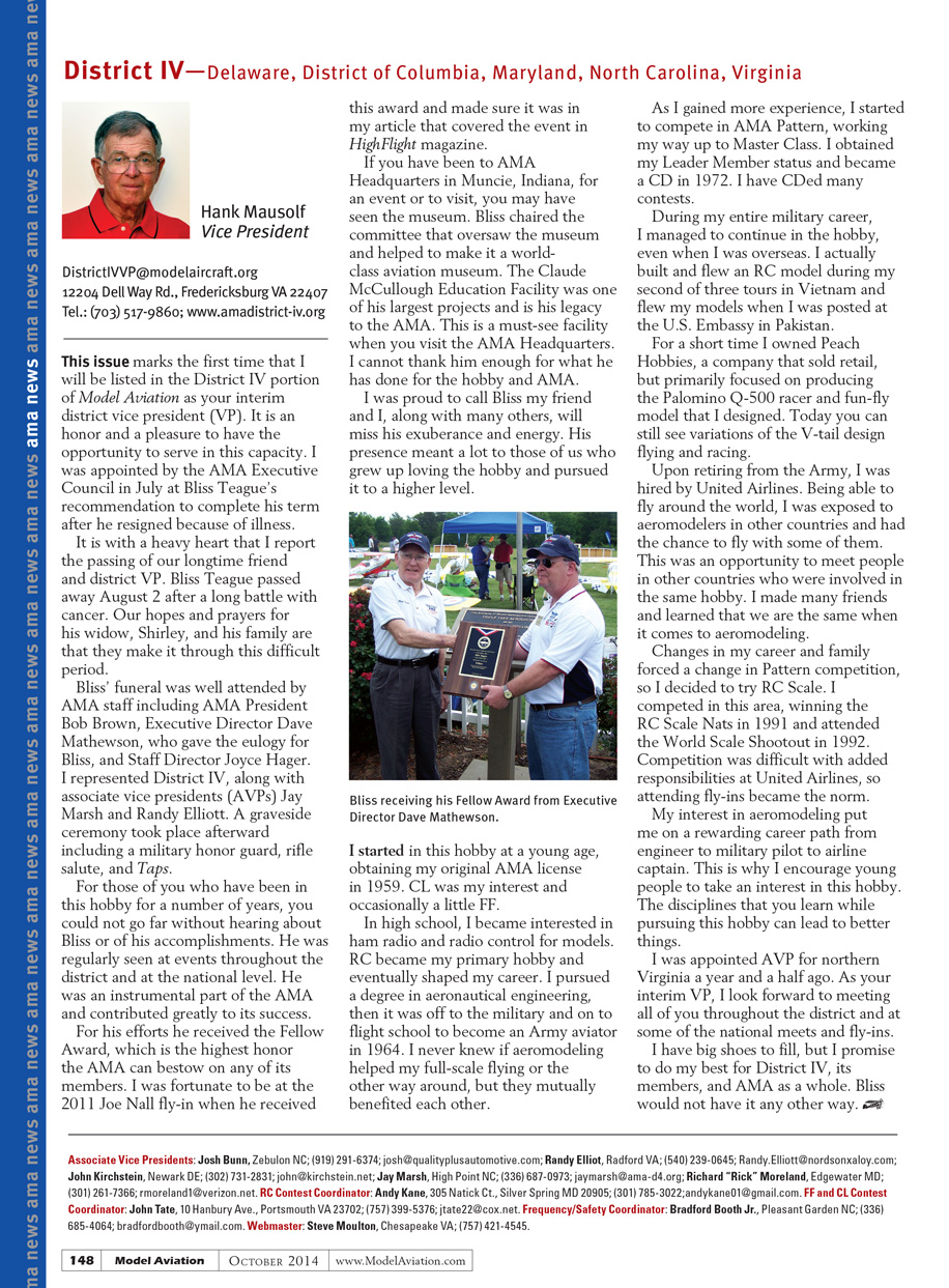 This issue marks the first time that I will be listed in the District IV portion of Model Aviation as your district vice president (VP). It is an honor and a pleasure to have the opportunity to serve in this capacity. I was appointed by the AMA Executive Council in July on Bliss Teague’s recommendation to complete his term after he resigned because of illness.