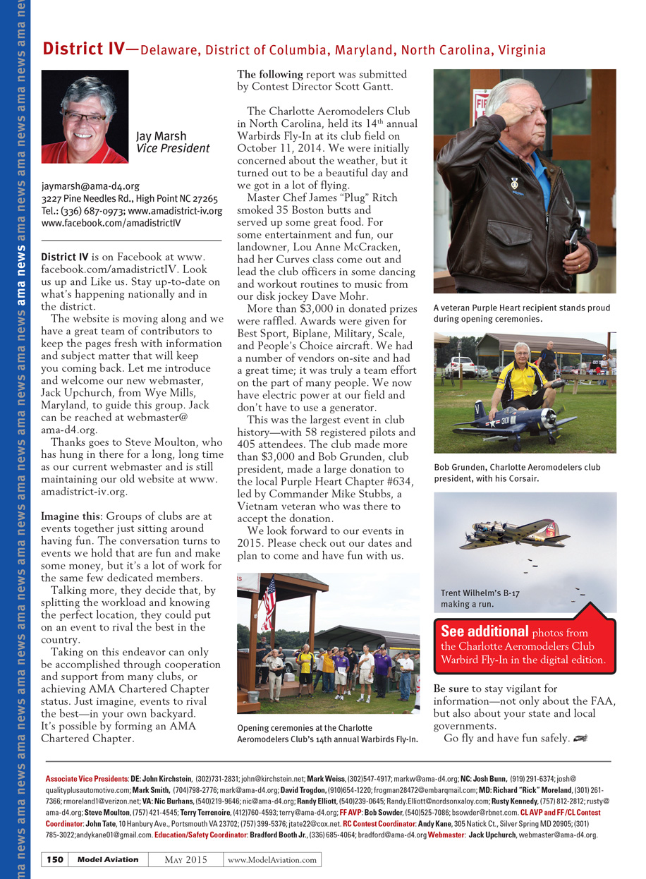 The website is moving along and we have a great team of contributors to keep the pages fresh with information and subject matter that will keep you coming back. Let me introduce and welcome our new webmaster, Jack Upchurch, from Wye Mills, Maryland, to guide this group. Jack can be reached at webmaster@ama-d4.org.