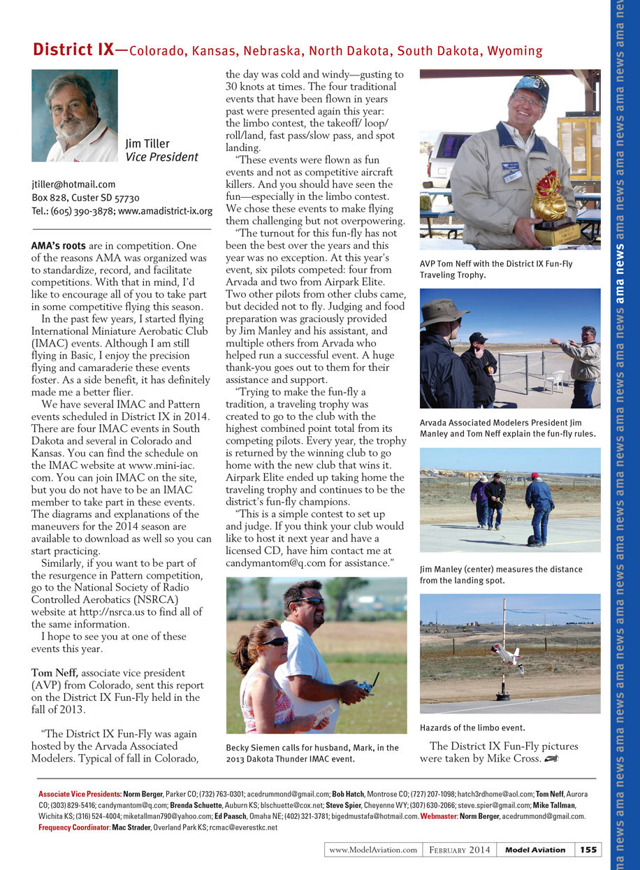 We have several IMAC and pattern events scheduled in District IX in 2014. There are four IMAC events in South Dakota and several in Colorado and Kansas. You can find the schedule on the IMAC website at www.mini-iac.com. You can join IMAC on the site, but you do not have to be an IMAC member to take part in these events. The diagrams and explanations of the maneuvers for the 2014 season are available to download as well so you can start practicing.