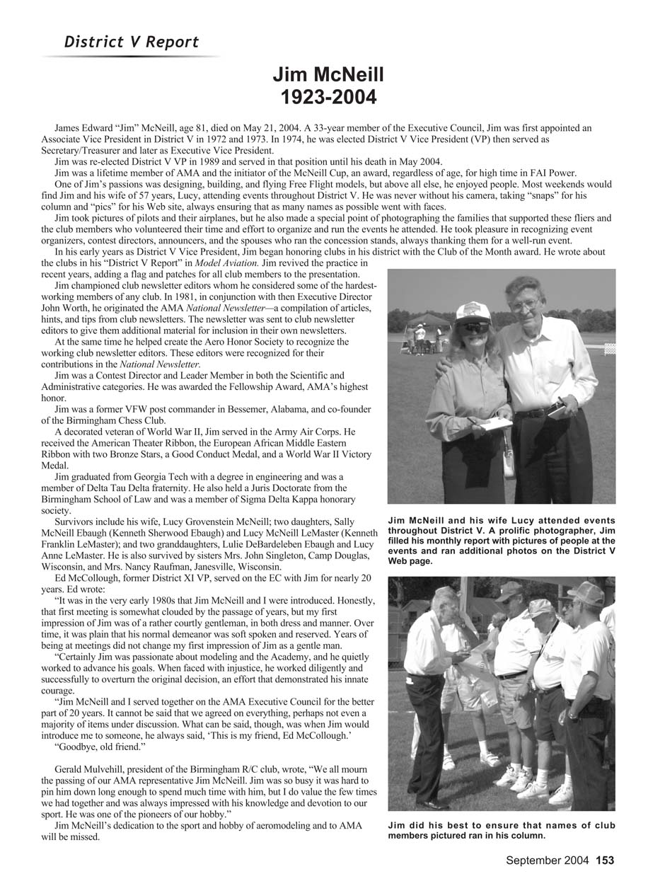 Jim was a lifetime member of AMA and the initiator of the McNeill Cup, an award, regardless of age, for high time in FAI Power.