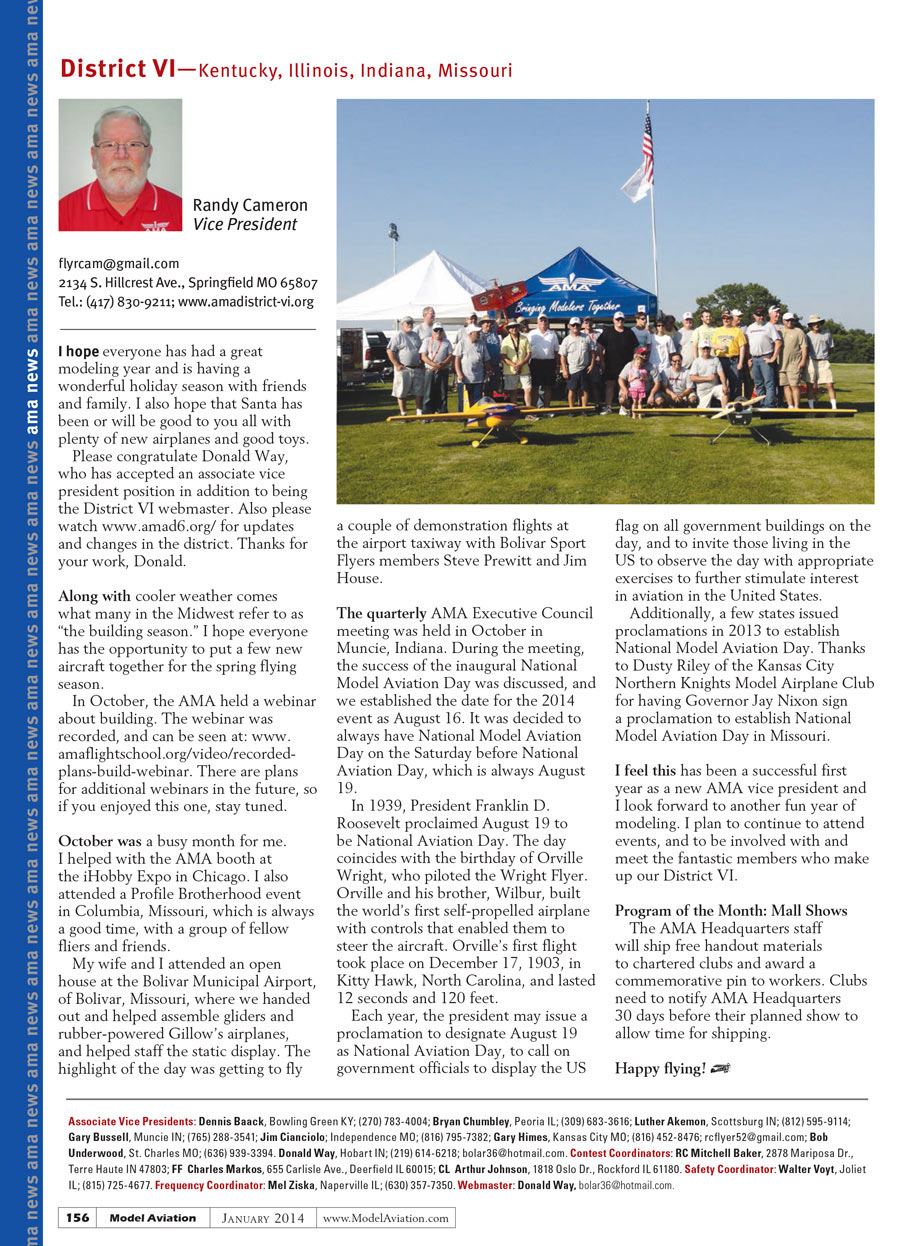 I feel this has been a successful first year as a new AMA vice president and I look forward to another fun year of modeling. I plan to continue to attend events, and to be involved with and meet the fantastic members who make up our District VI.