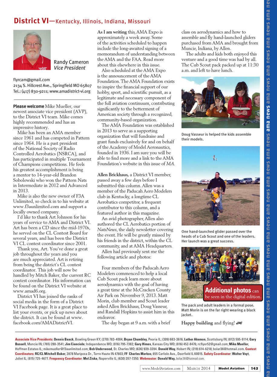Allen Brickhaus, a District VI AVP, passed away a few days before I submitted this column. Allen was a member of the Paducah Aero Modelers club in Kentucky, a longtime CL Aerobatics competitor, a frequent contributor to this column, and a featured author in this magazine.