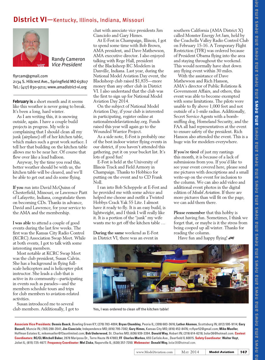 At E-Fest in Champaign, Illinois, I got to spend some time with Bob Brown, AMA president, and Dave Mathewson, AMA executive director. I also enjoyed talking to Rege Hall, president of the Blacksheep RC Modelers in Danville, Indiana. Last year, during the National Model Aviation Day event, the Blacksheep club raised $1,835, more money than any other club in District VI. I also understand the club was the first club to sign up for National Model Aviation Day in 2014.