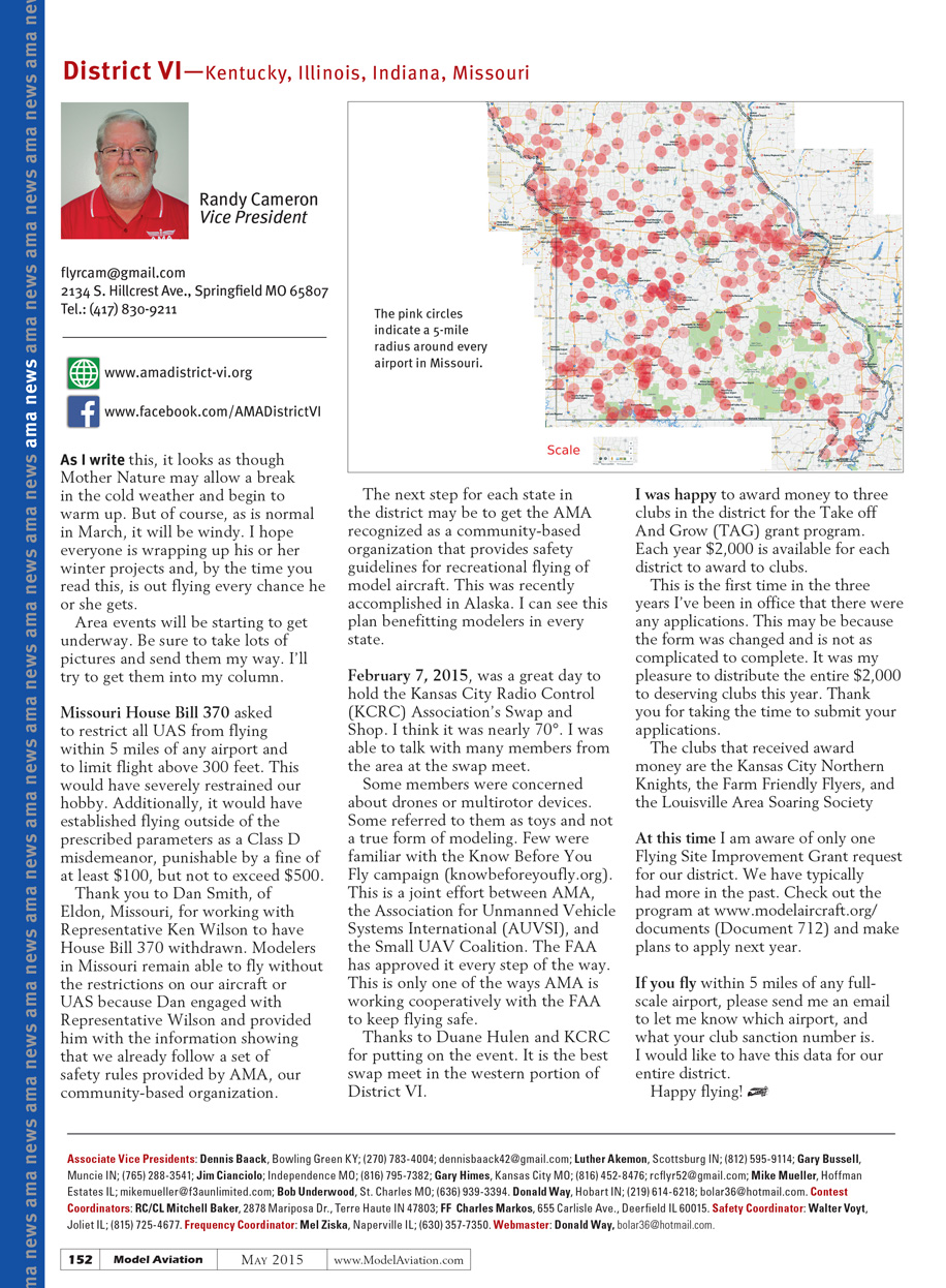 Thank you to Dan Smith, of Eldon, Missouri, for working with Representative Ken Wilson to have House Bill 370 withdrawn. Modelers in Missouri remain able to fly without the restrictions on our aircraft or UAS because Dan engaged with Representative Wilson and provided him with the information showing that we already follow a set of safety rules provided by our community-based organization.