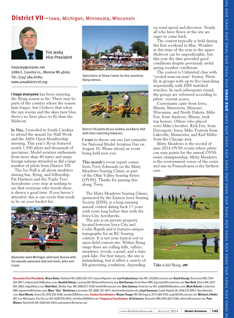 In May, I traveled to South Carolina to attend the annual Joe Nall Week and the AMA Open Membership meeting. This year’s fly-in featured nearly 1,500 pilots and thousands of spectators. Model aviation enthusiasts from more than 40 states and many foreign nations attended as did a large number of pilots from District VII.