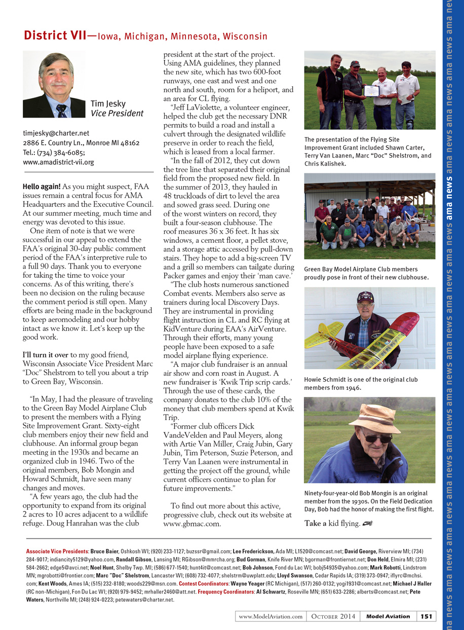 “In May, I had the pleasure of traveling to the Green Bay Model Airplane Club to present the members with a Flying Site Improvement Grant. Sixty-eight club members enjoy their new field and clubhouse. An informal group began meeting in the 1930s and became an organized club in 1946. Two of the original members, Bob Mongin and Howard Schmidt, have seen many changes and moves.
