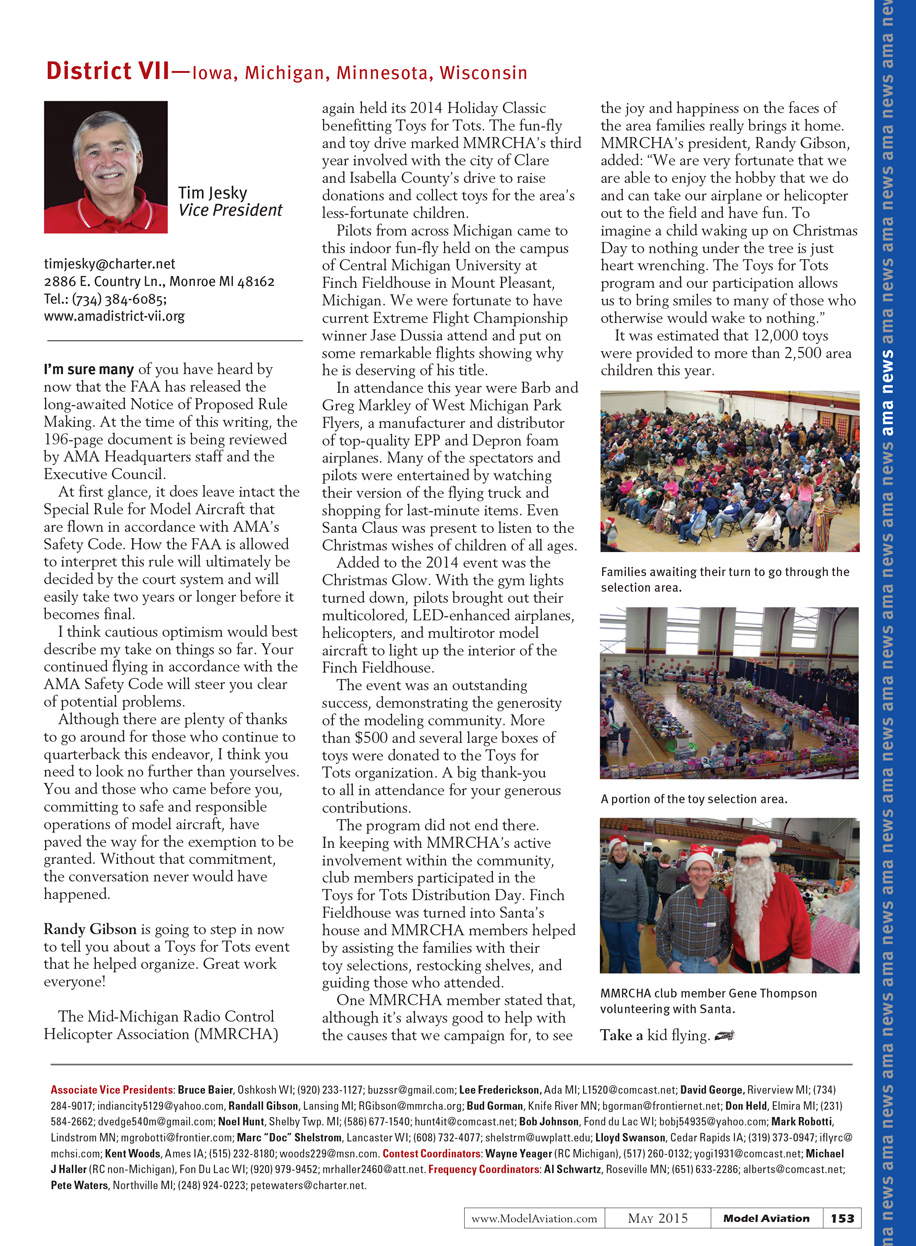 The Mid-Michigan Radio Control Helicopter Association (MMRCHA) again held its 2014 Holiday Classic benefitting Toys for Tots. The fun-fly and toy drive marked MMRCHA’s third year involved with the city of Clare and Isabella County’s drive to raise donations and toys for the area’s less fortunate children.