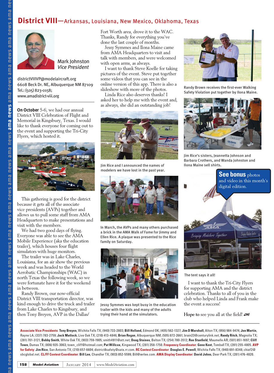 Lastly, I want to thank the Tri-City Flyers for supporting AMA and the district celebration. Thanks to all of you in the club who helped Linda and Frank make the event a success!