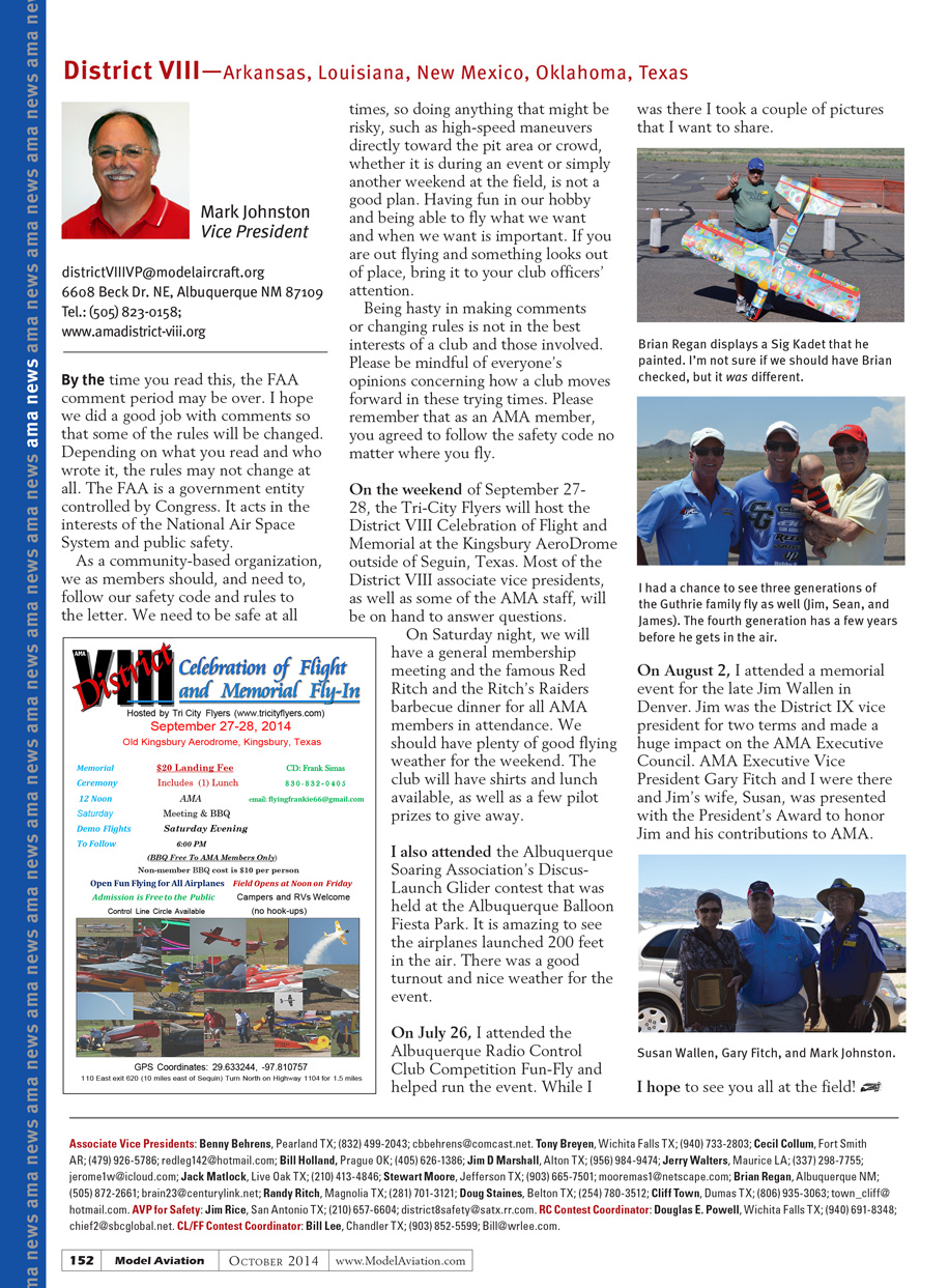 On the weekend of September 27-28, the Tri City Flyers will host the District VIII Celebration of Flight and Memorial at the Kingsbury AeroDrome outside of Seguin, Texas. Most of the District VIII associate vice presidents as well as some of the AMA staff will be on hand to answer questions.