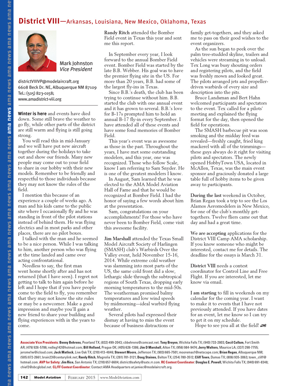 District VIII needs a contest coordinator for Control Line and Free Flight. If you are interested, let me know via email.