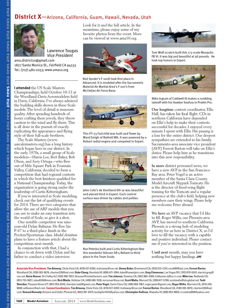 In more district personnel news, we have a new AVP in the San Francisco Bay area. Peter Vogel is an active member of the Santa Clara County Model Aircraft Skypark Tomcats. He is the director of fixed-wing flight training for the Tomcats and a regular presence at the club’s field, helping new members earn their wings. Please help me welcome Peter aboard.