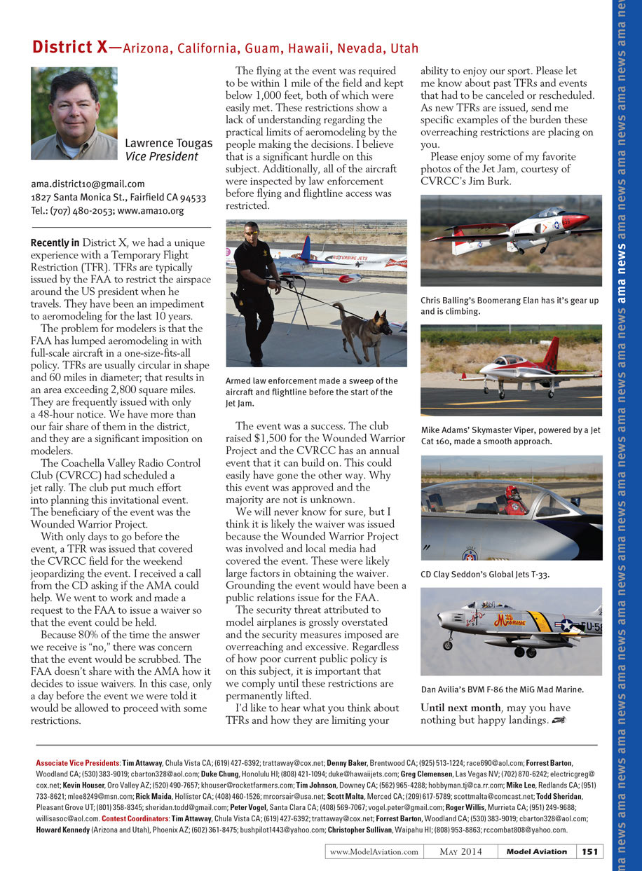 Recently in District X, we had a unique experience with a Temporary Flight Restriction (TFR). TFRs are typically issued by the FAA to restrict the airspace around the US President when he travels. They have been an impediment to aeromodeling for the last 10 years.